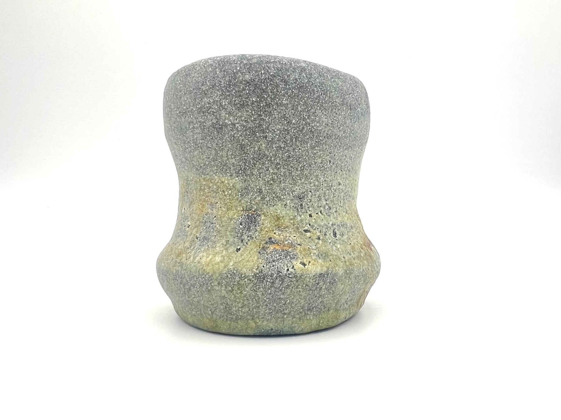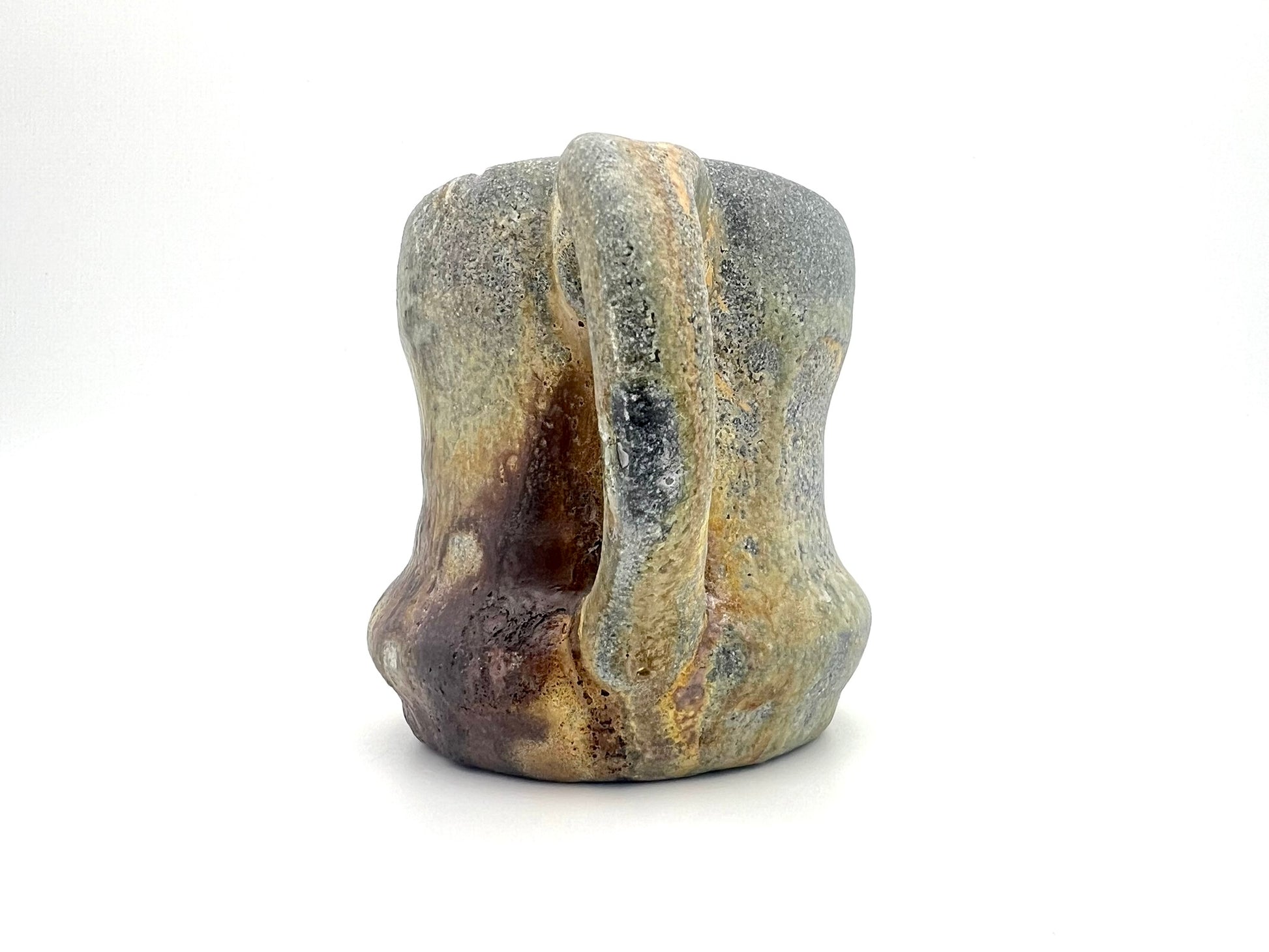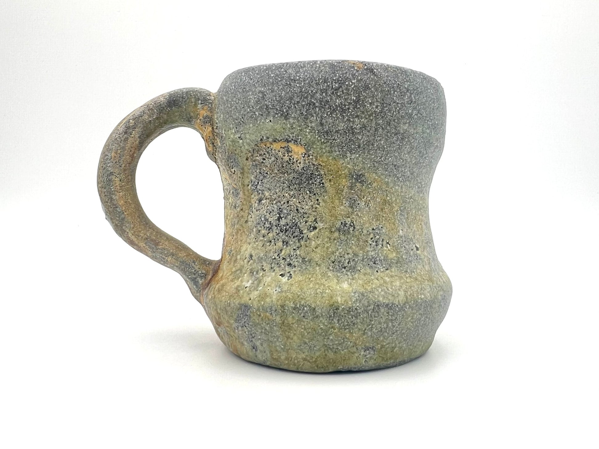 This smaller mug was thrown on the potters wheel. It is made of Newcomb Tile Mix clay with an ungodly amount of ceramic rutile wedged in. It was dipped in EPK slip and lined with Penn State Shino. This was reduction cooled in the old Chicken Cat wood/soda kiln. The mug measures 3 inches wide by 3.25 inches tall.