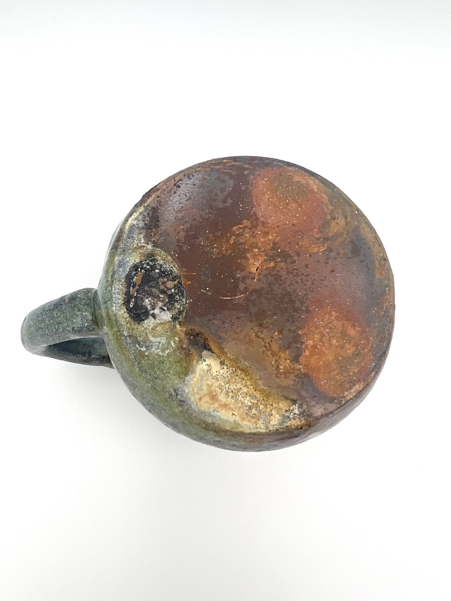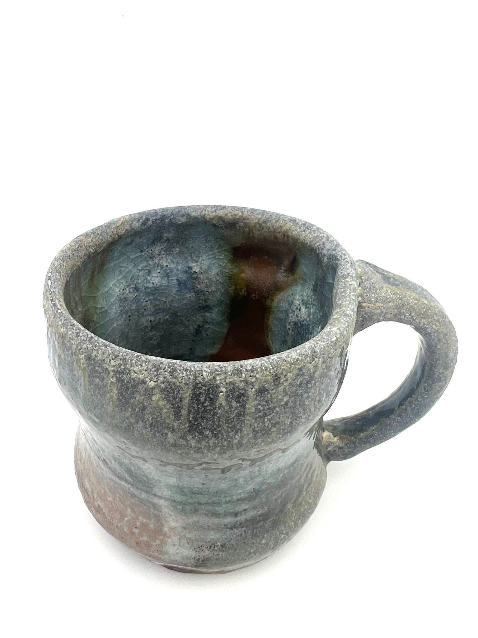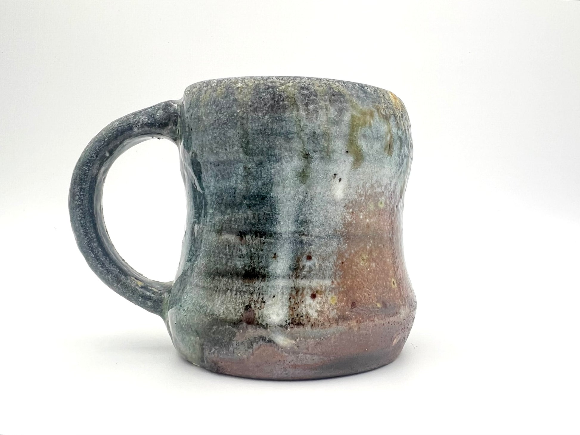 This smaller mug was thrown on the potters wheel. It is made of Newcomb Tile Mix clay with an ungodly amount of ceramic rutile wedged in. It was dipped in EPK slip and lined with Penn State Shino. This was reduction cooled in the old Chicken Cat wood/soda kiln. The mug measures 3.25 inches wide by 3.25 inches tall.