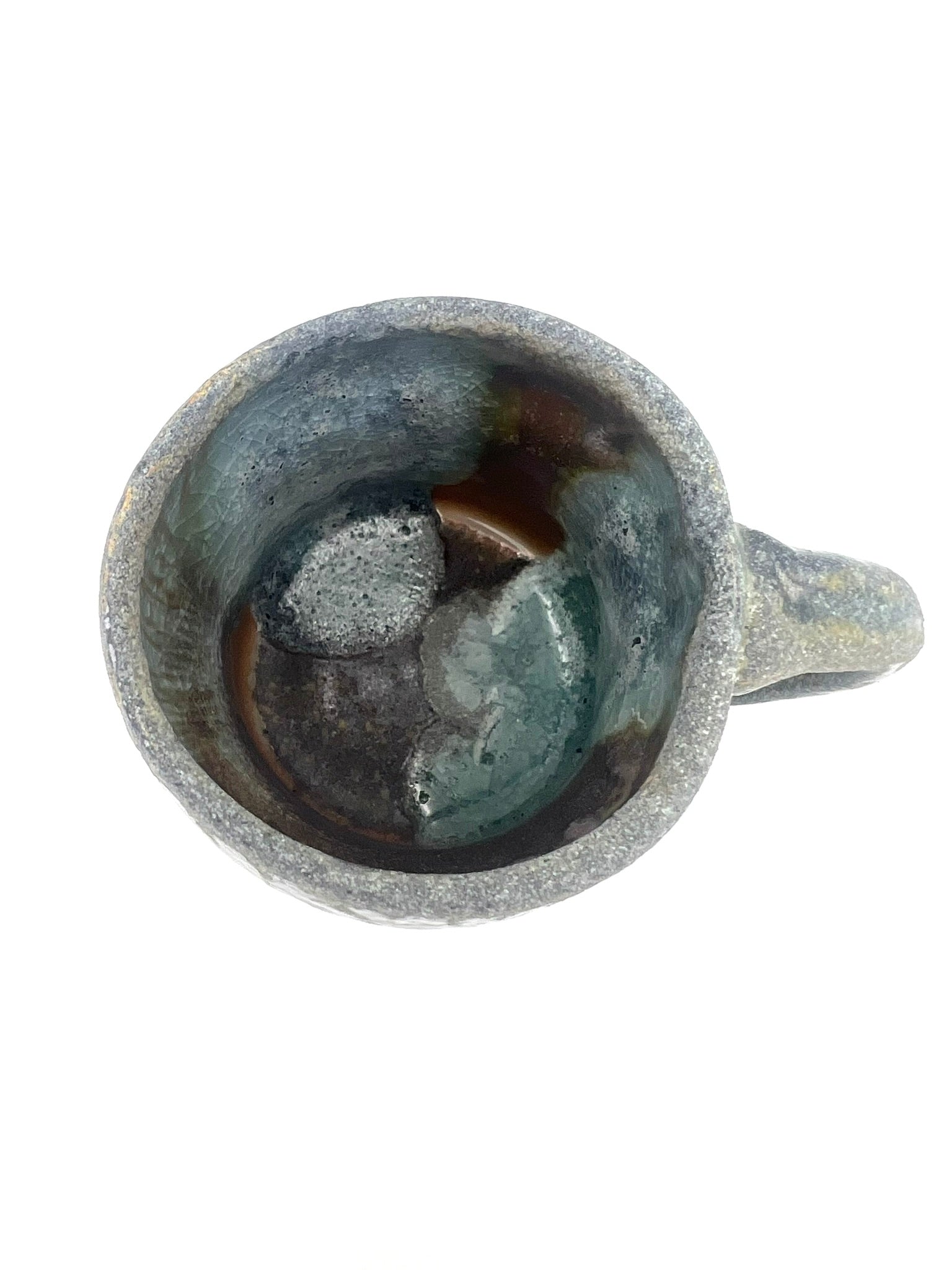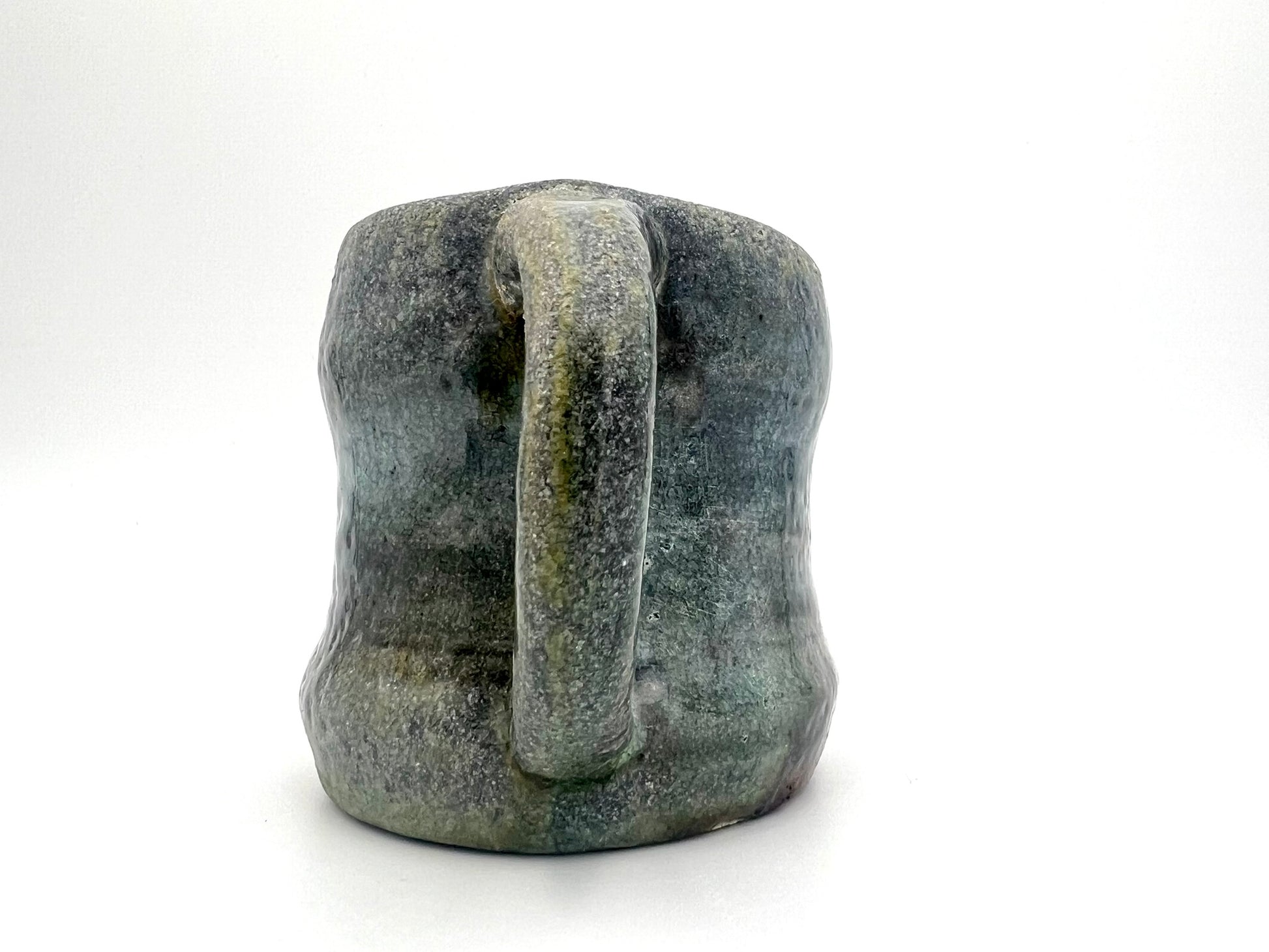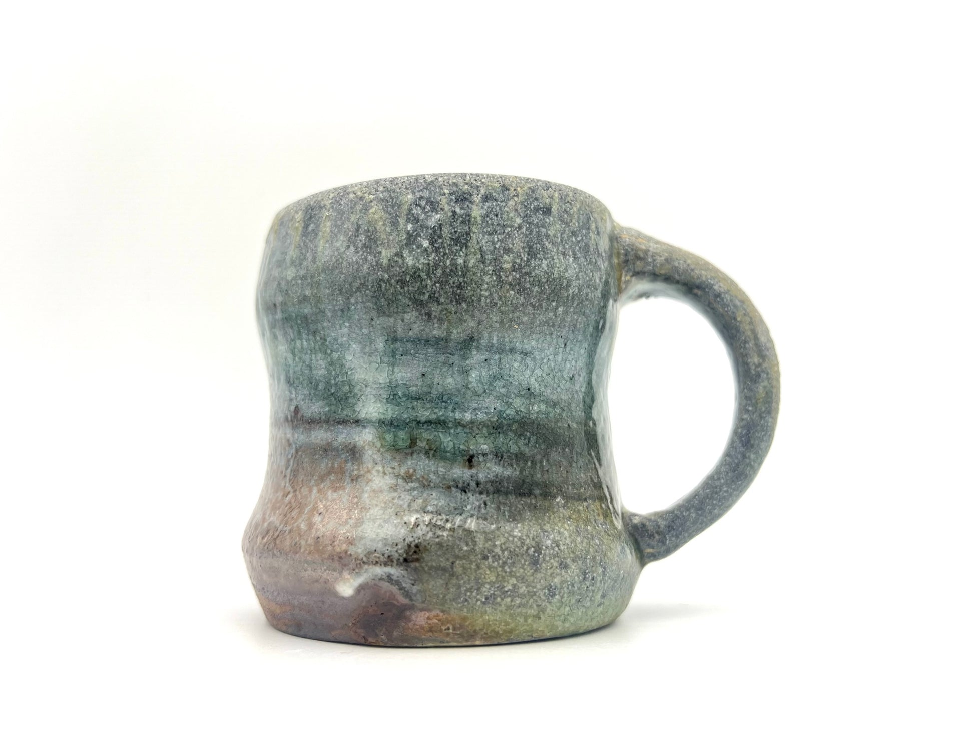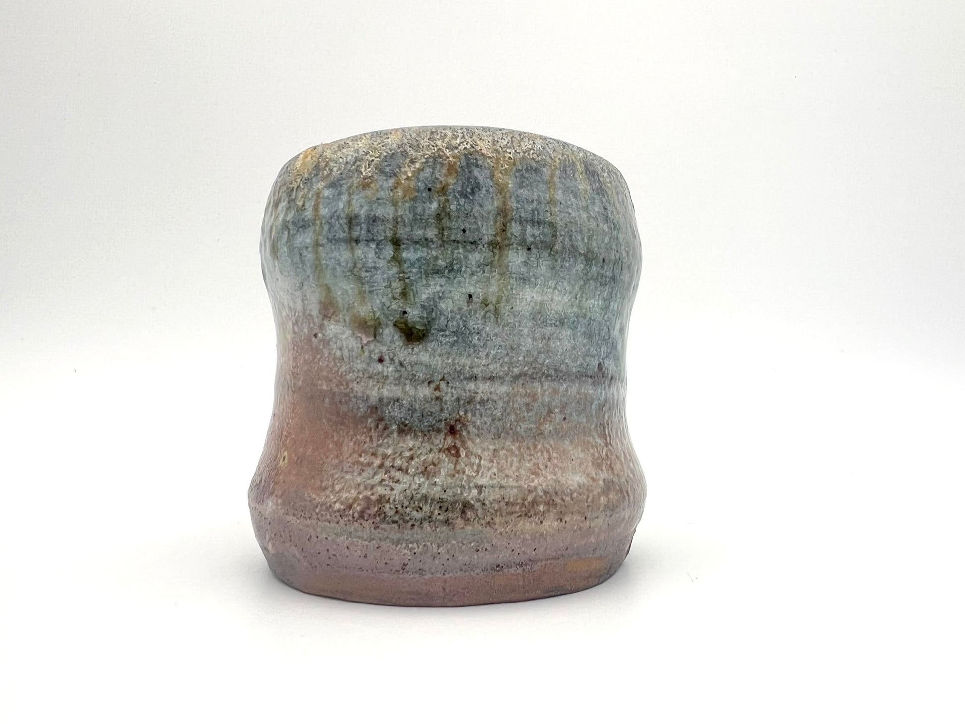 This smaller mug was thrown on the potters wheel. It is made of Newcomb Tile Mix clay with an ungodly amount of ceramic rutile wedged in. It was dipped in EPK slip and lined with Penn State Shino. This was reduction cooled in the old Chicken Cat wood/soda kiln. The mug measures 3.25 inches wide by 3.25 inches tall.