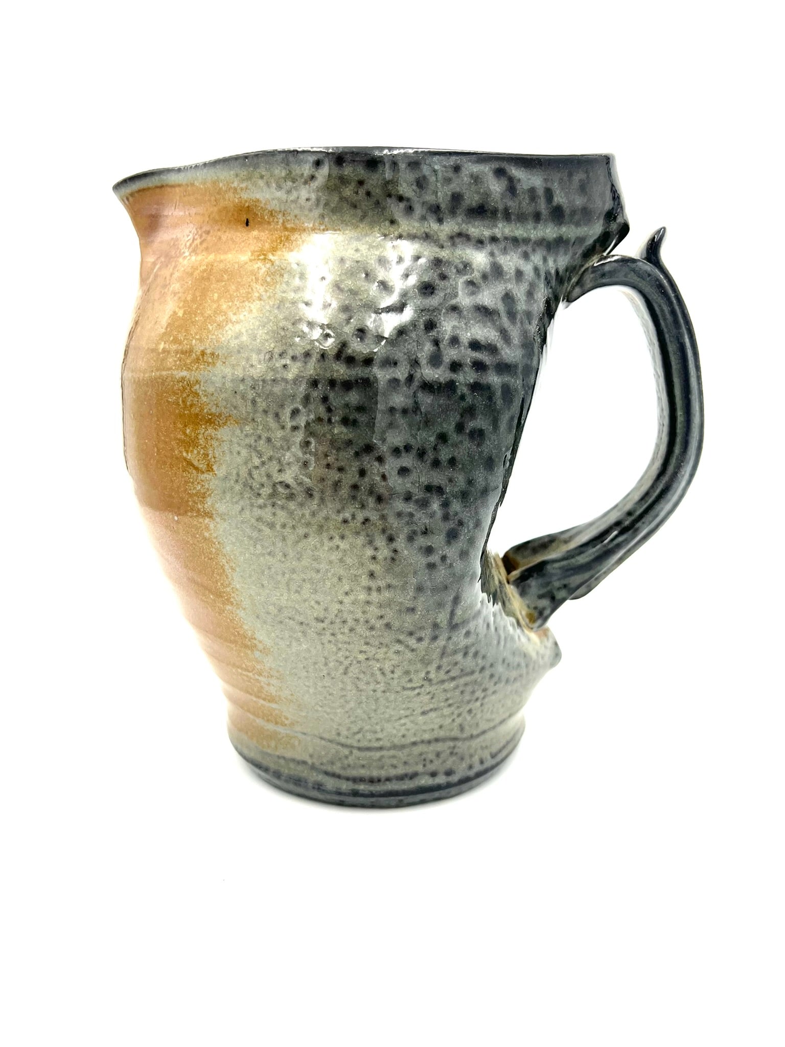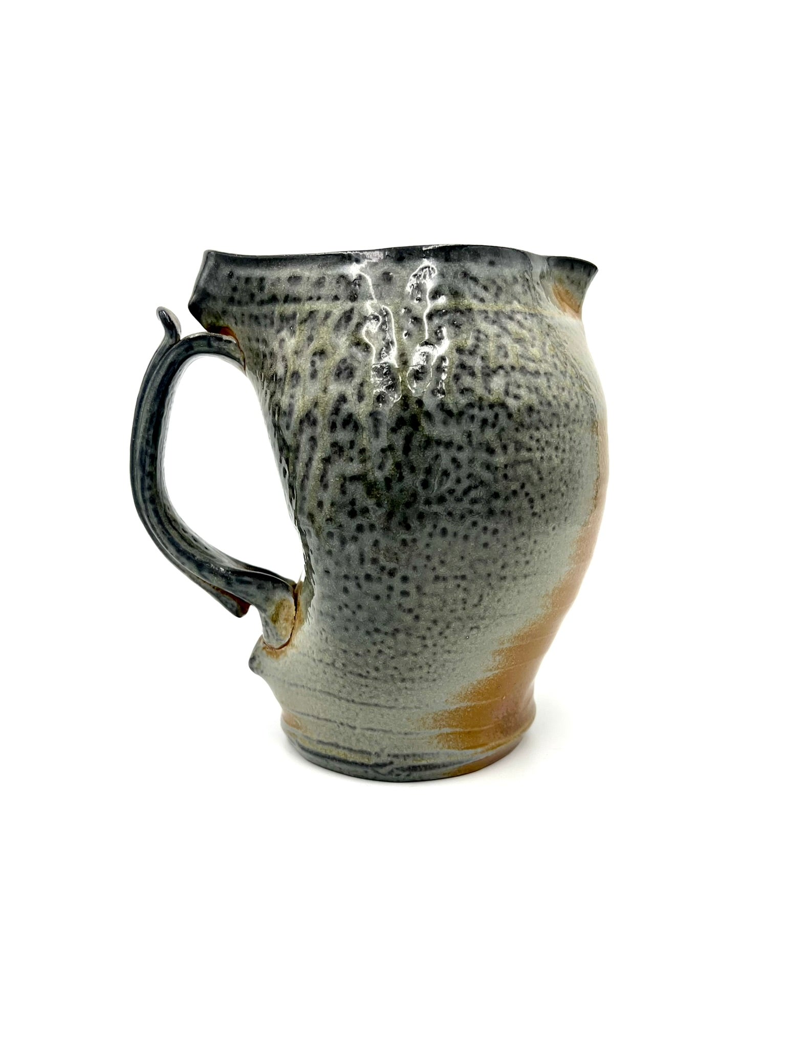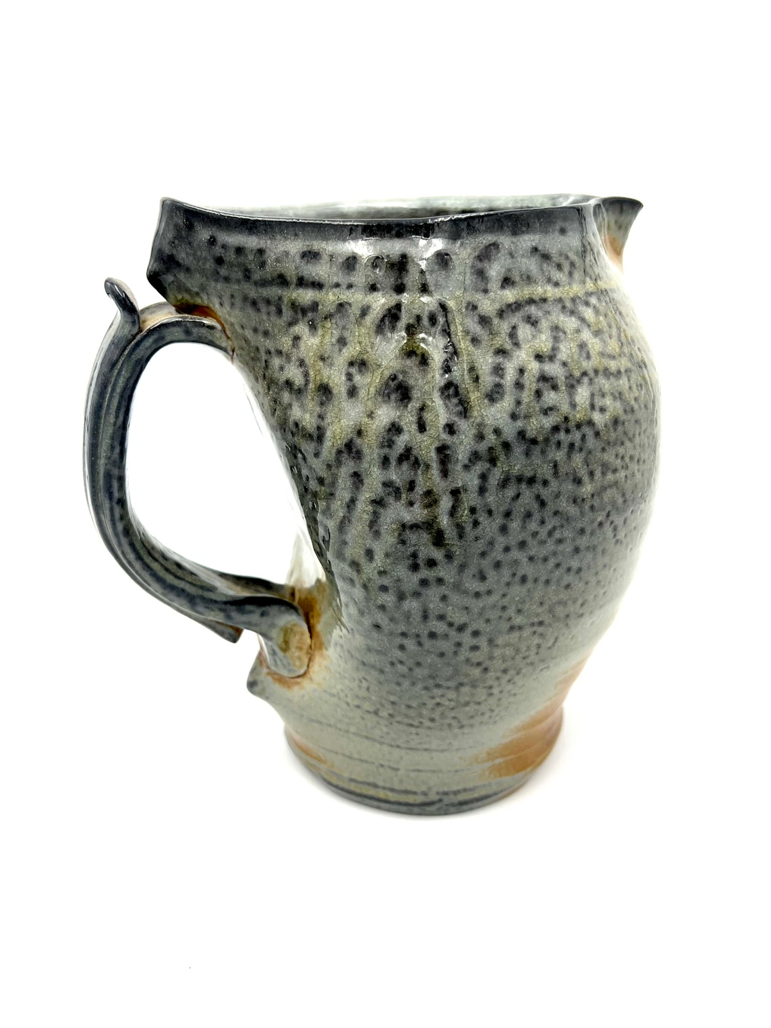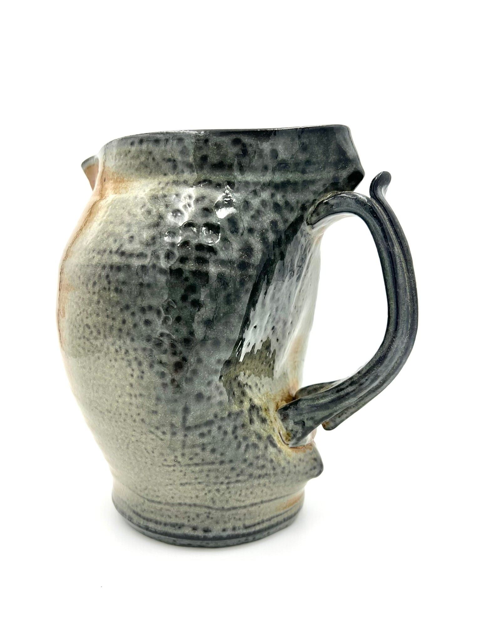 I threw, darted, and handled this pitcher on the wheel of Coleman Porcelain. It was fired for 30+ hours in a wood/soda kiln. I intended for the handle to appear as if it were a bone or a twig holding open the mouth of an alligator snapping turtle. This piece measures around 7 inches tall, and 7 inches wide with the handle.