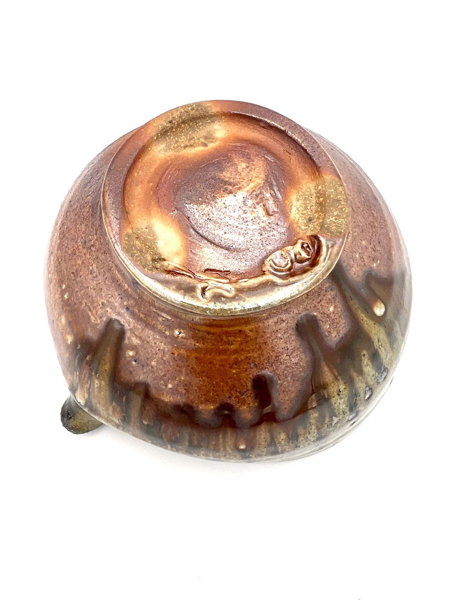 This batter bowl was thrown on the potters wheel of Newcomb Tile Mix with an ungodly amount of ceramic rutile wedged into its body. It is lined with Penn State Shino. Somewhere with direct effect from the firebox of a catenary wood/soda kiln this bowl was fired to cone 12. The heat and atmosphere allowed the rutile to burst forth and gush down the sides of this one of a kind piece. It measures 6.5 inches at its widest, and 3+ inches tall.
