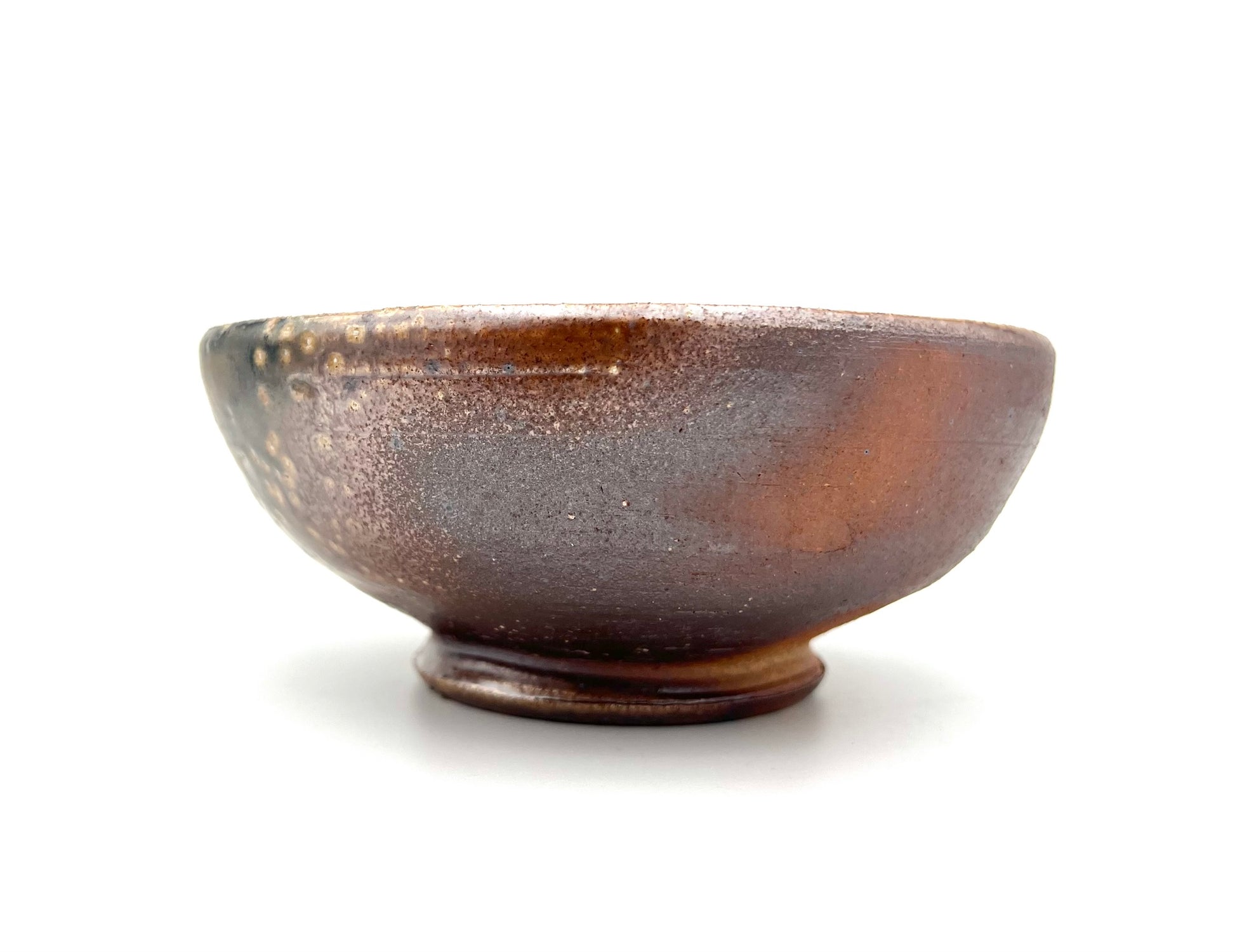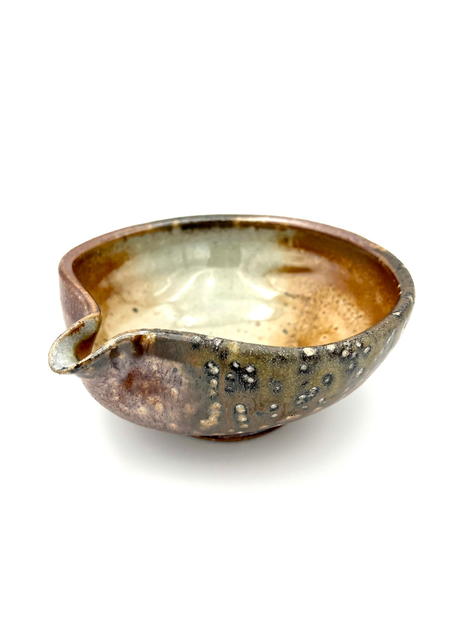 This batter bowl was thrown on the potters wheel of Newcomb Tile Mix with ceramic rutile wedged into its body. It is lined with Penn State Shino and fired to cone 12. The aggregate I added to this pouring bowl really shows on its more ash inundated side. The molochite and 30 mesh sand resist the accumulation of said ash and show galactic. It measures 6.5 inches at its widest, and 2.5 inches tall.