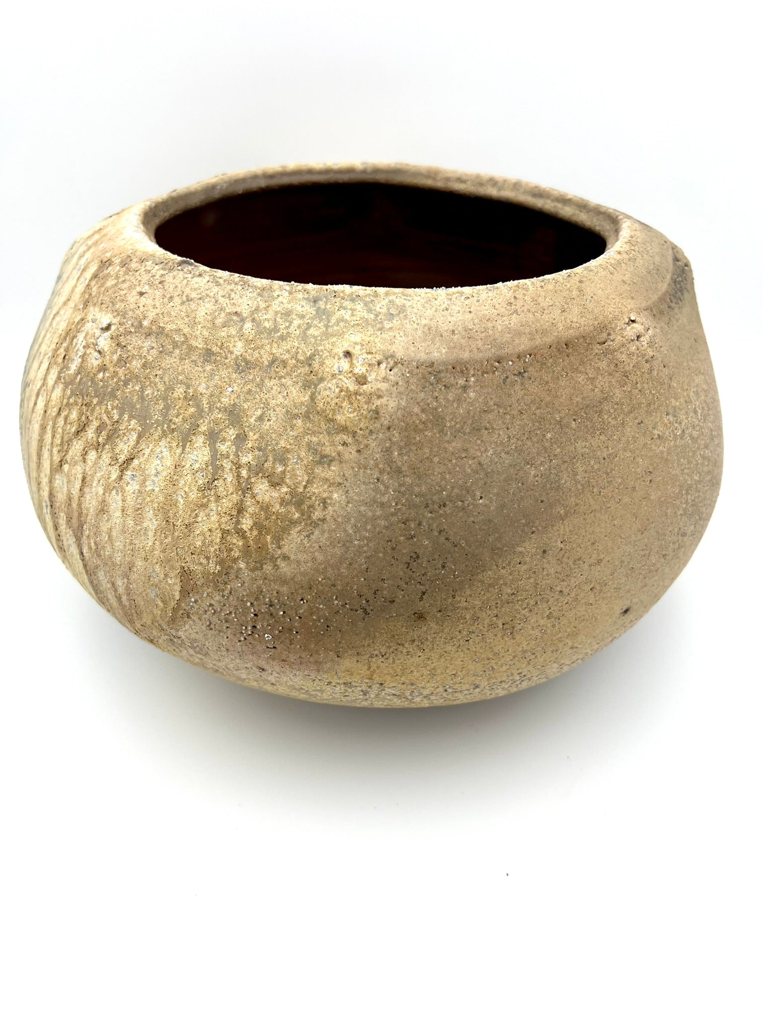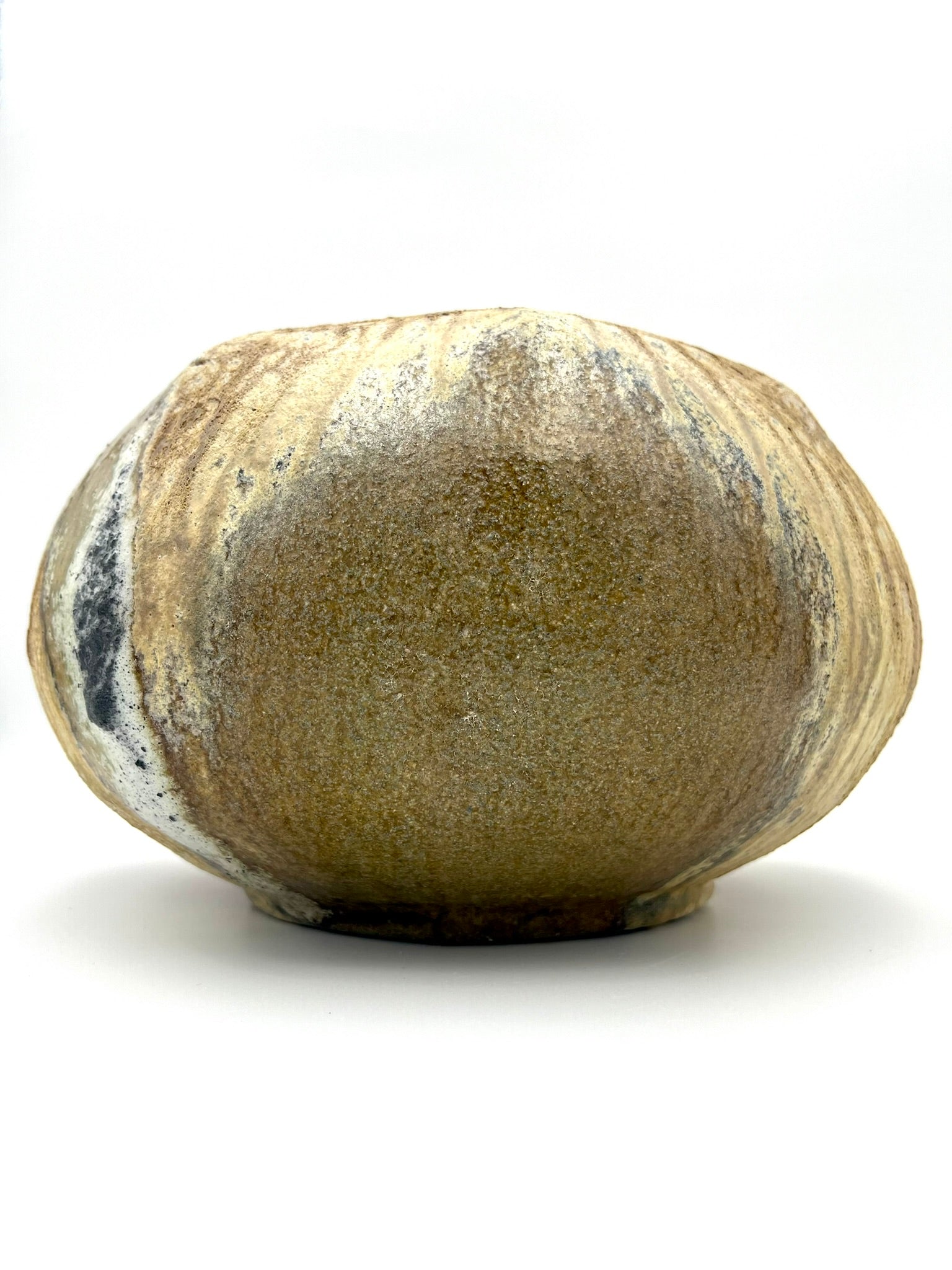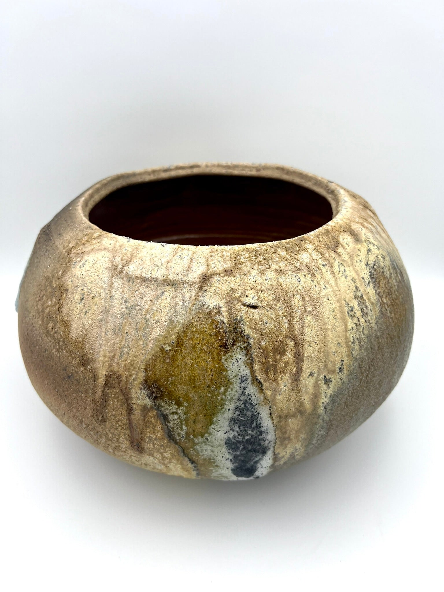 This large moon shape was thrown and altered on the potters wheel. The clay is Bedrock from Clay Art Center Tacoma. I wedged a lot of Ceramic Rutile into the clay body itself. Its amazing how the clay let loose right behind the Bagwall in the old Chicken Cat Wood/Soda kiln at East Creek. The moon measures 7 inches tall & 13 inches wide.