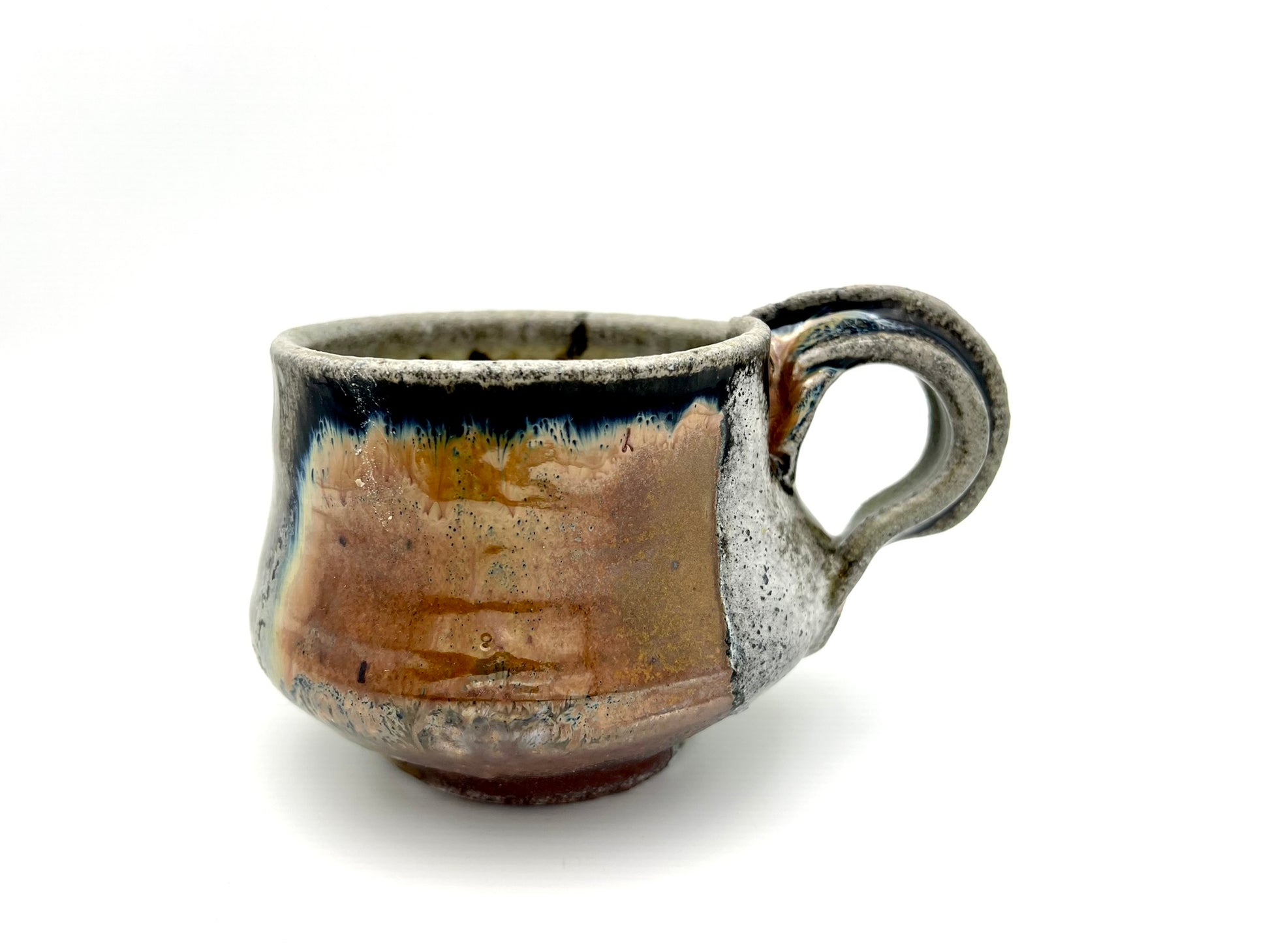 Thrown on the potters wheel/ pulled & sculpted handle. woodfired and drenched in soda. Rutile EPK slip on Stoneware Grog clay.
