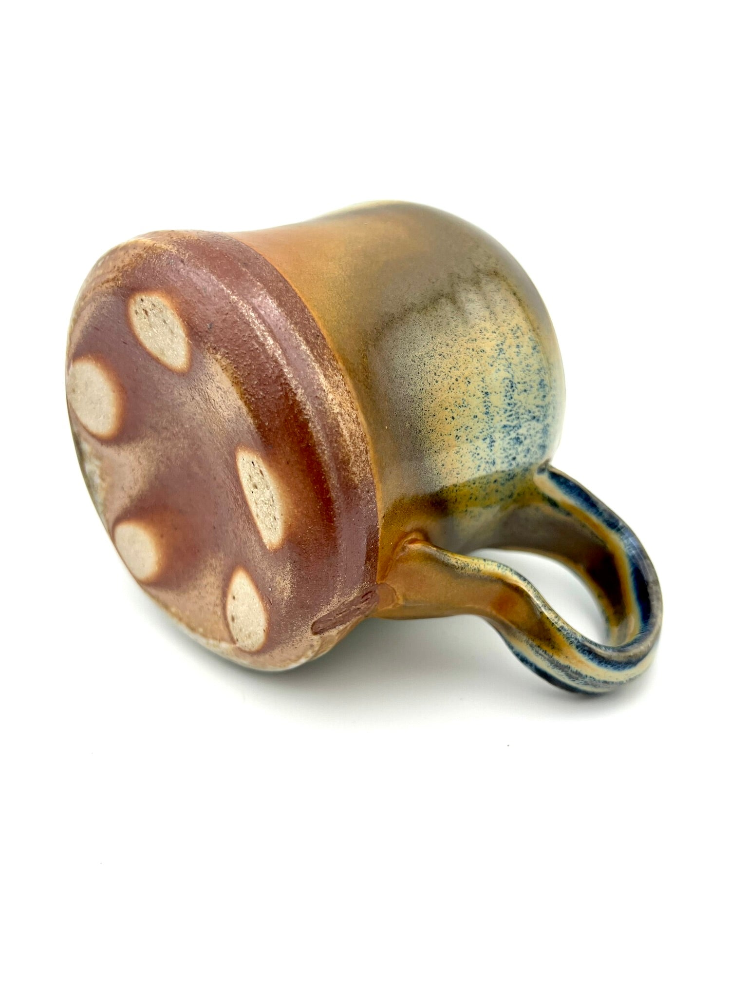 Thrown on the potters wheel/ pulled & sculpted handle. woodfired and drenched in soda. Rutile EPK slip on Welmar clay.