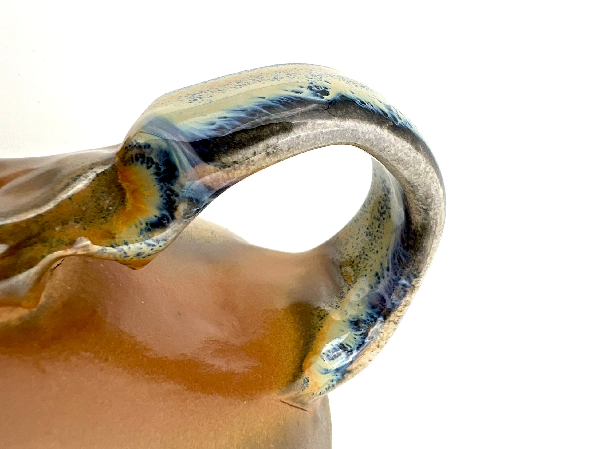 Thrown on the potters wheel/ pulled & sculpted handle. woodfired and drenched in soda. Rutile EPK slip on Welmar clay.