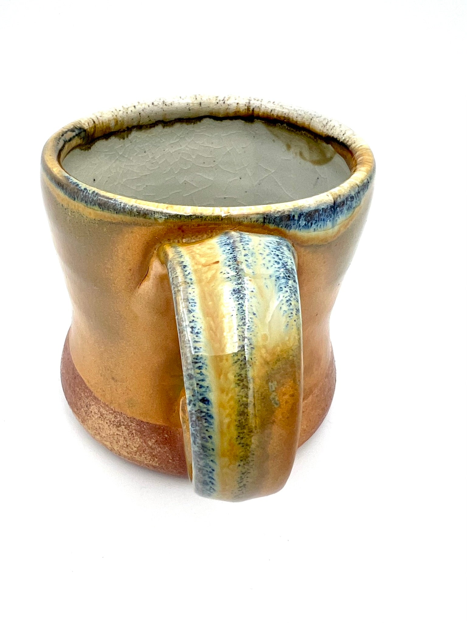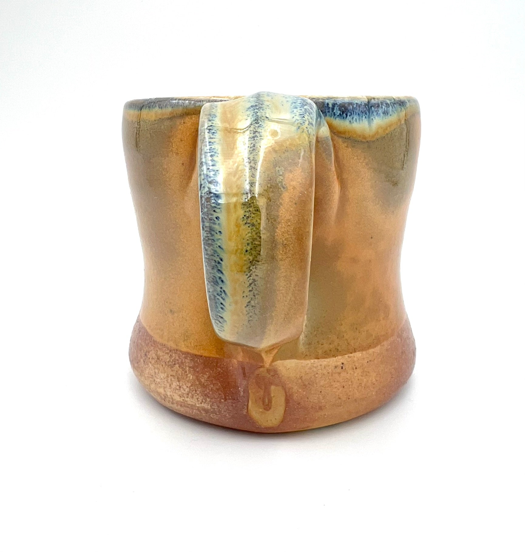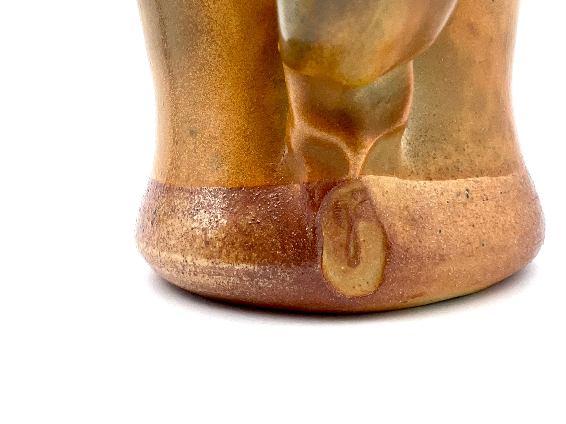 Thrown on the potters wheel/ pulled & sculpted handle. woodfired and drenched in soda. Rutile EPK slip on Welmar clay.