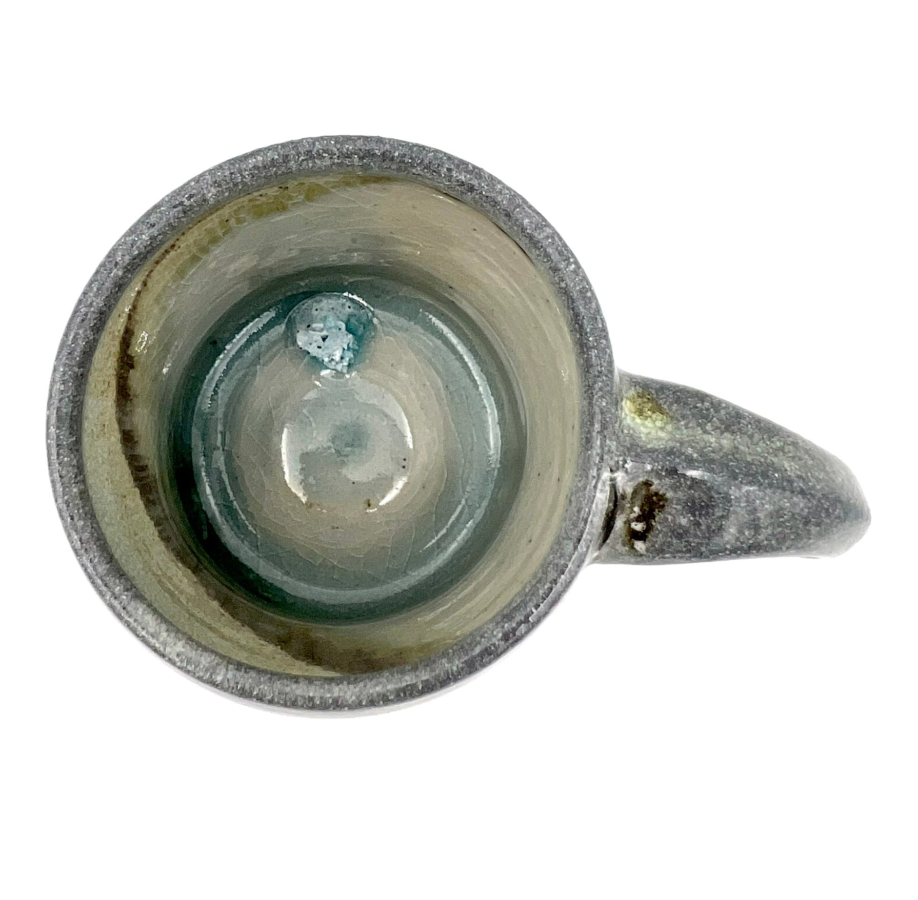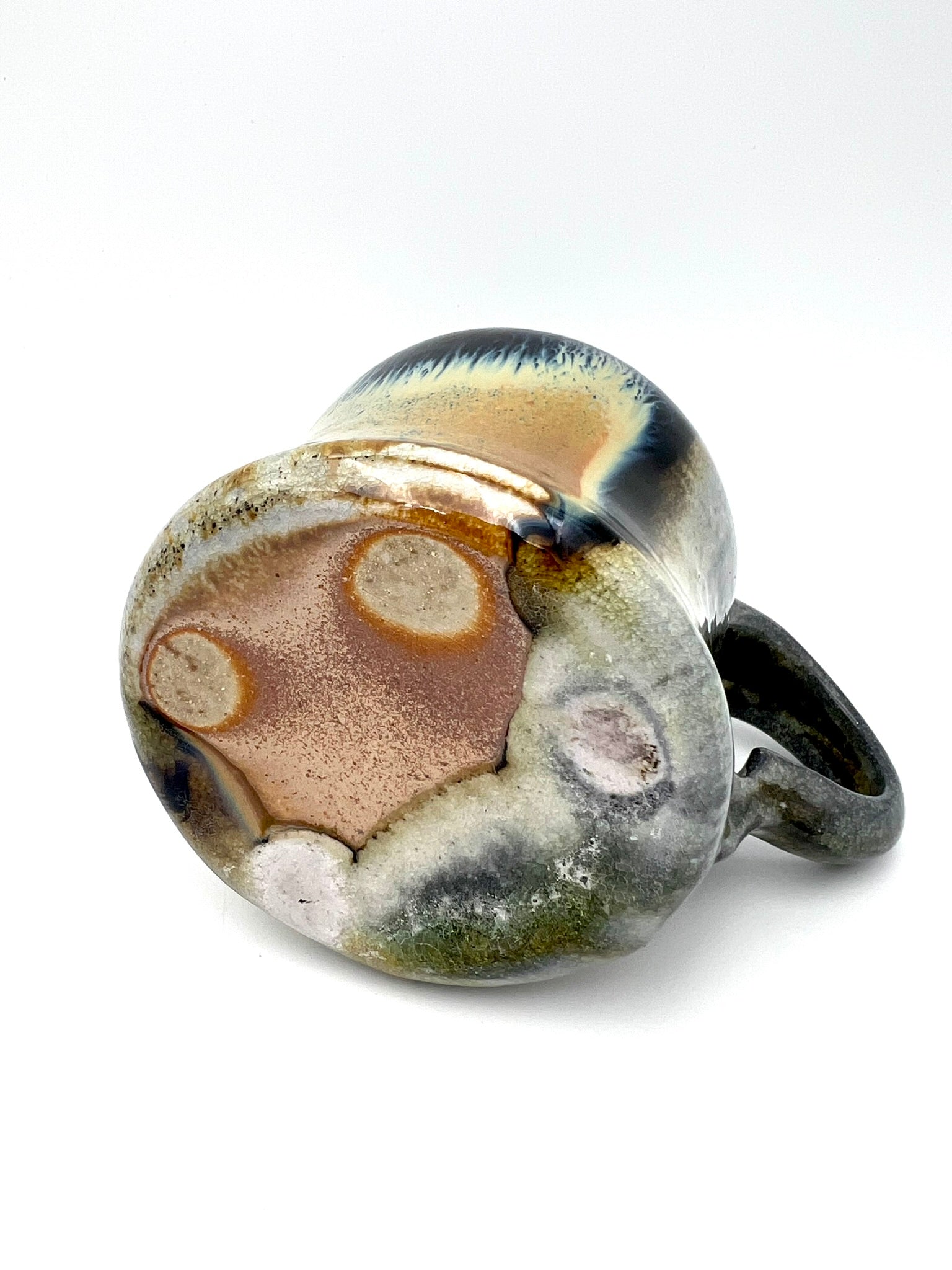Thrown on the potters wheel/ pulled & sculpted handle. woodfired and drenched in soda. Rutile EPK slip on Welmar clay.