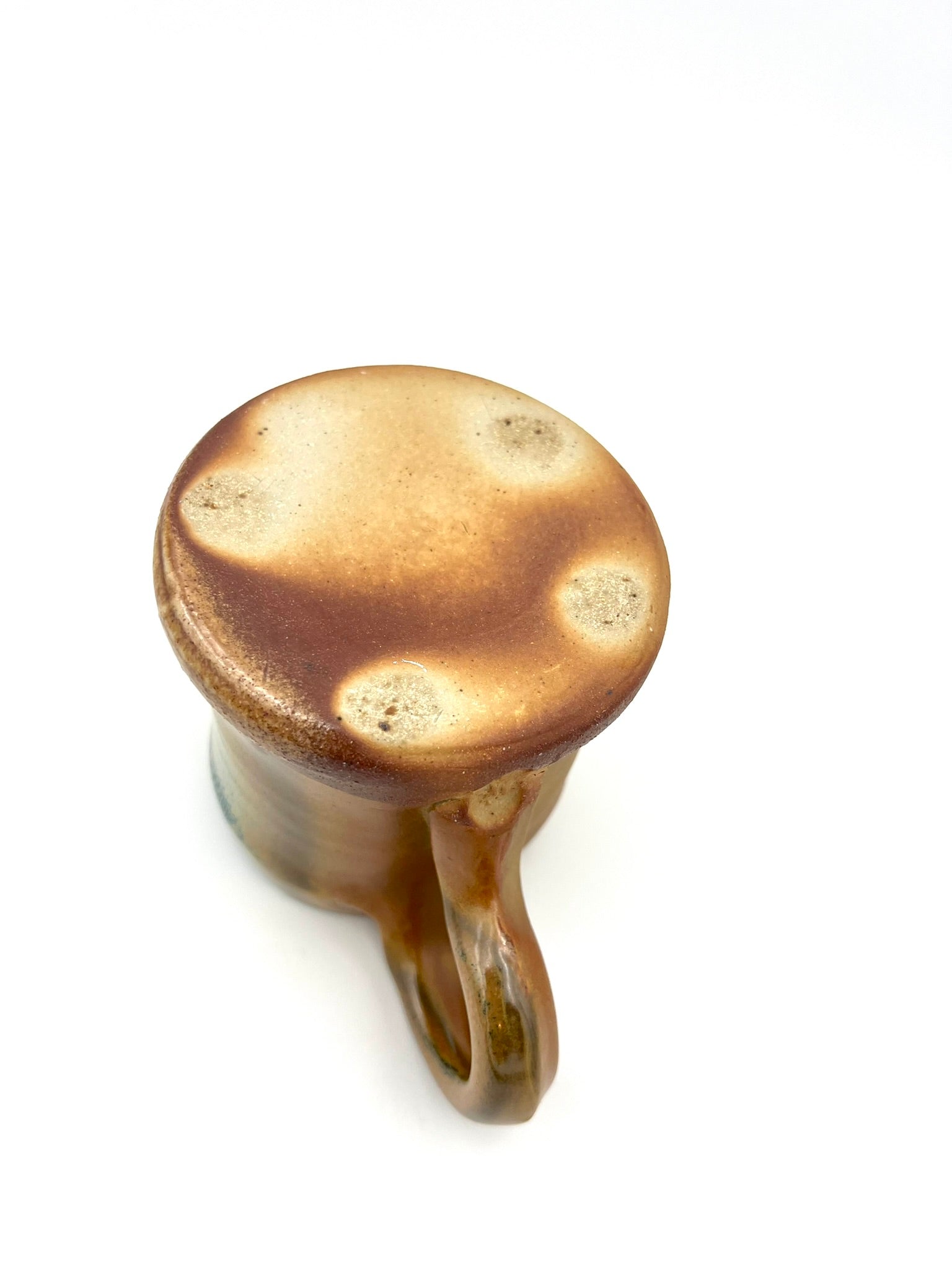 Thrown on the potters wheel/ pulled & sculpted handle. woodfired and drenched in soda. Rutile EPK slip on Welmar clay.