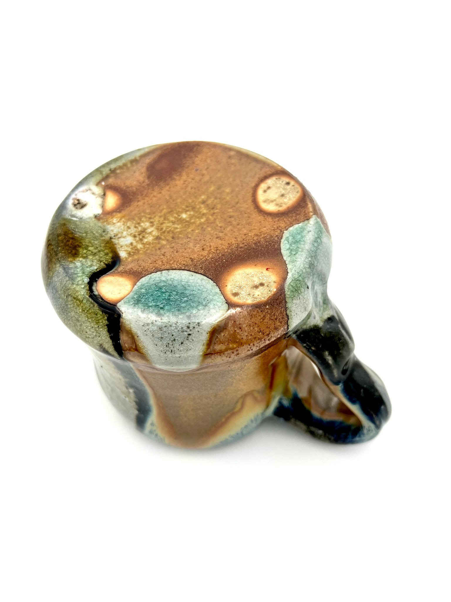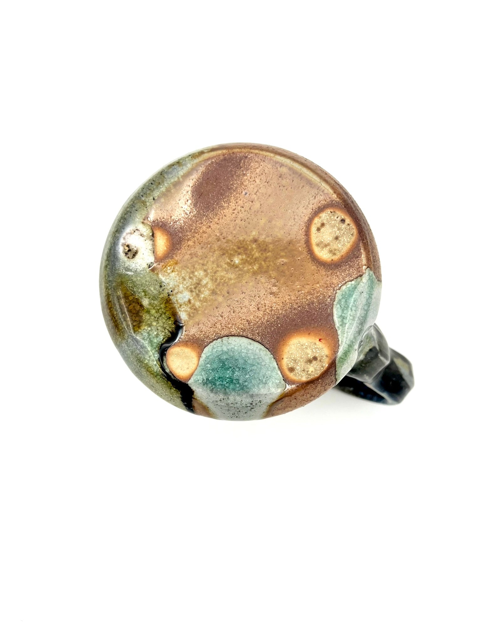 Thrown on the potters wheel/ pulled & sculpted handle. woodfired and drenched in soda. Rutile EPK slip on Welmar clay.