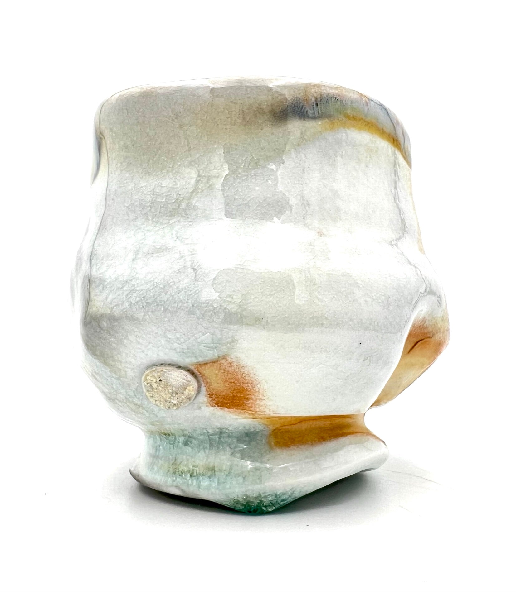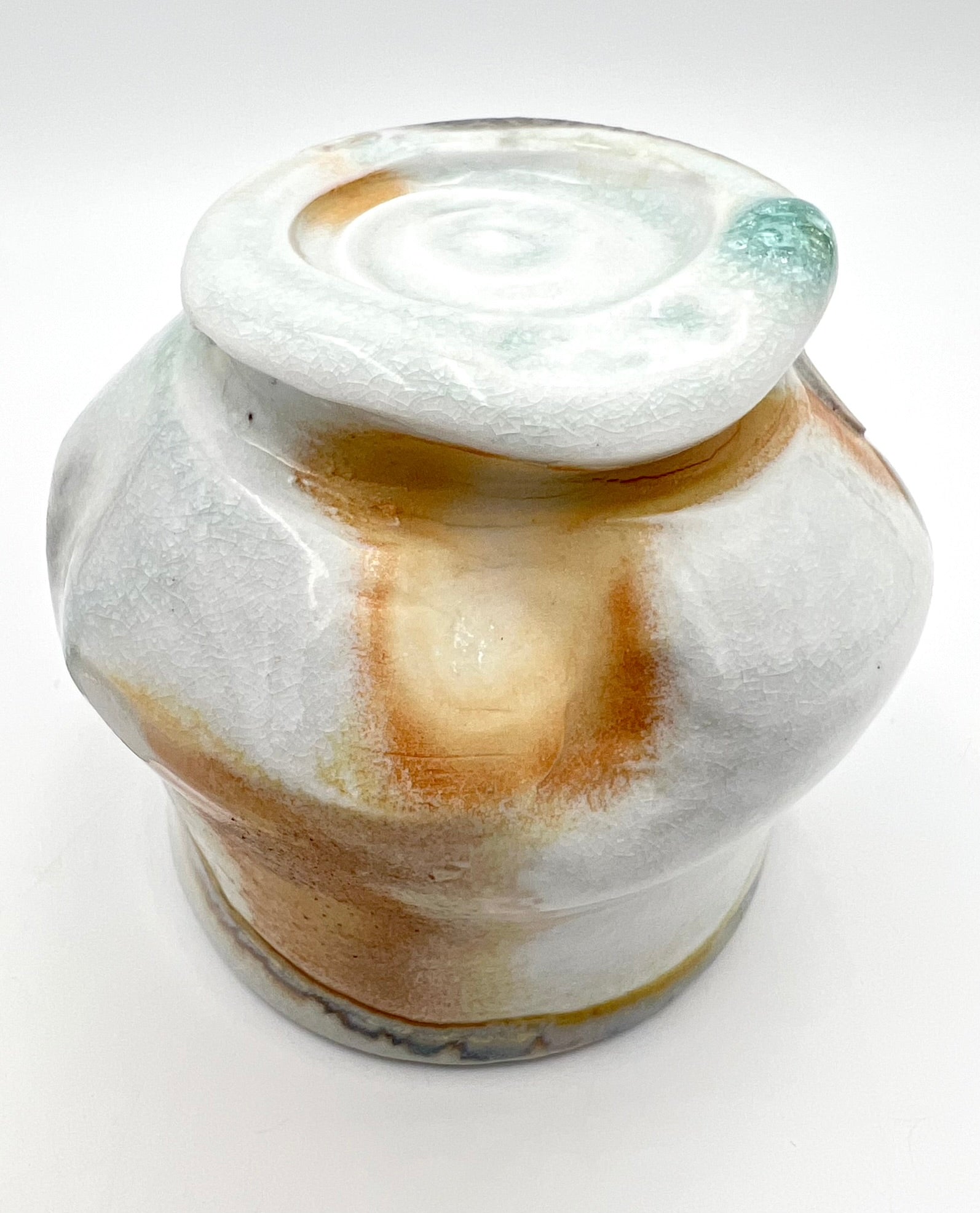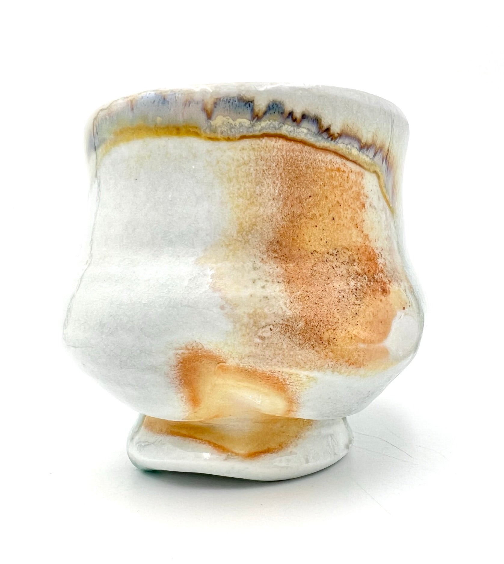 I threw this woodfired yunomi on the potters wheel of NZ clay. It was lined with a Penn State Shino containing 10% rutile. A little got on the outside. Glass from the wood ash pooled about the foot of this cup, elevating and illuminating. This short, footed cup was fired in an anagama on its side on seashells for days. It measures 3.5 inches tall and wide. Delight in its wonder.