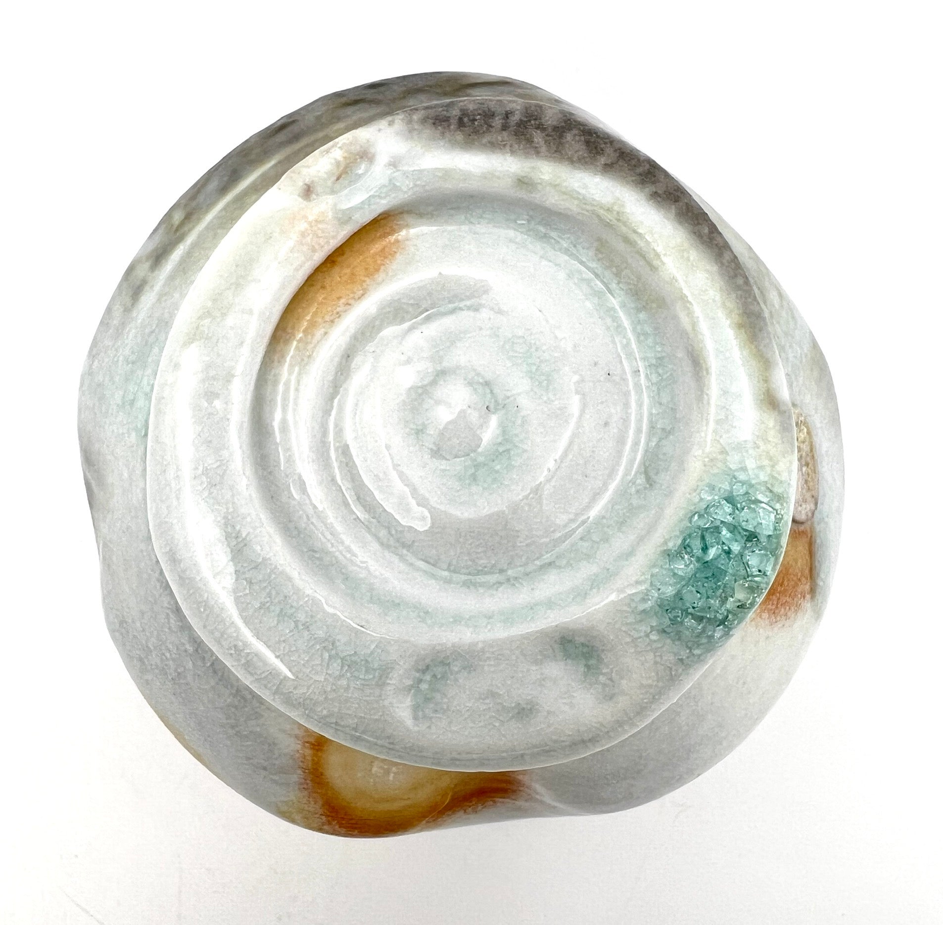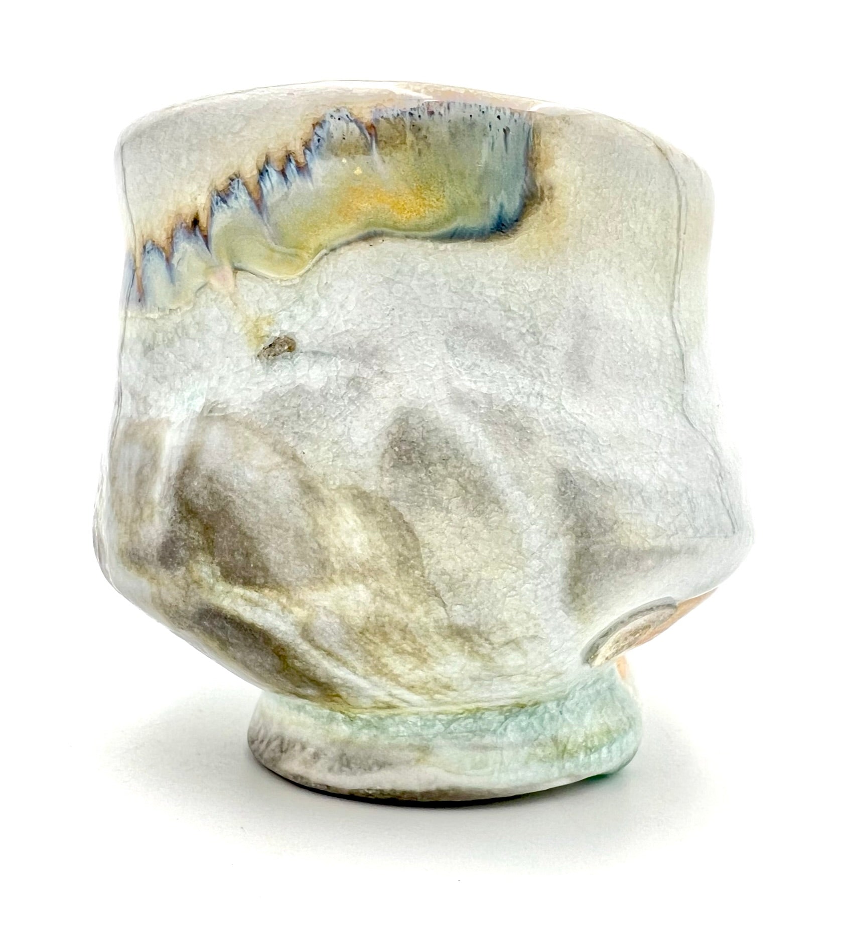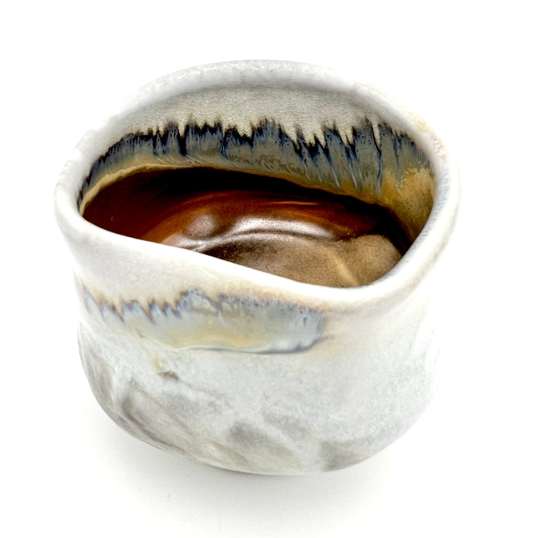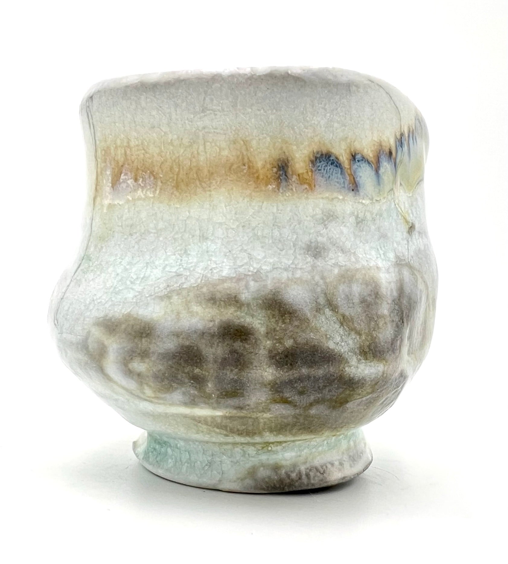 I threw this woodfired yunomi on the potters wheel of NZ clay. It was lined with a Penn State Shino containing 10% rutile. A little got on the outside. Glass from the wood ash pooled about the foot of this cup, elevating and illuminating. This short, footed cup was fired in an anagama on its side on seashells for days. It measures 3.5 inches tall and wide. Delight in its wonder.