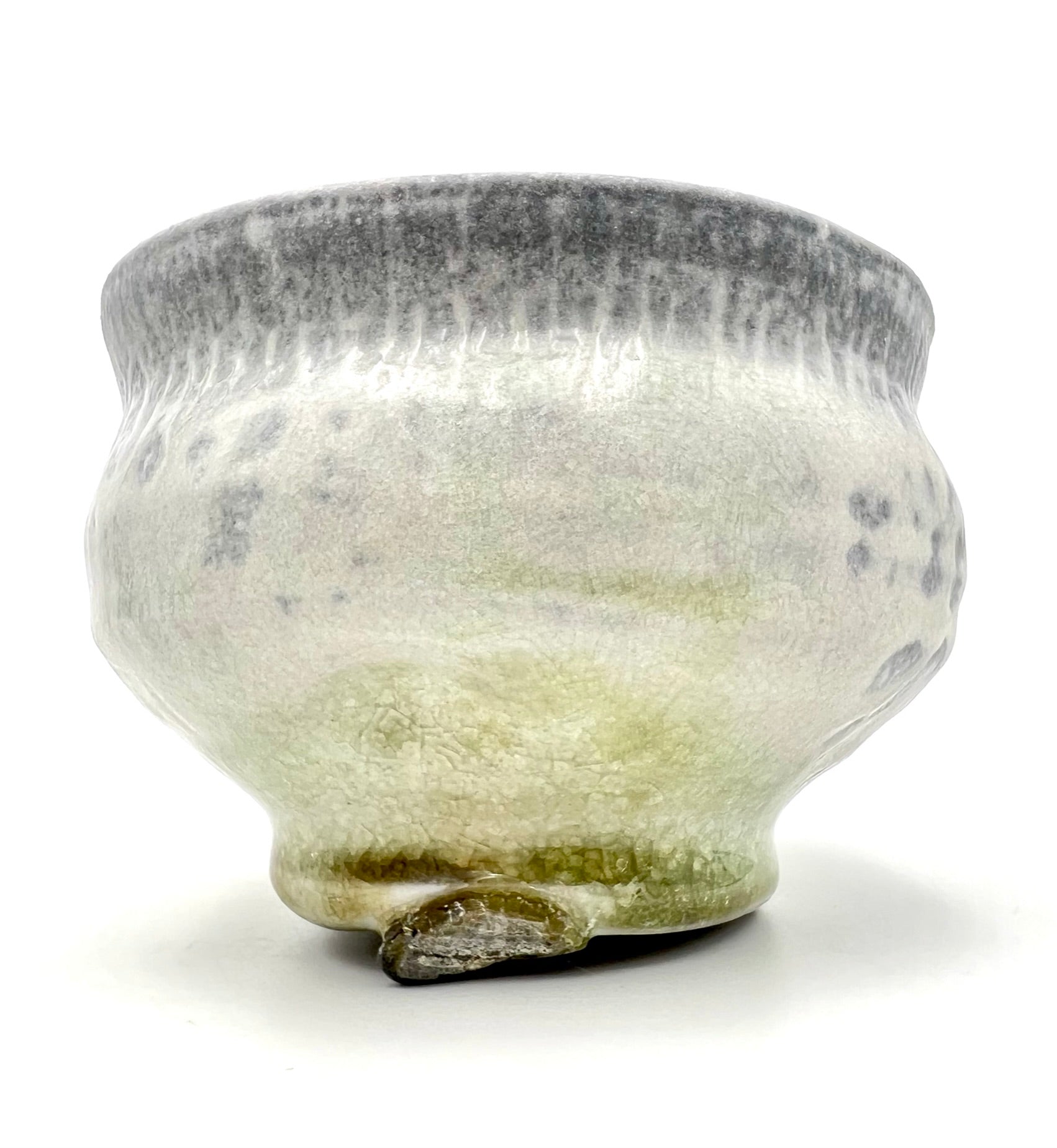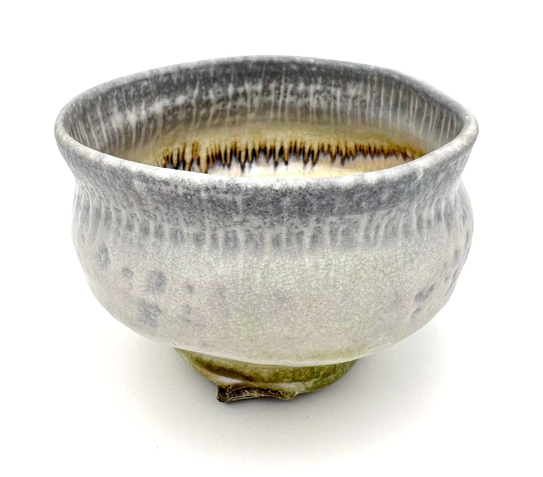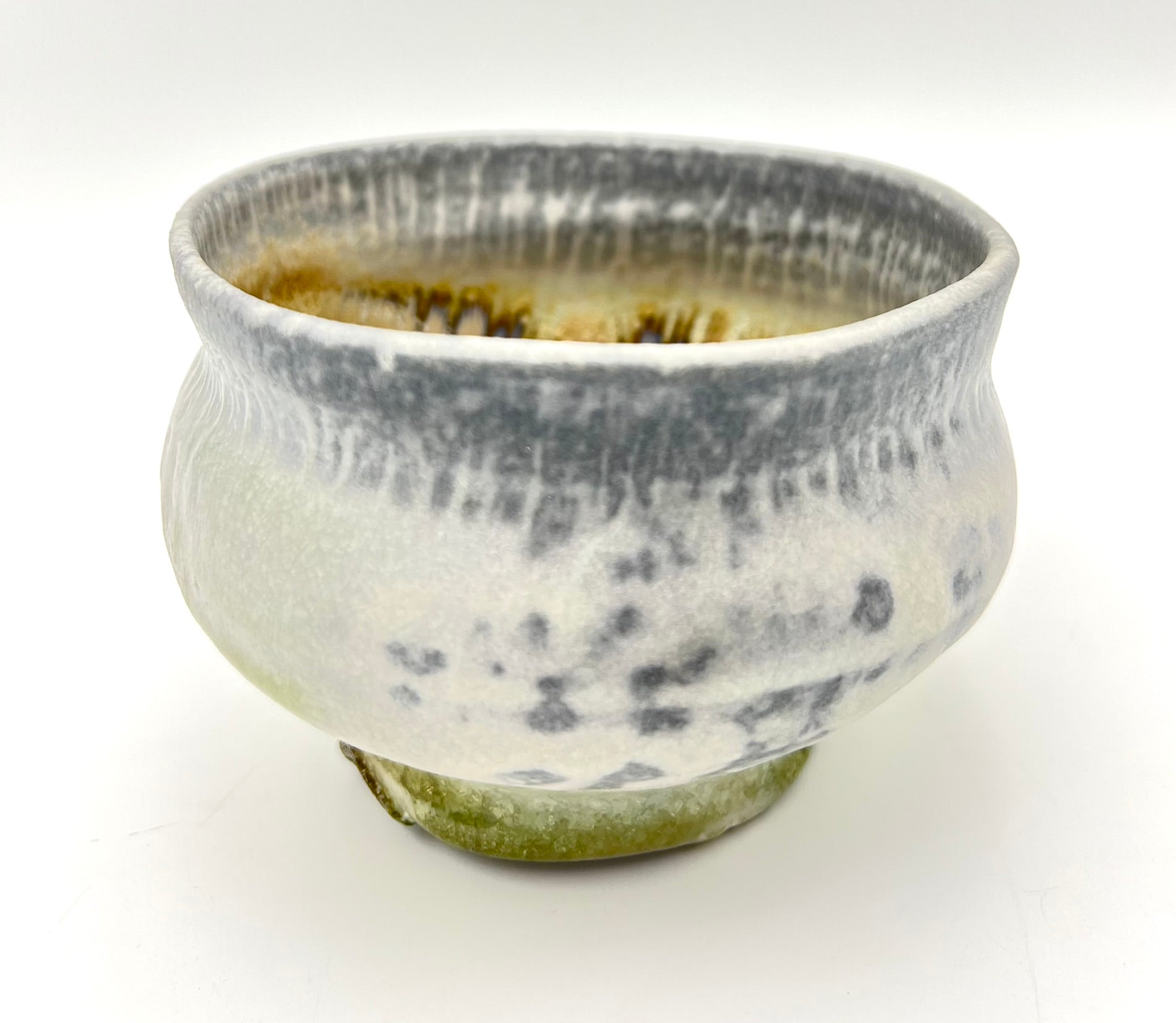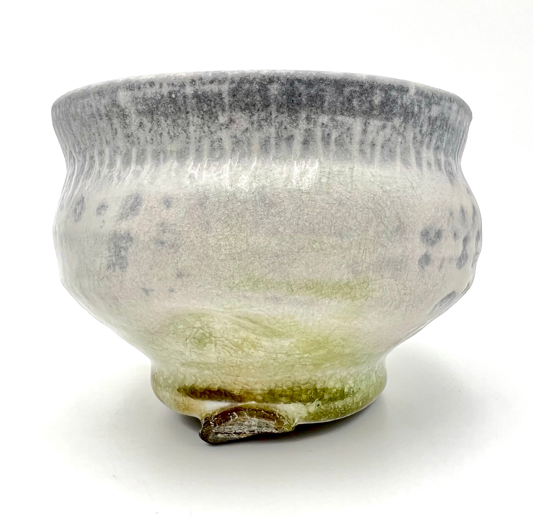 I threw this woodfired chawan on the potters wheel of White Rose clay. It was lined with a Penn State Shino containing 10% rutile. This short, footed cup was fired in an anagama upright on seashells for days. A pool of glass from the accumulation of wood ash pooled about one of the shells, elevating this cup. It measures 3 inches tall and 4.5 inches wide.