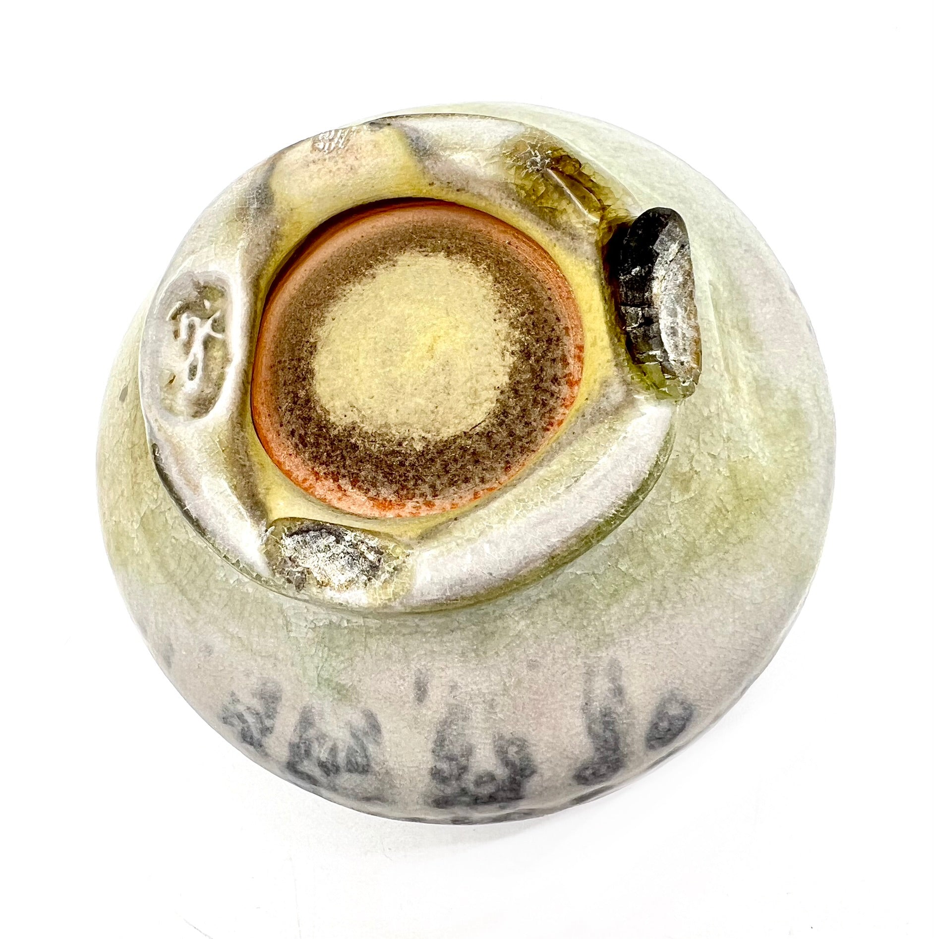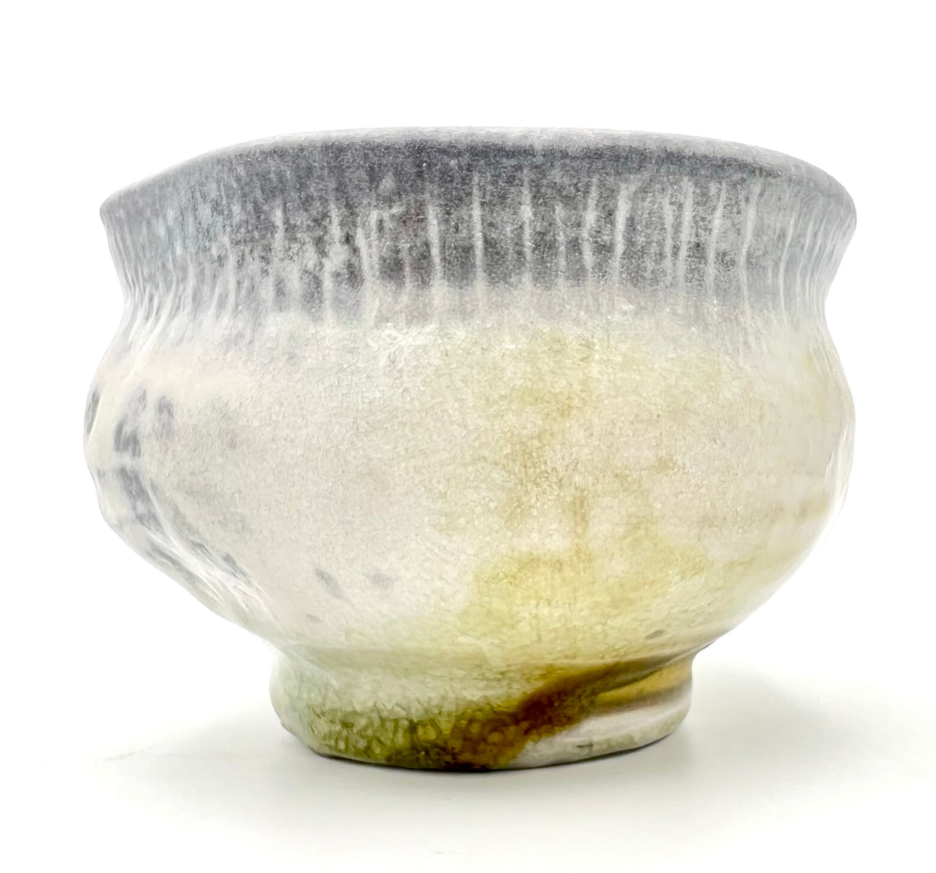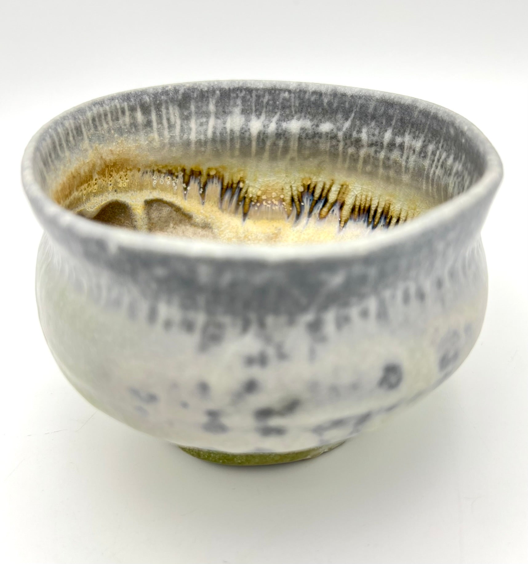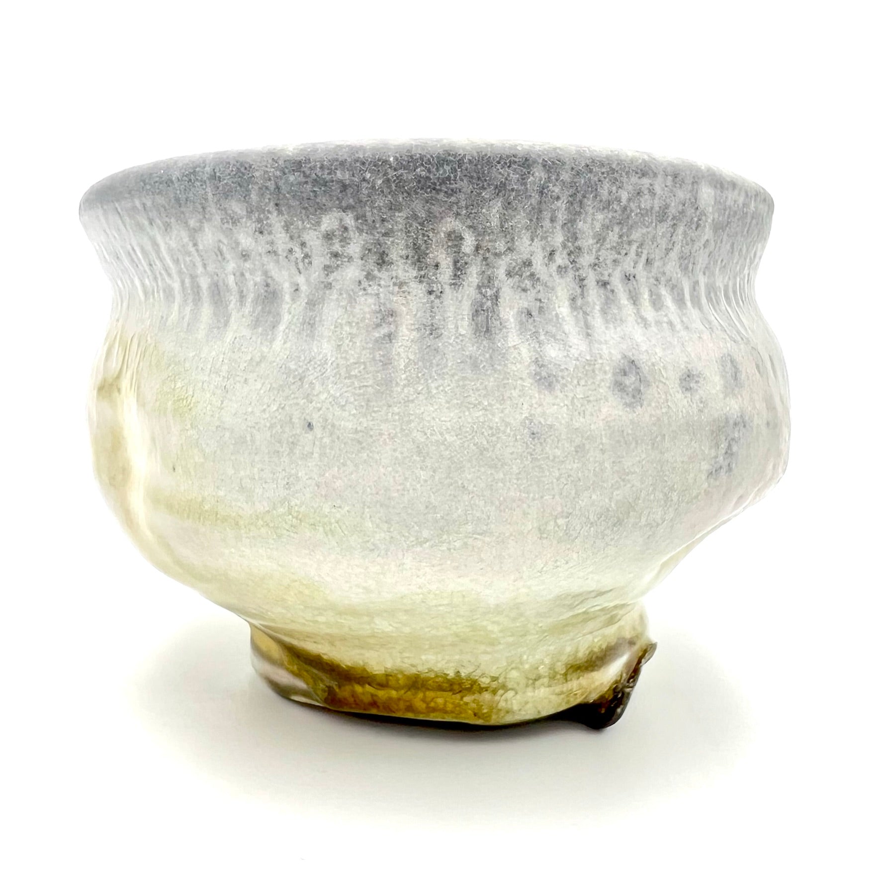 I threw this woodfired chawan on the potters wheel of White Rose clay. It was lined with a Penn State Shino containing 10% rutile. This short, footed cup was fired in an anagama upright on seashells for days. A pool of glass from the accumulation of wood ash pooled about one of the shells, elevating this cup. It measures 3 inches tall and 4.5 inches wide.