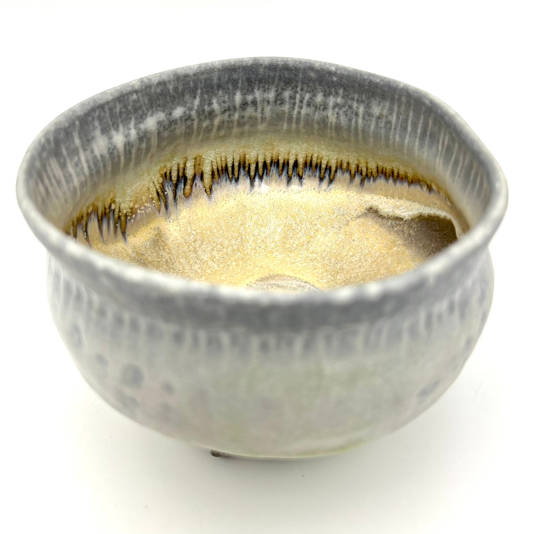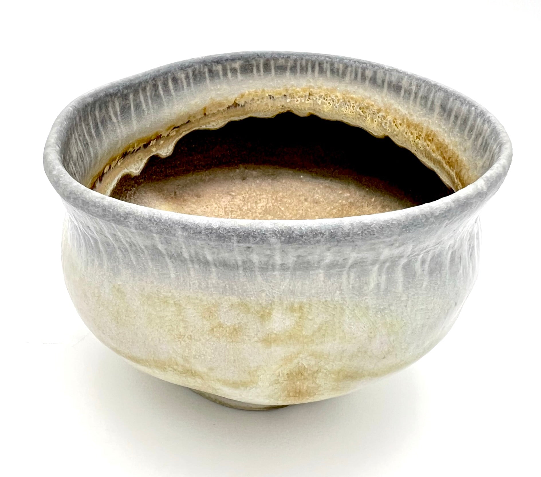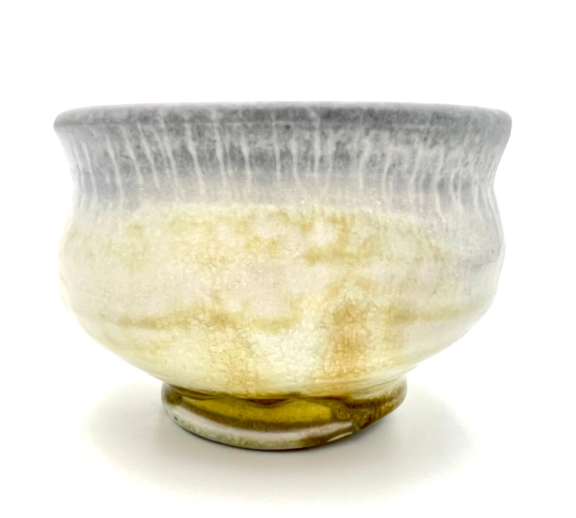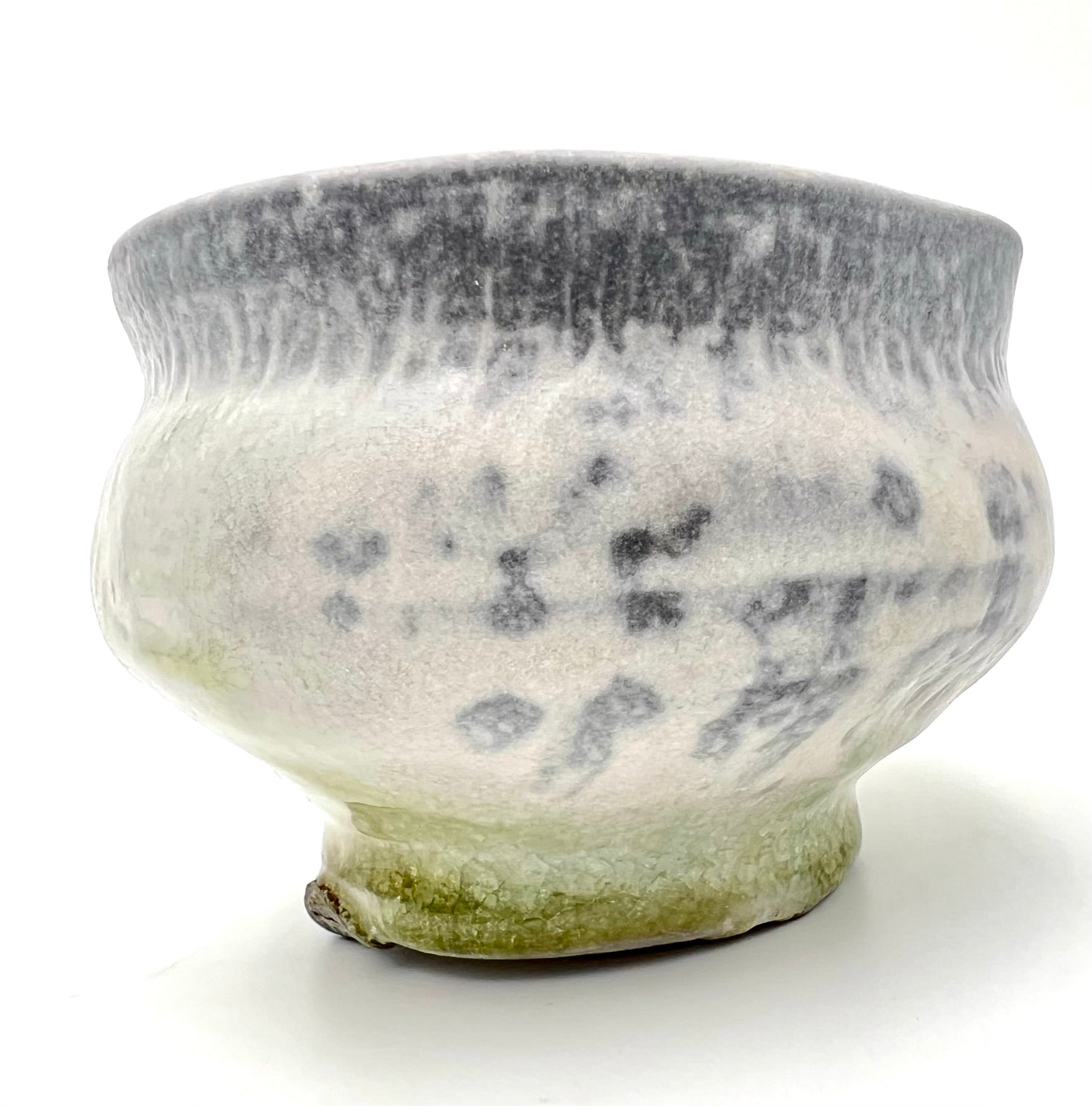 I threw this woodfired chawan on the potters wheel of White Rose clay. It was lined with a Penn State Shino containing 10% rutile. This short, footed cup was fired in an anagama upright on seashells for days. A pool of glass from the accumulation of wood ash pooled about one of the shells, elevating this cup. It measures 3 inches tall and 4.5 inches wide.