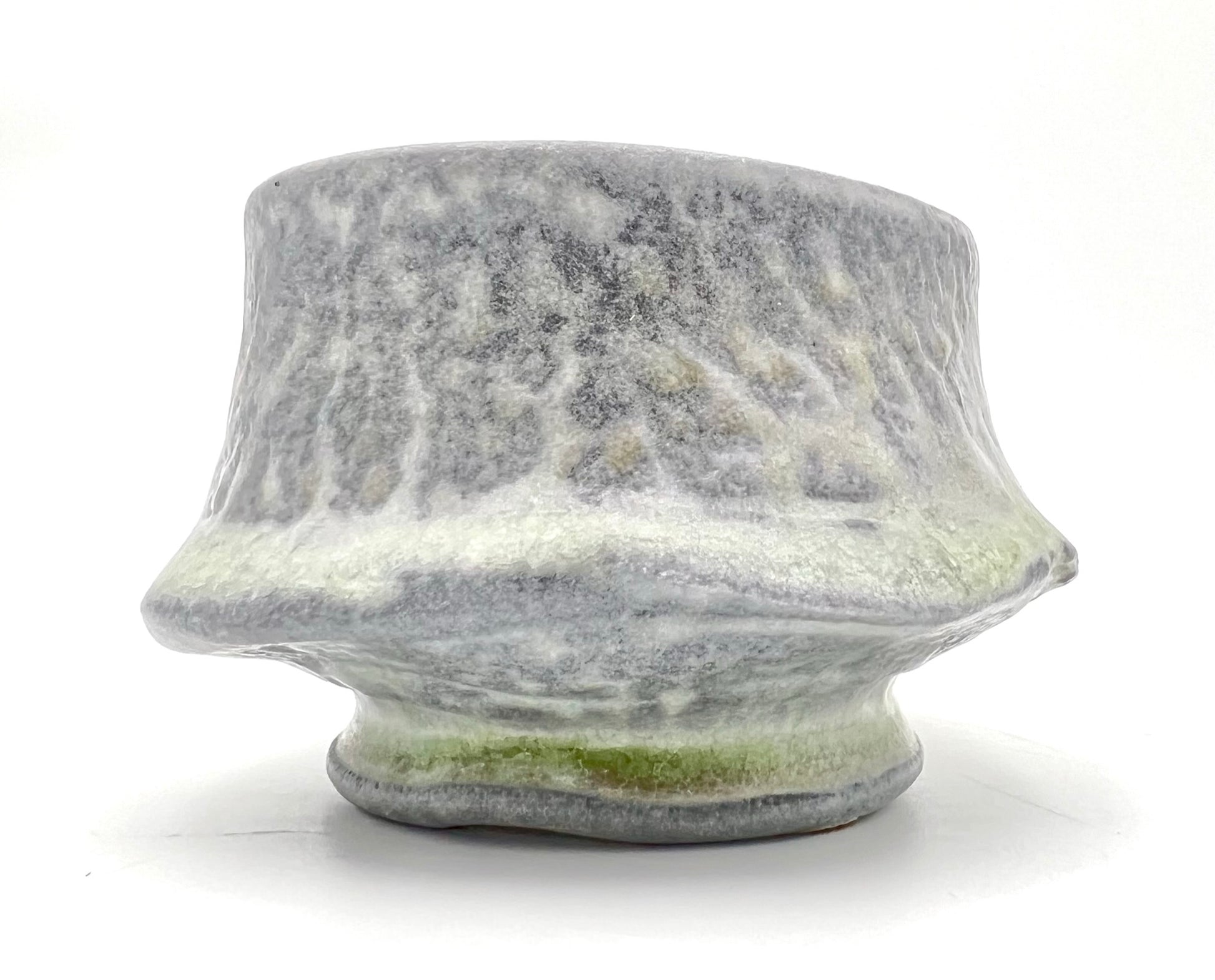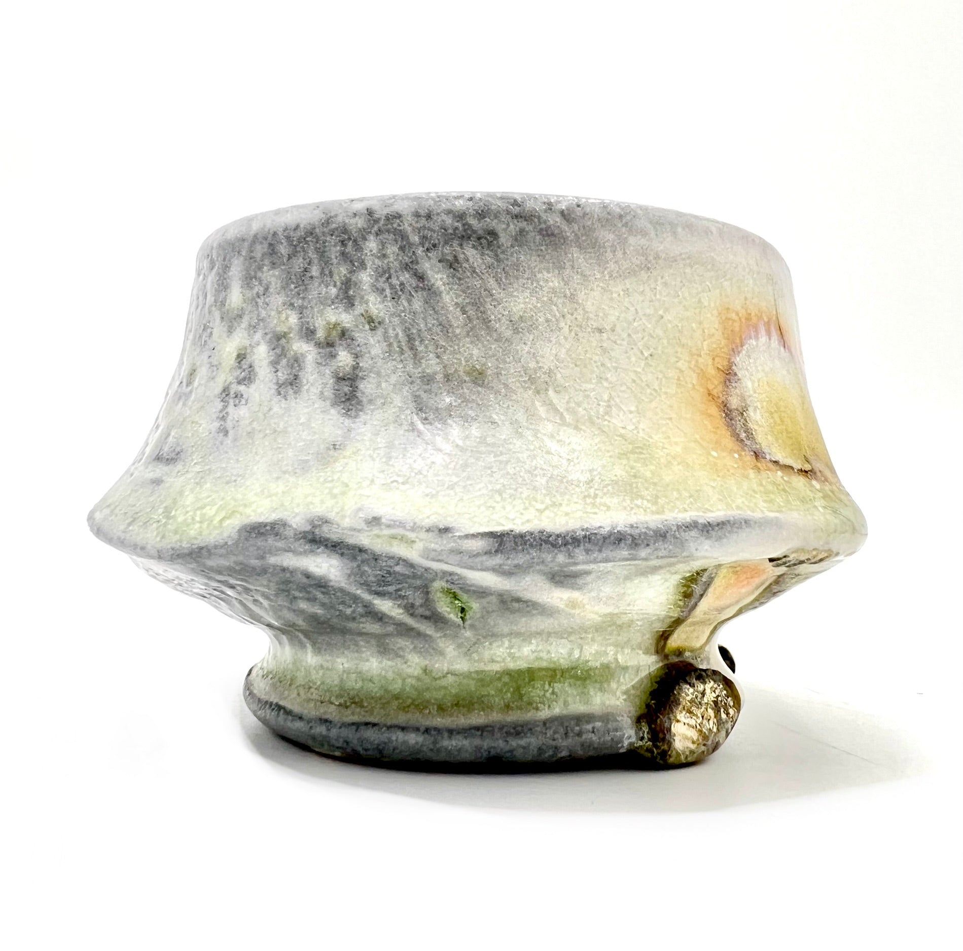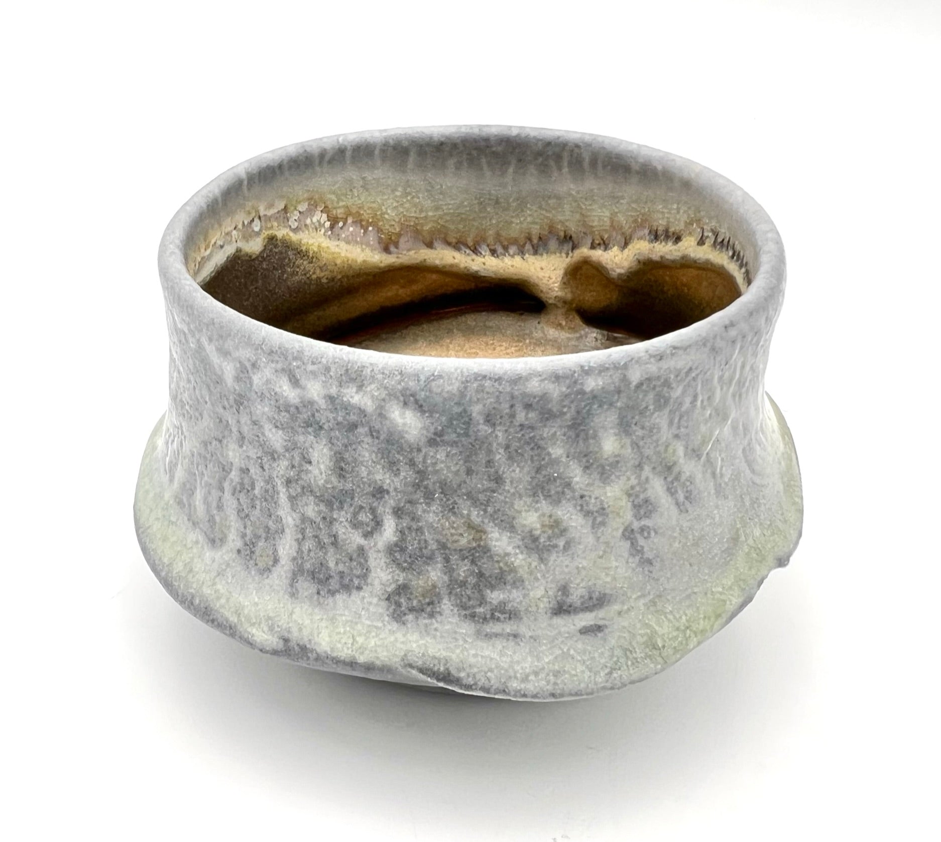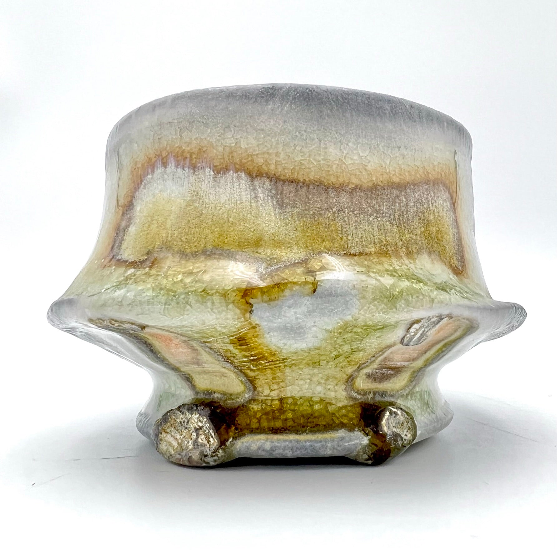 I threw and altered this woodfired yunomi on the potters wheel of NZ clay. It was lined with a Penn State Shino containing 10% rutile. A little got on the outside. some glaze got inside the foot ring too. This short, footed cup was fired upright on seashells in an anagama for days. Note how the wood ash mingled with the glaze, and flowed down the sides. A rainbow of hares fur graces the transitions of the cascades. It measures 3.25 inches tall and 4 wide. In some ways, it's what's on the inside that counts most.