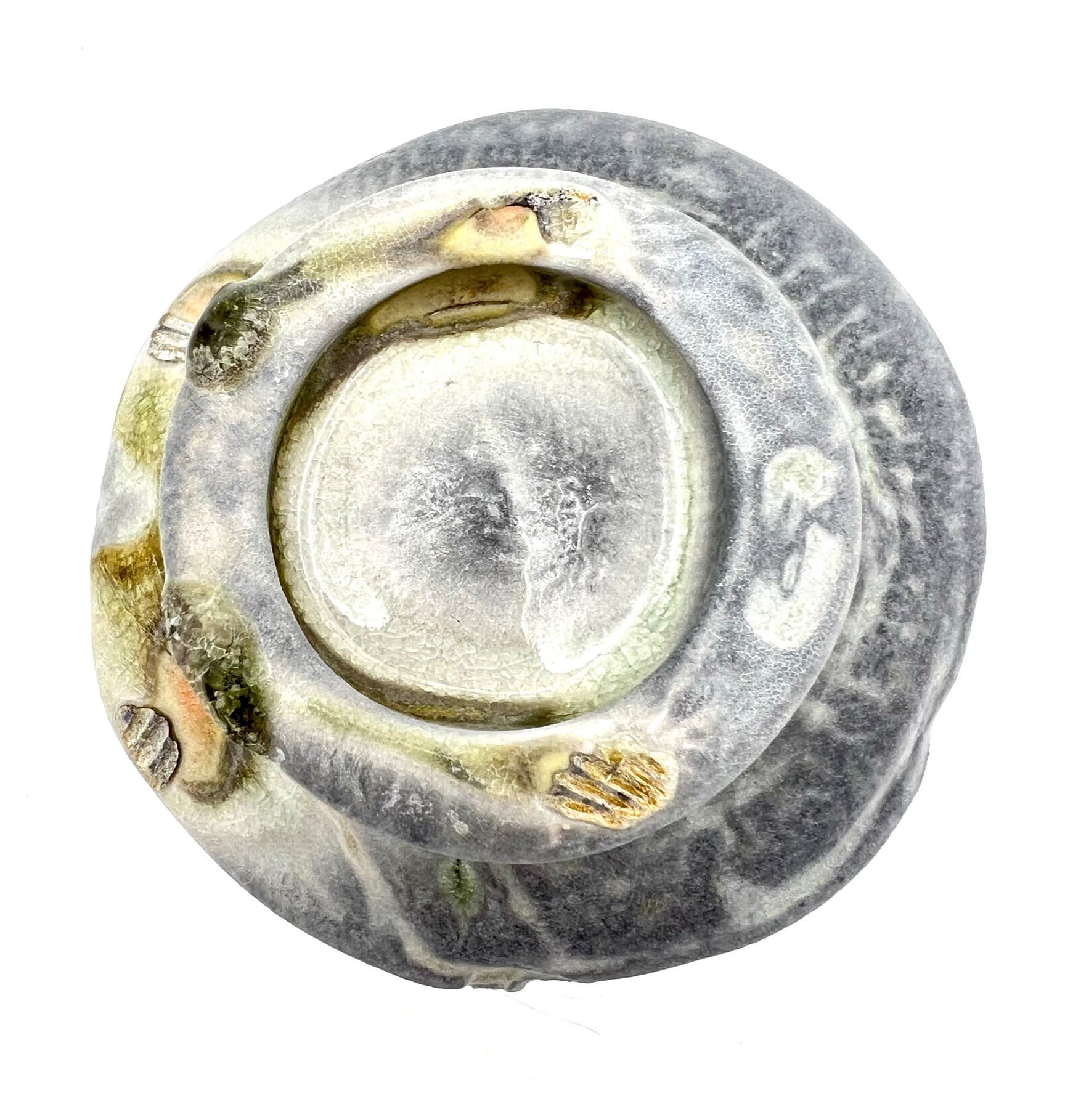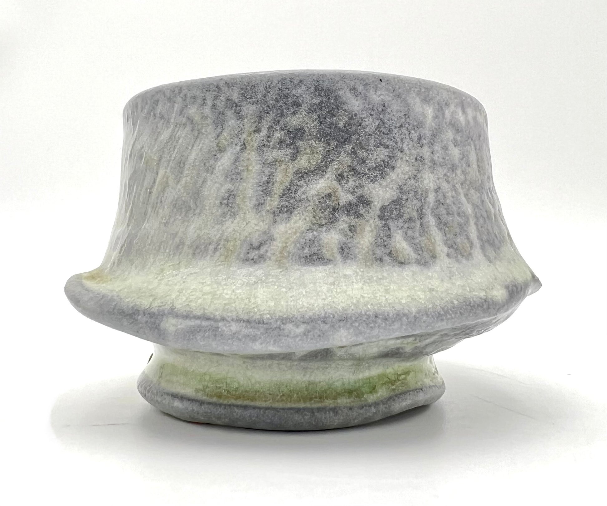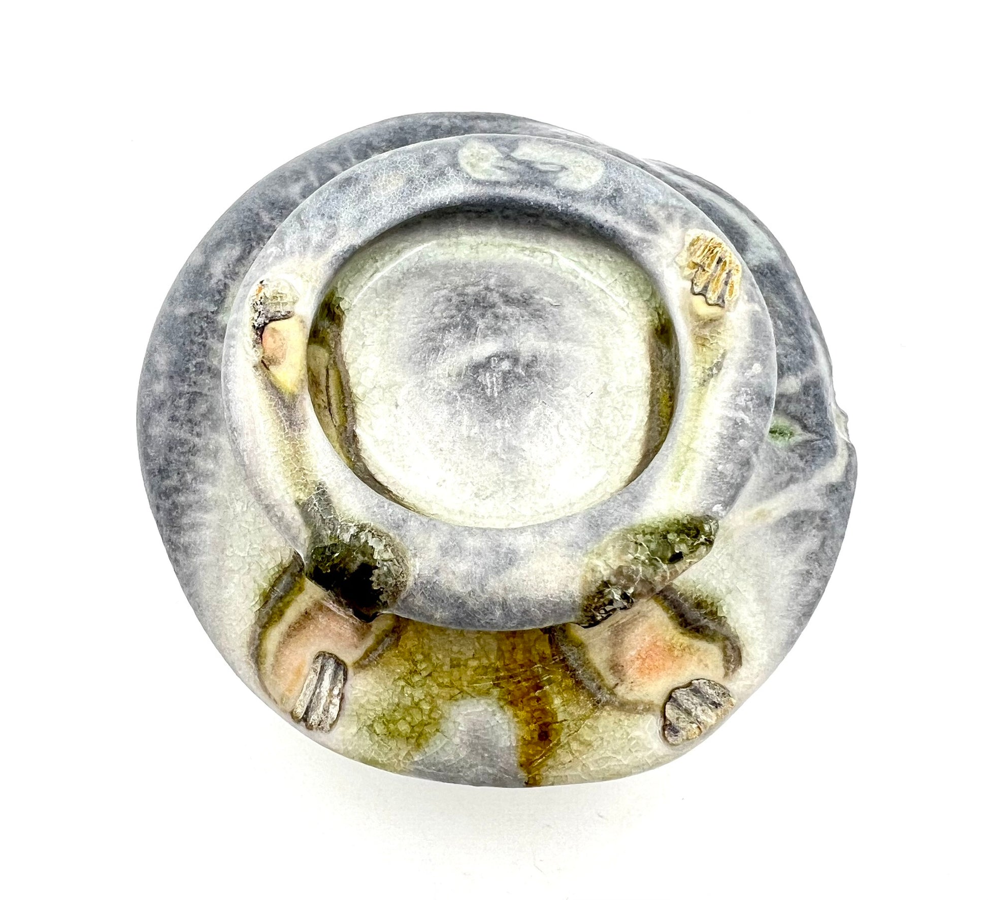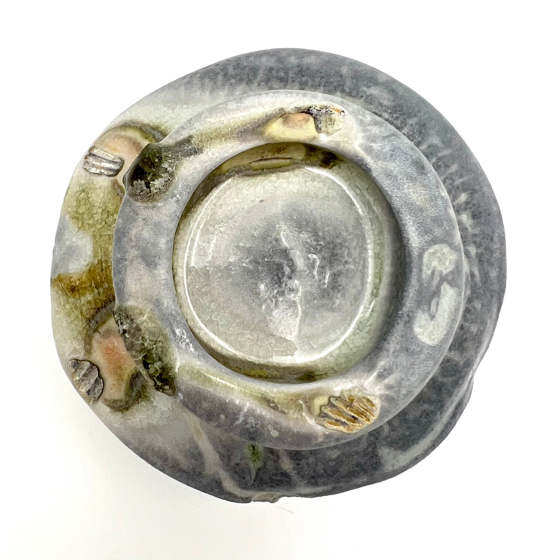 I threw and altered this woodfired yunomi on the potters wheel of NZ clay. It was lined with a Penn State Shino containing 10% rutile. A little got on the outside. some glaze got inside the foot ring too. This short, footed cup was fired upright on seashells in an anagama for days. Note how the wood ash mingled with the glaze, and flowed down the sides. A rainbow of hares fur graces the transitions of the cascades. It measures 3.25 inches tall and 4 wide. In some ways, it's what's on the inside that counts most.