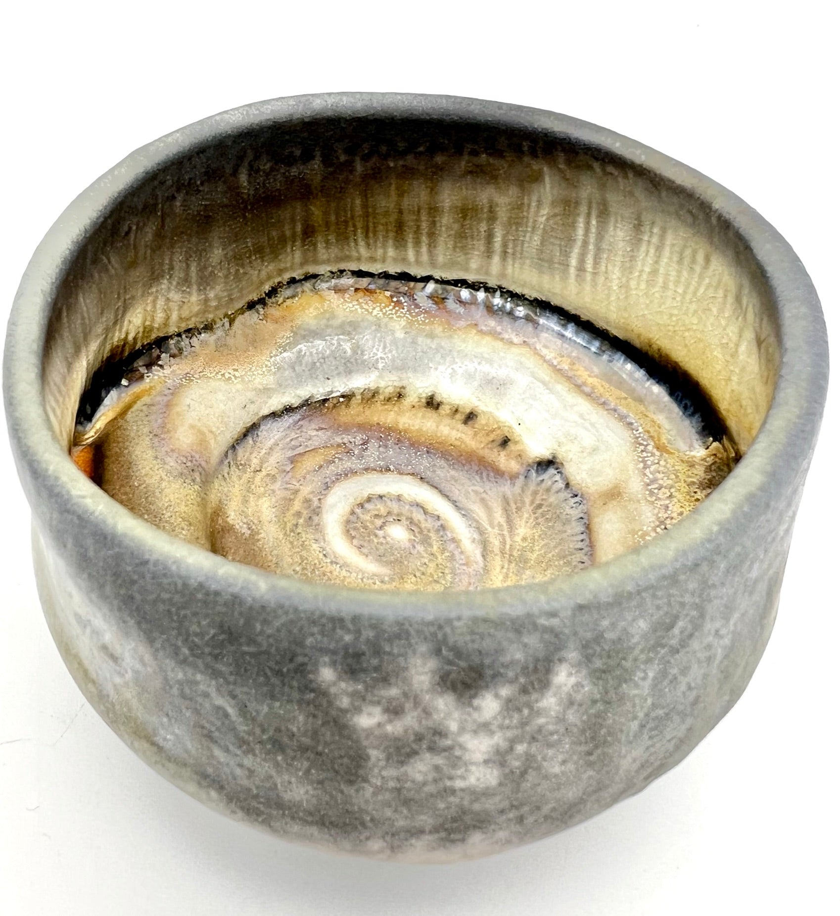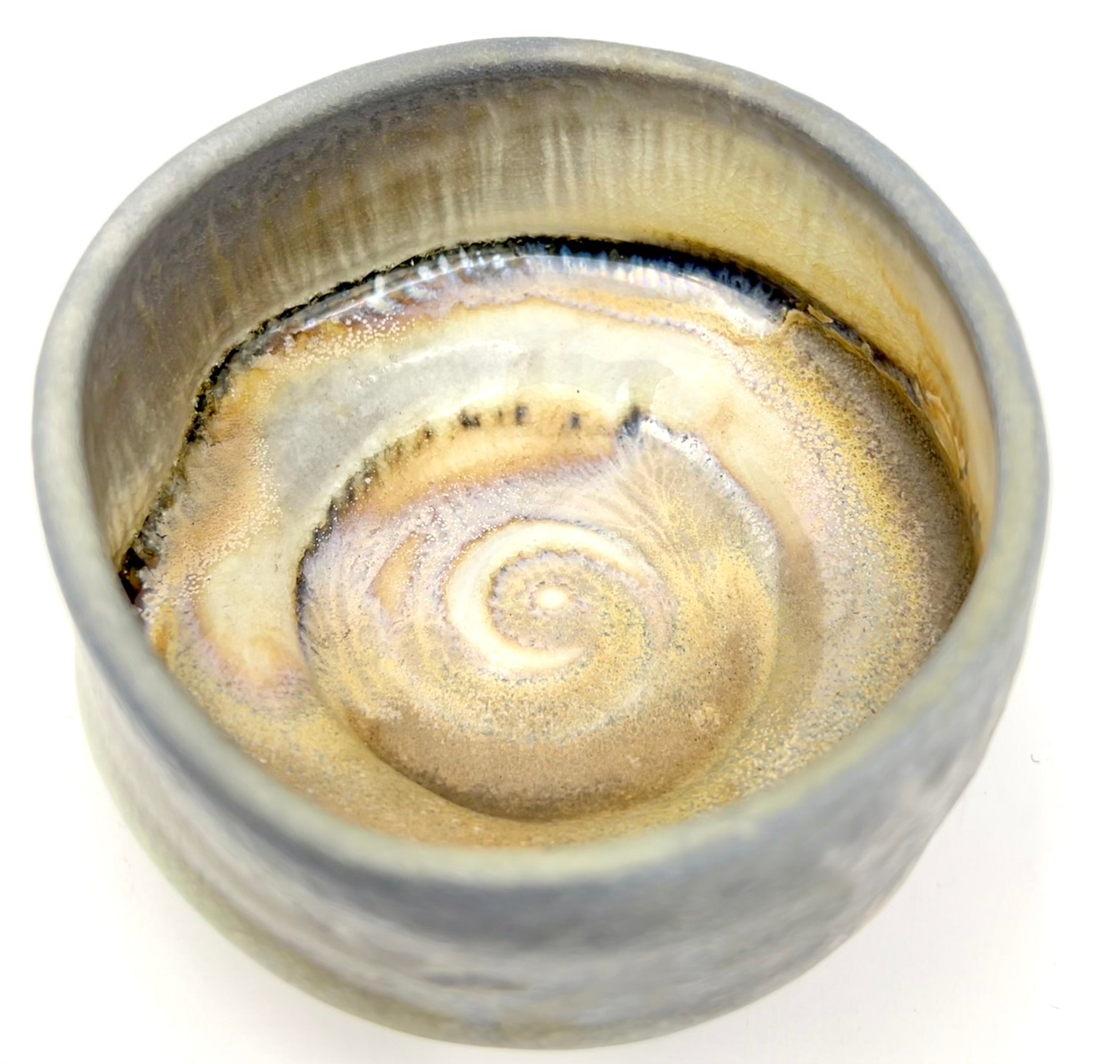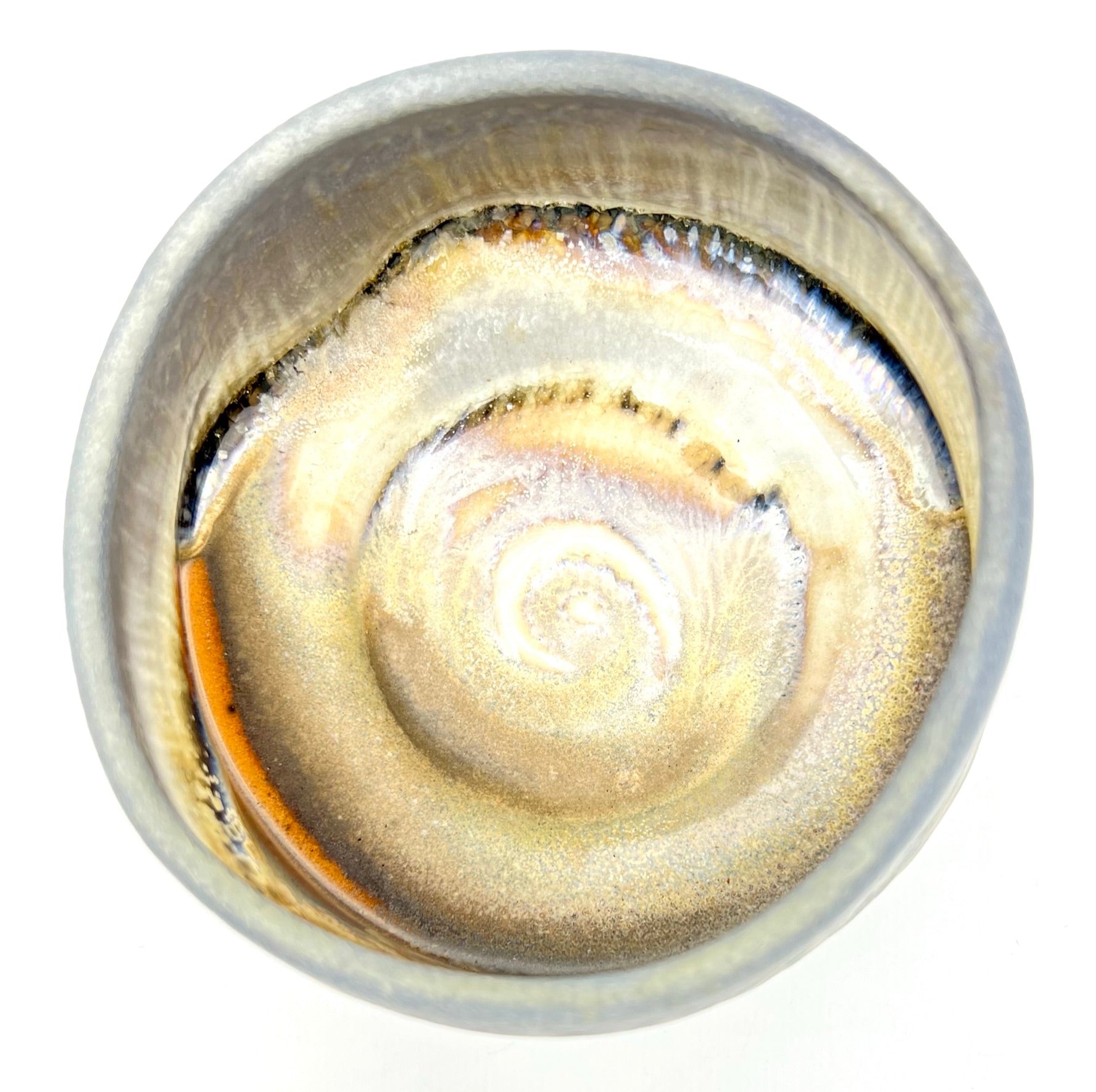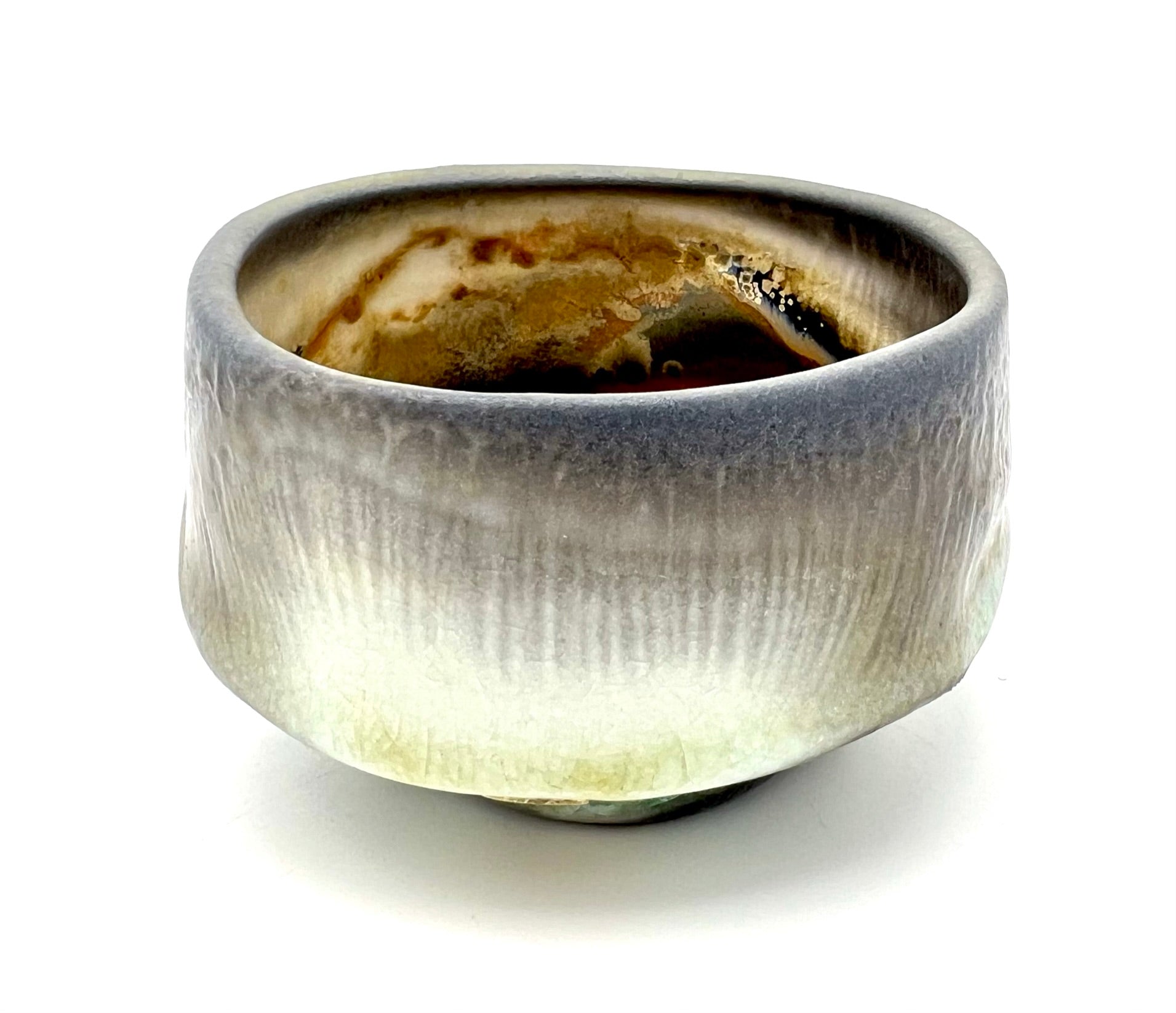 I threw this woodfired chawan on the potters wheel of NZ clay. It was lined with a Penn State Shino containing 10% rutile. A little got on the outside. This short, footed cup was fired on seashells in an anagama for days. Note how the wood ash mingled with the glaze, and flowed down the sides. A rainbow of hares fur graces the transitions between matte and gloss. Pools of wood ash have immortalized the shells that held this cup aloft in the kiln. It measures 2.5 inches tall and 4 wide.