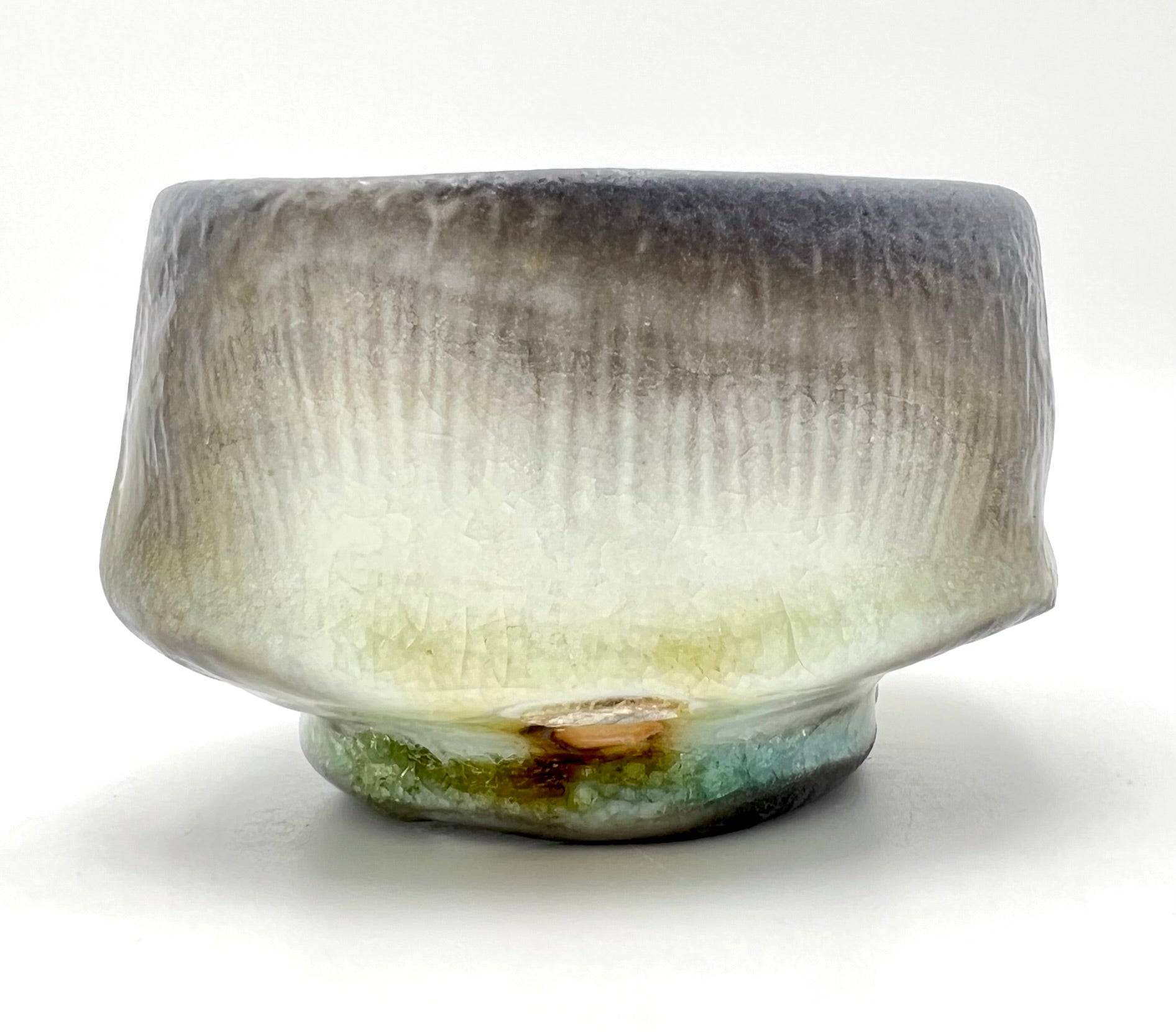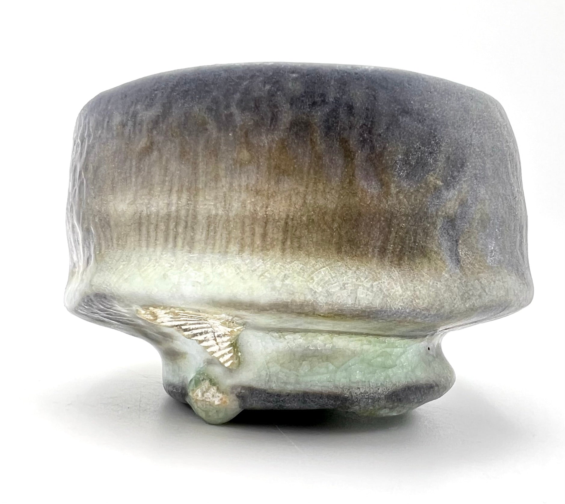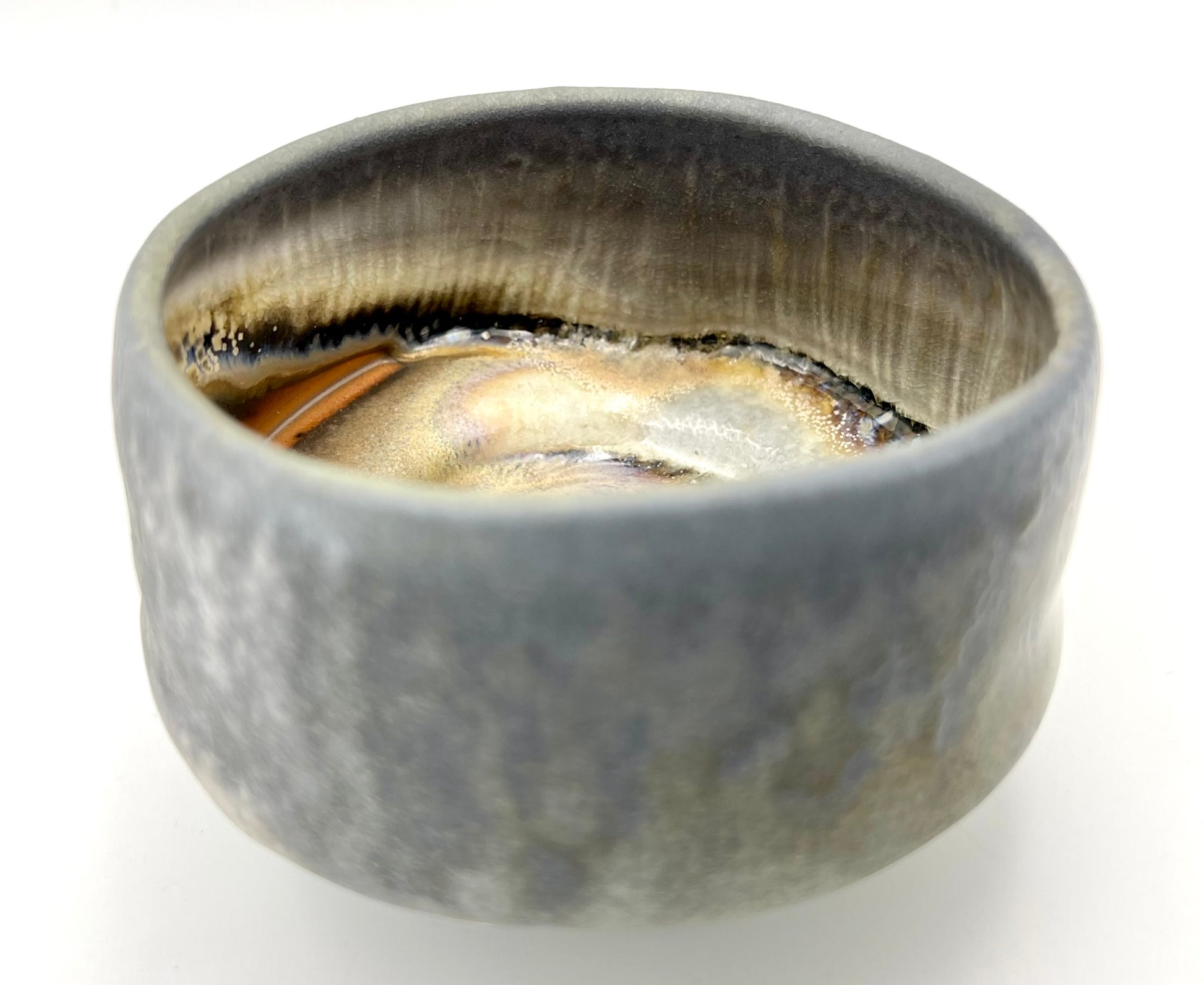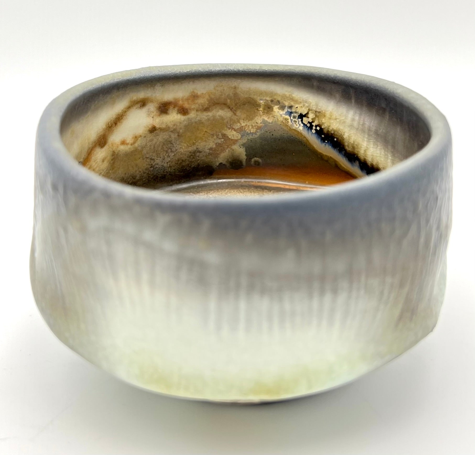 I threw this woodfired chawan on the potters wheel of NZ clay. It was lined with a Penn State Shino containing 10% rutile. A little got on the outside. This short, footed cup was fired on seashells in an anagama for days. Note how the wood ash mingled with the glaze, and flowed down the sides. A rainbow of hares fur graces the transitions between matte and gloss. Pools of wood ash have immortalized the shells that held this cup aloft in the kiln. It measures 2.5 inches tall and 4 wide.