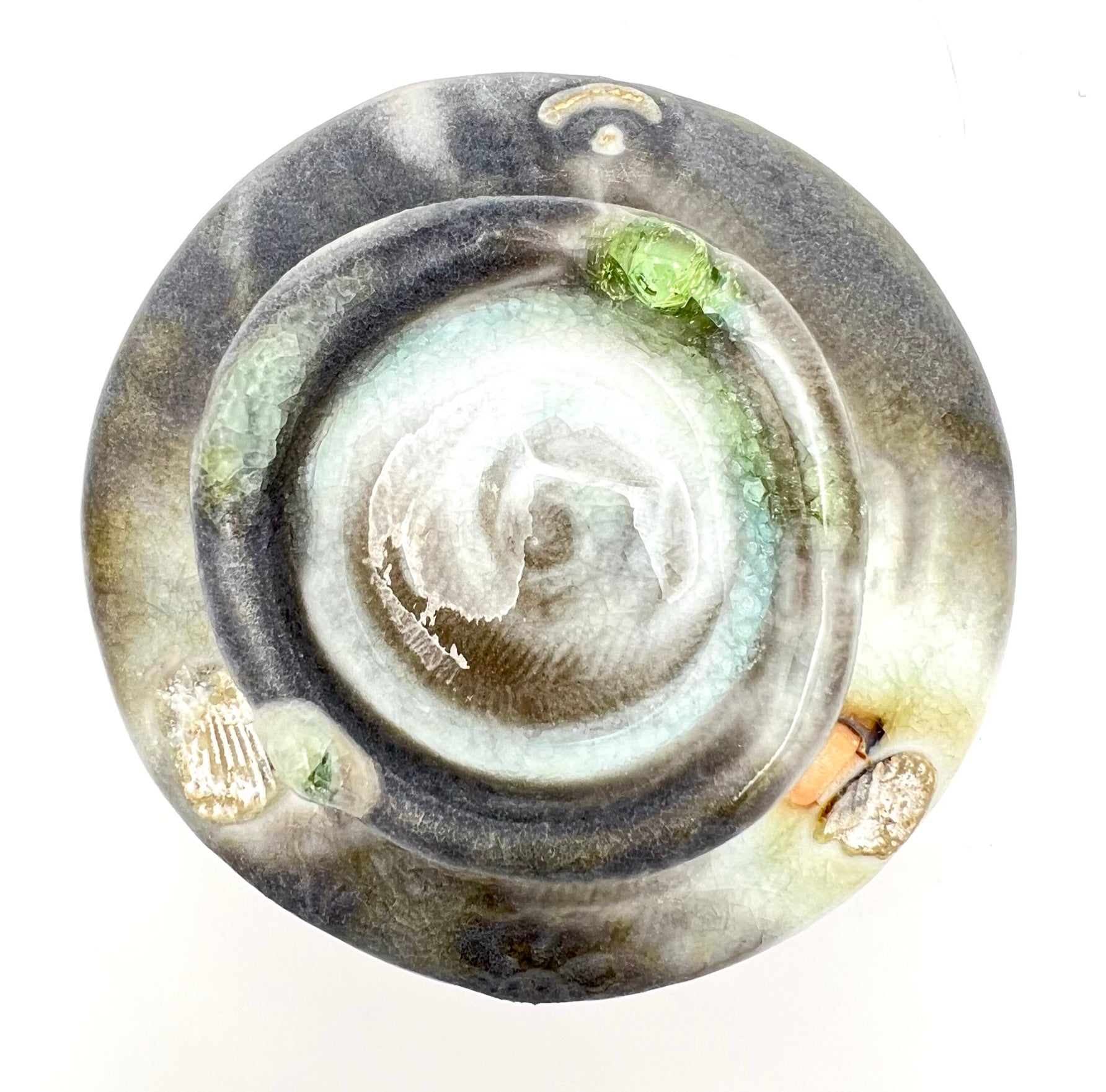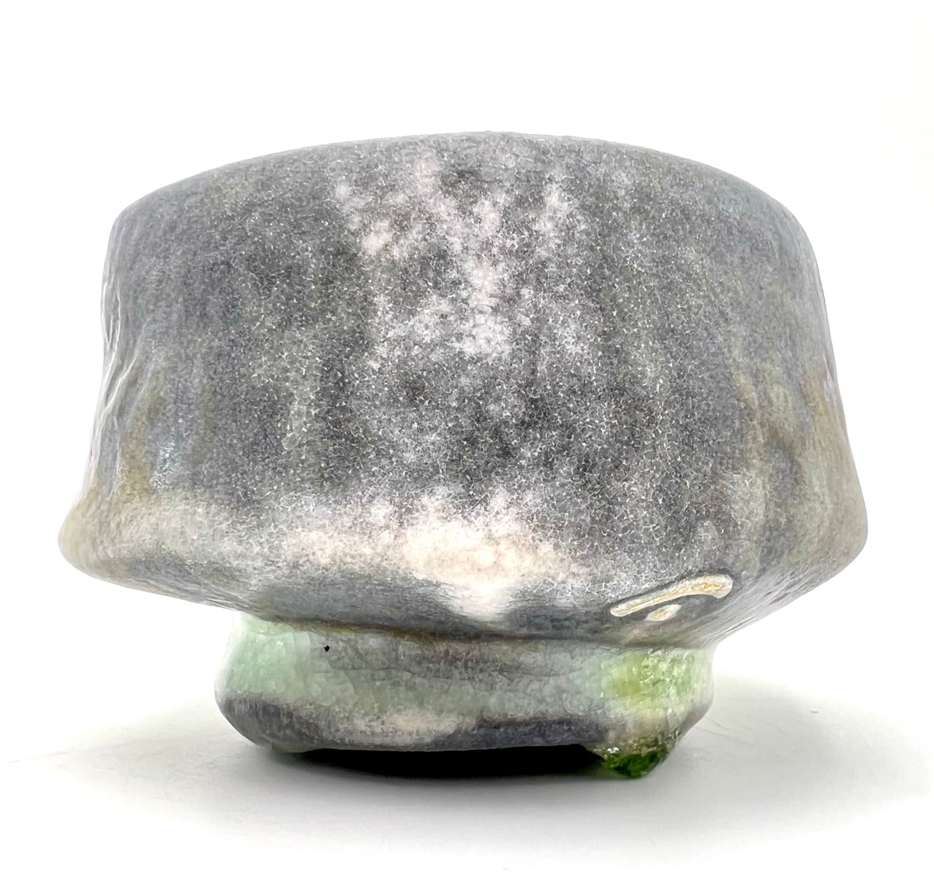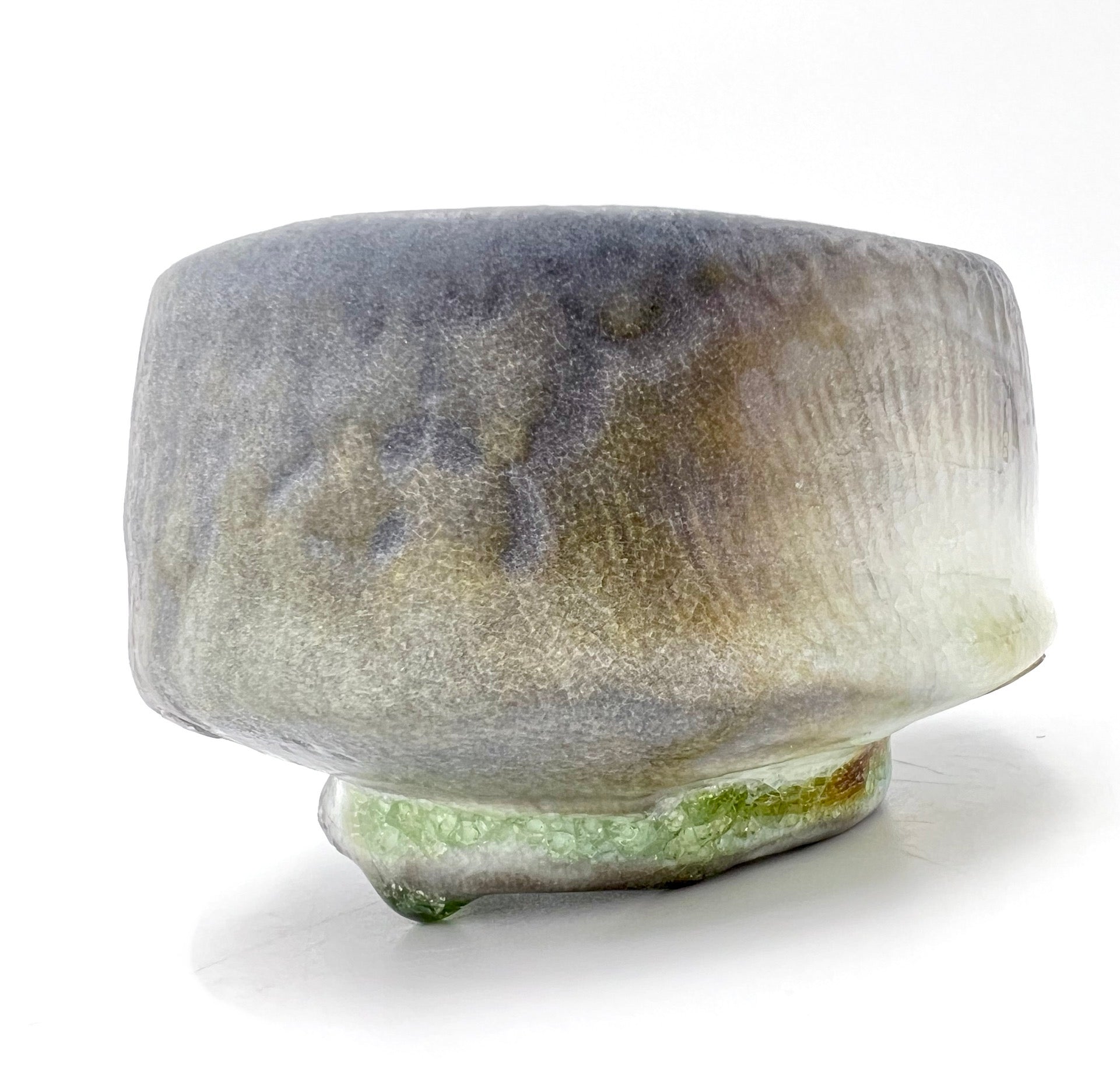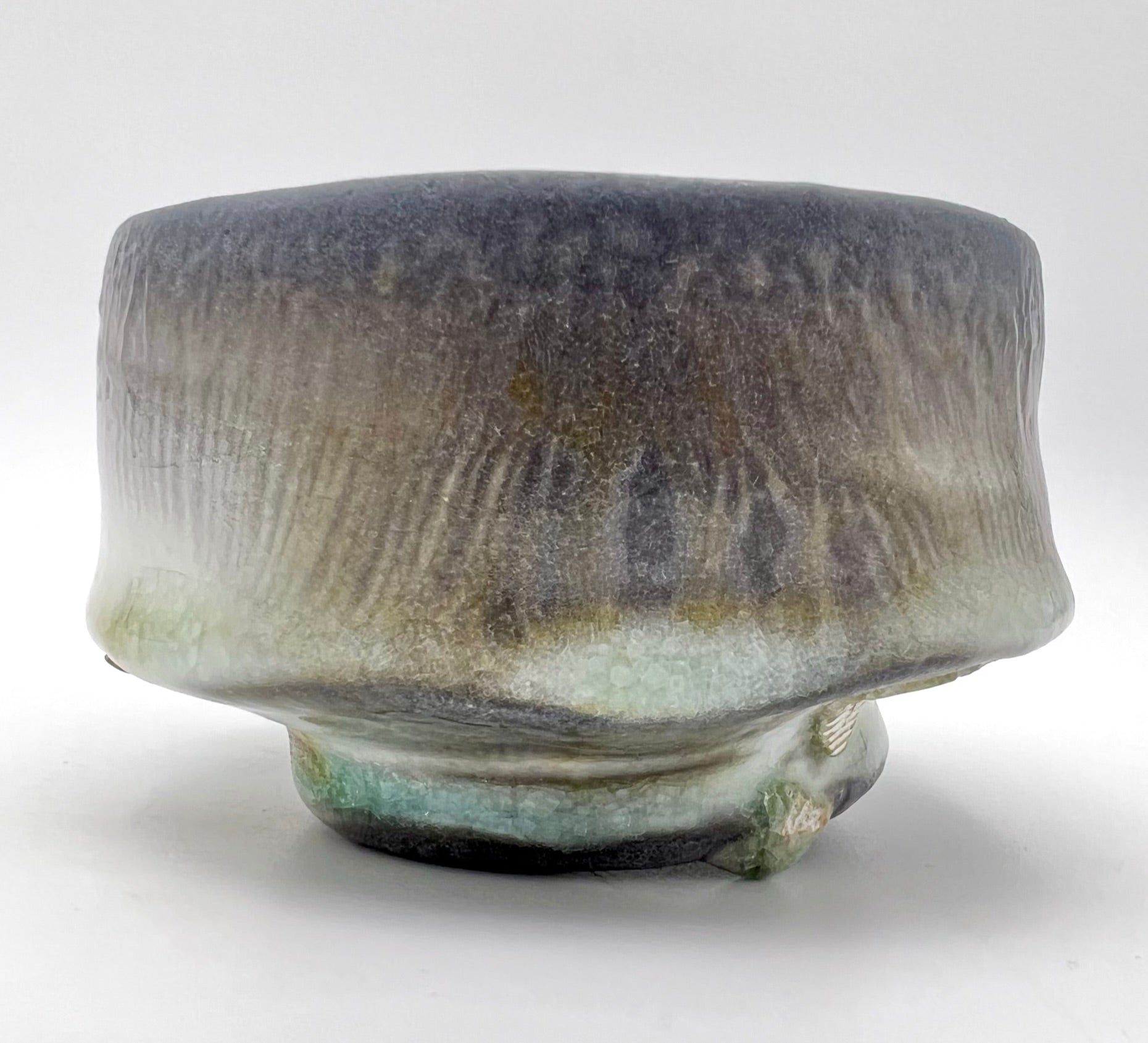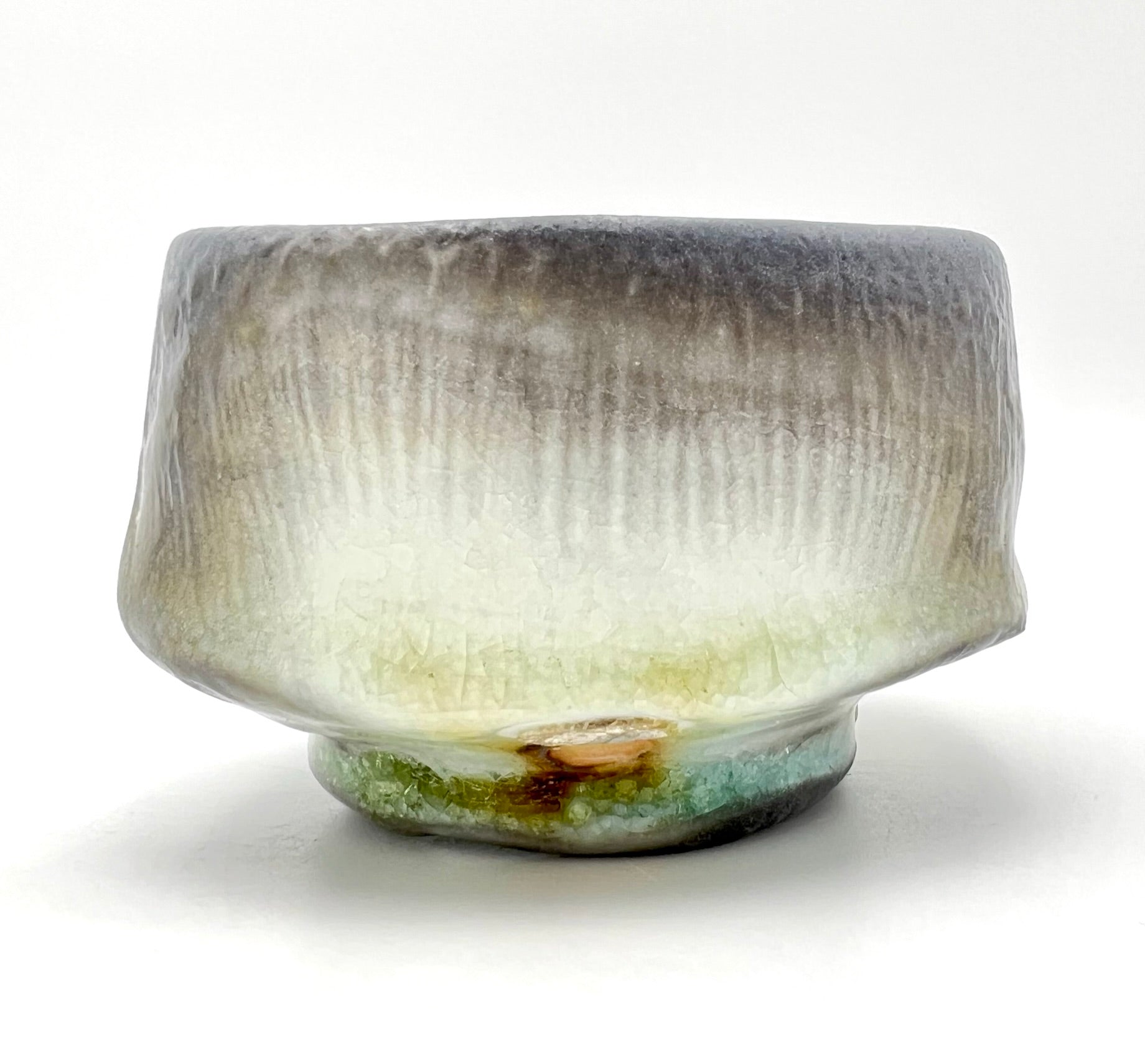 I threw this woodfired chawan on the potters wheel of NZ clay. It was lined with a Penn State Shino containing 10% rutile. A little got on the outside. This short, footed cup was fired on seashells in an anagama for days. Note how the wood ash mingled with the glaze, and flowed down the sides. A rainbow of hares fur graces the transitions between matte and gloss. Pools of wood ash have immortalized the shells that held this cup aloft in the kiln. It measures 2.5 inches tall and 4 wide.
