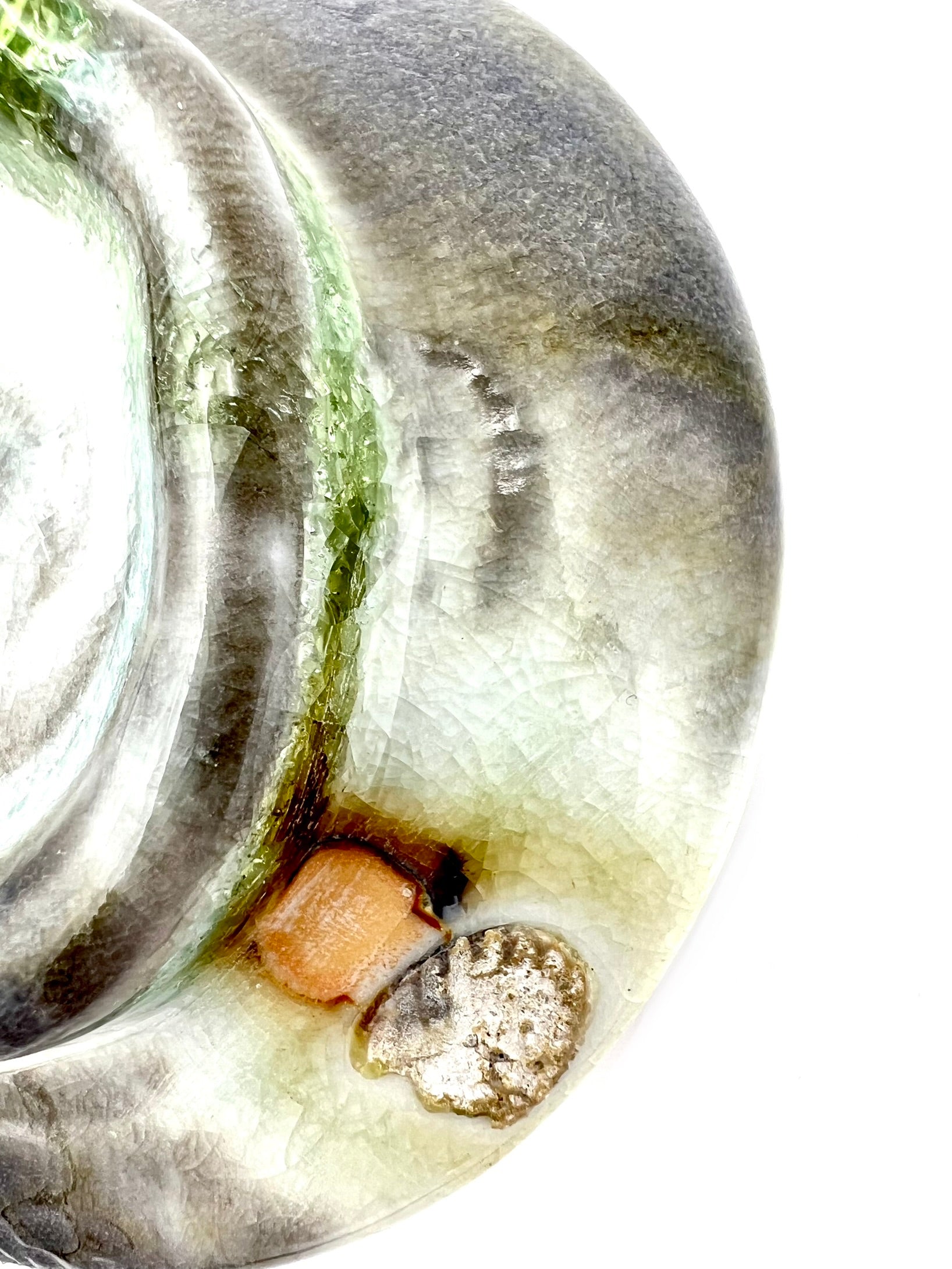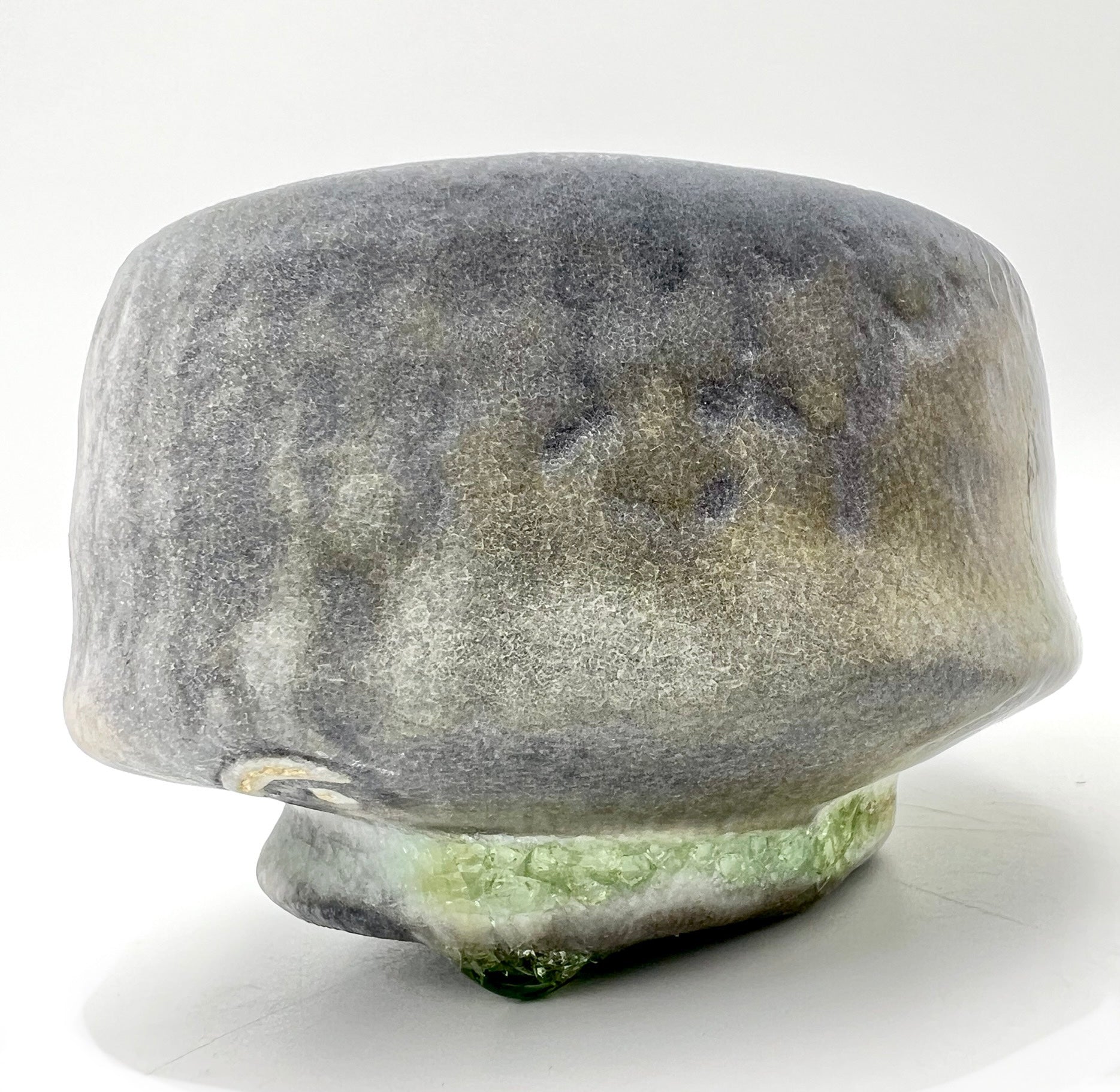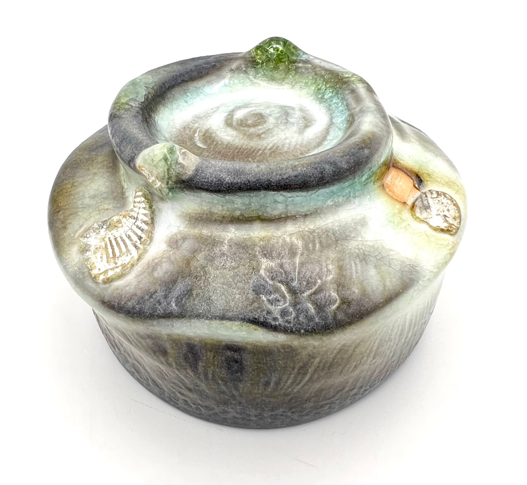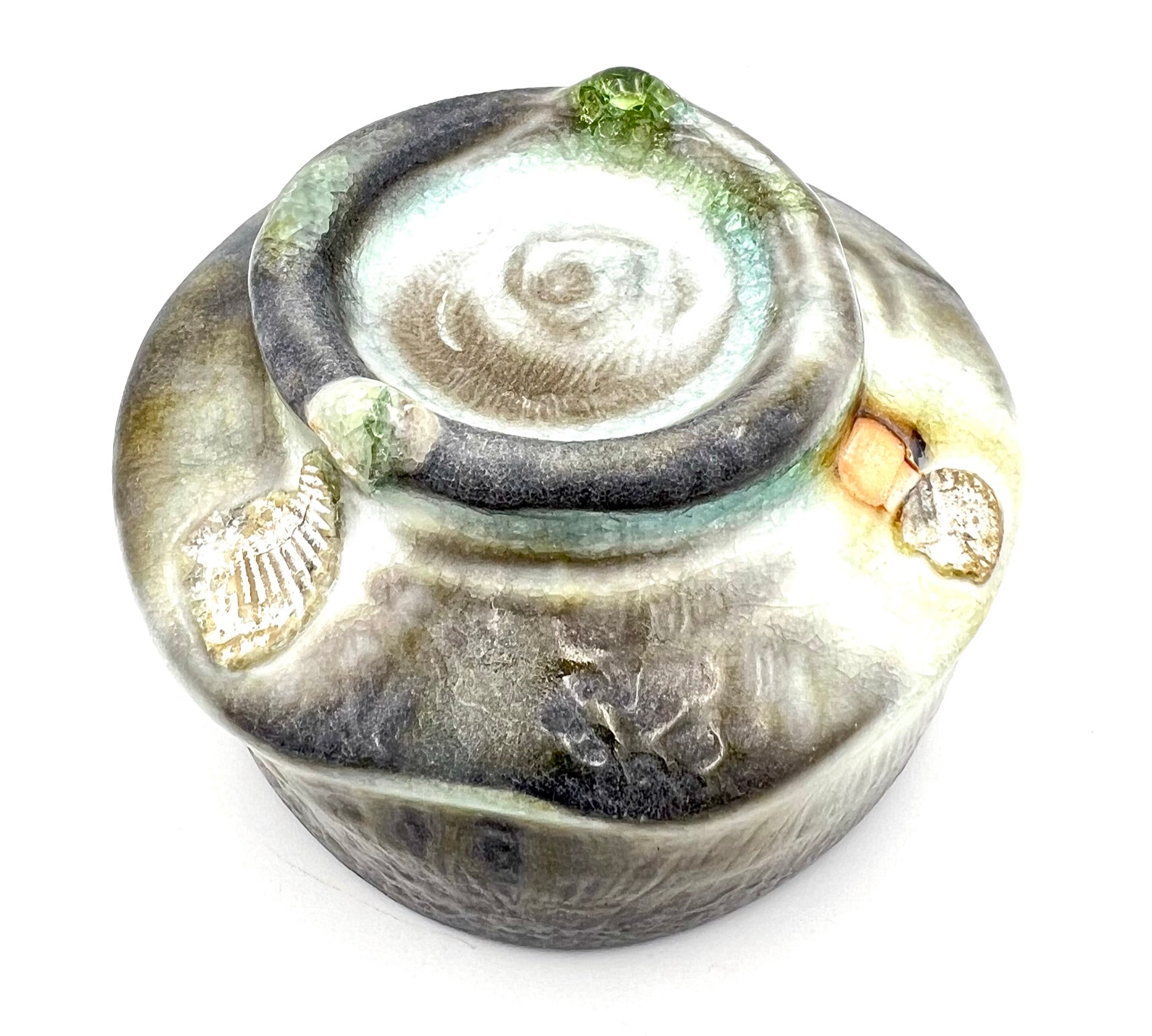 I threw this woodfired chawan on the potters wheel of NZ clay. It was lined with a Penn State Shino containing 10% rutile. A little got on the outside. This short, footed cup was fired on seashells in an anagama for days. Note how the wood ash mingled with the glaze, and flowed down the sides. A rainbow of hares fur graces the transitions between matte and gloss. Pools of wood ash have immortalized the shells that held this cup aloft in the kiln. It measures 2.5 inches tall and 4 wide.