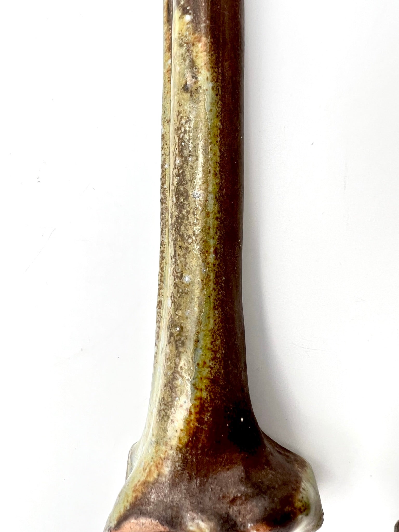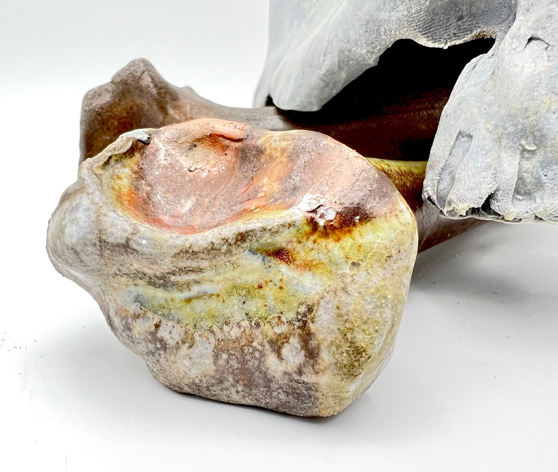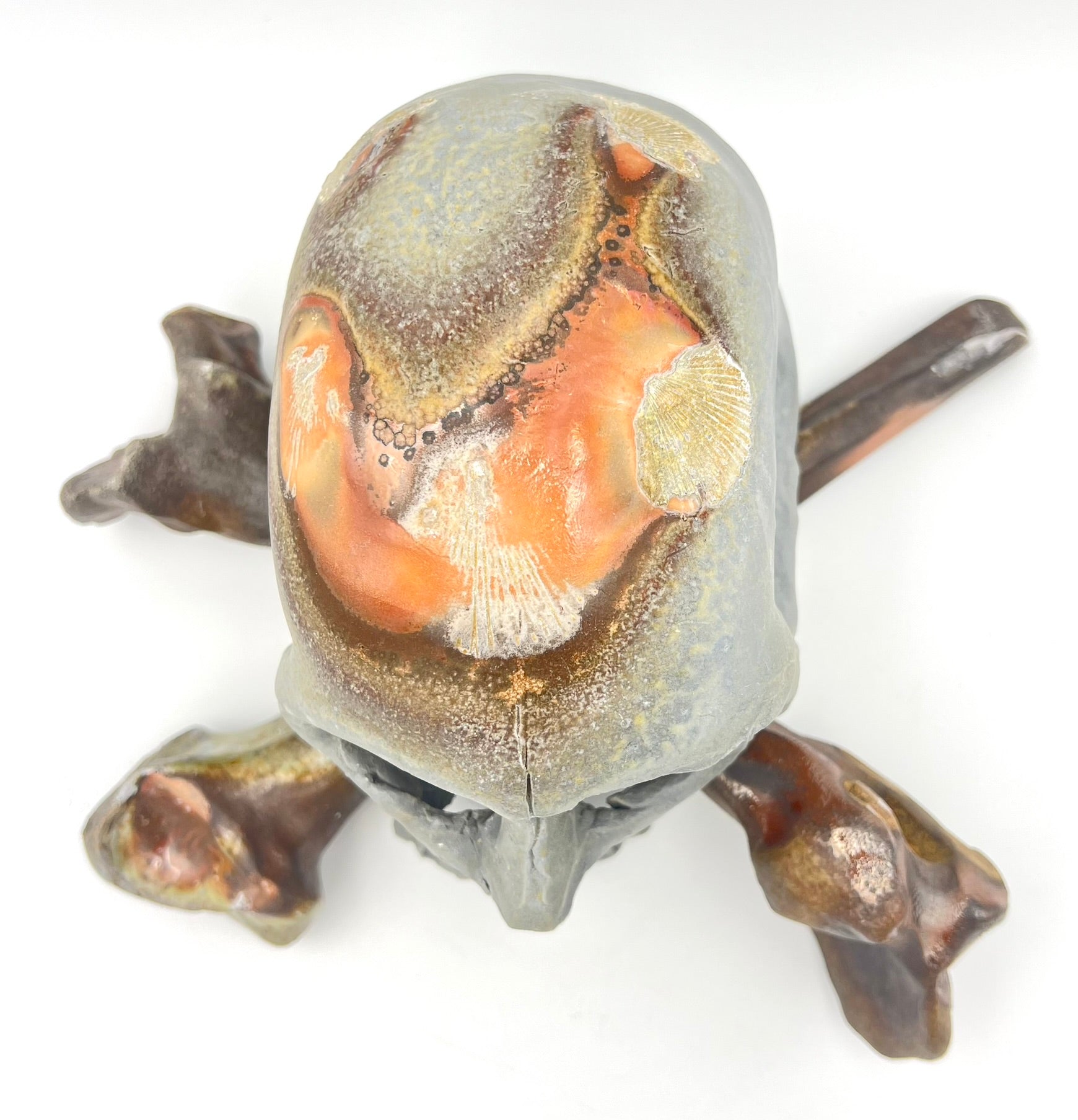 This skull was thrown on the potters wheel of Mac10 clay. When it hardened up a little, I used a harp wire tool to carve out the shape. Then I fashioned tooth sockets with a wooden knife. It was fired upside-down on seashells in an anagama for many days. The 11" porcelaneous stoneware bones were tumble stacked near the middle firebox. Skull measures 6"x 5"x 7".