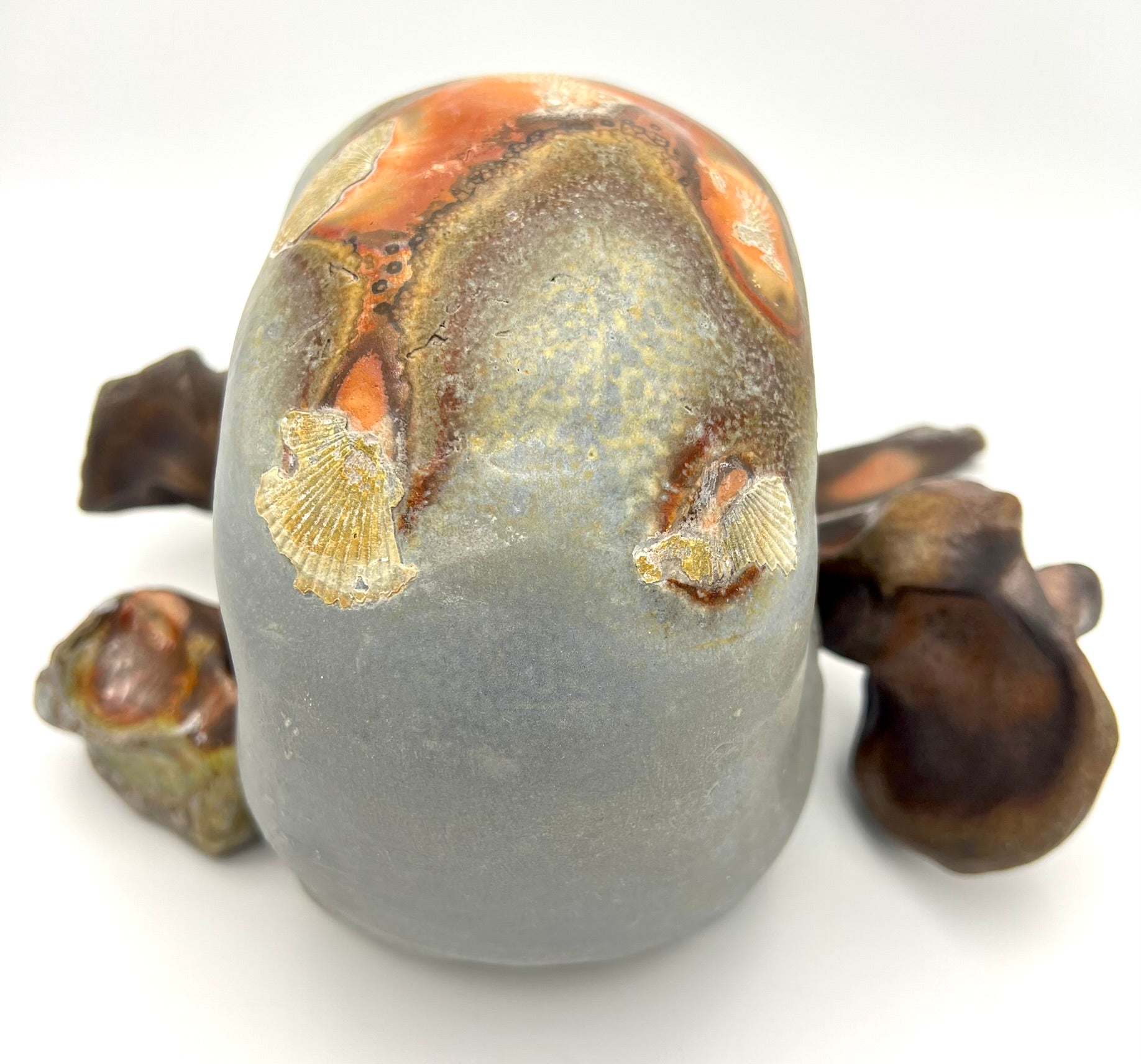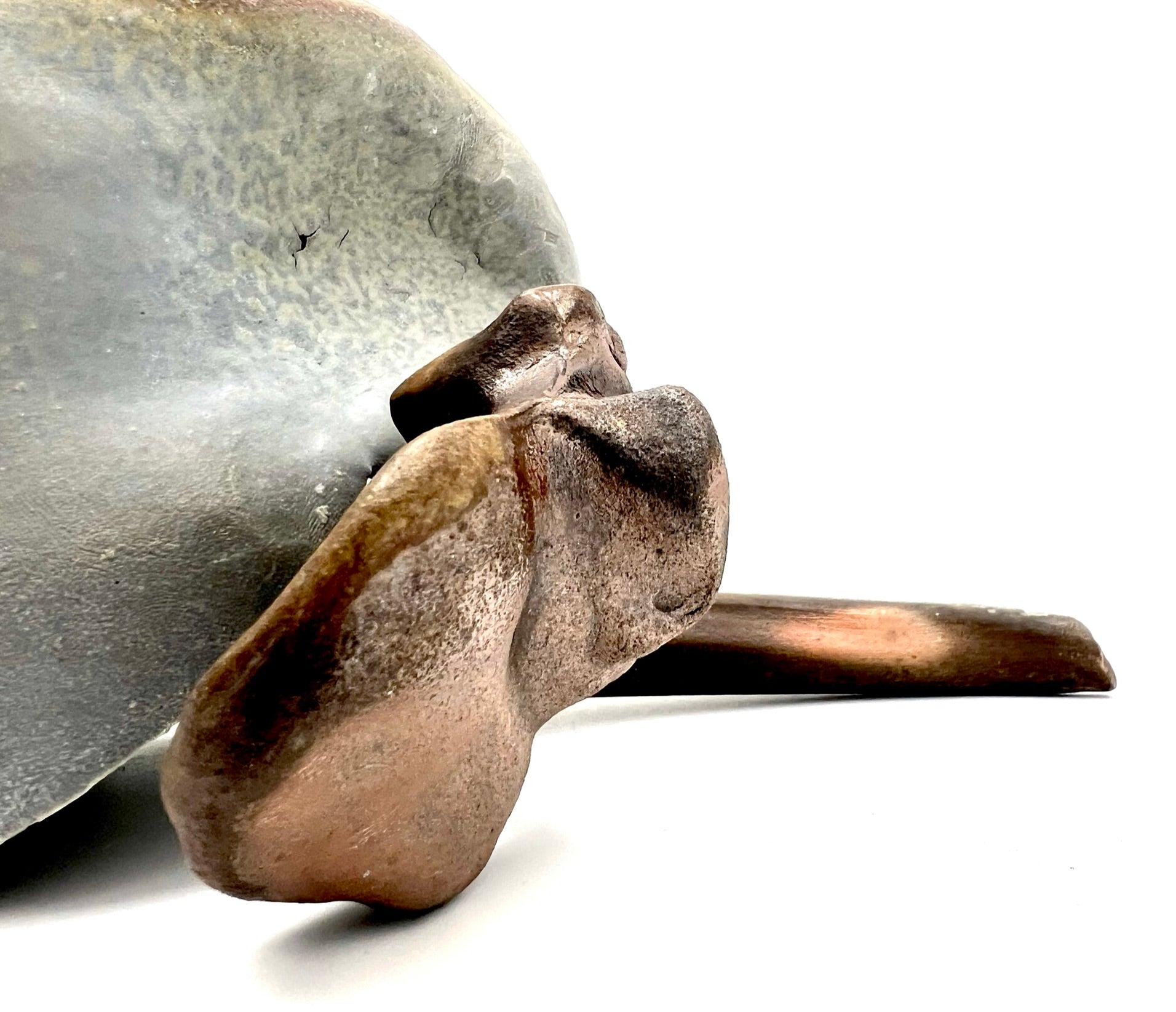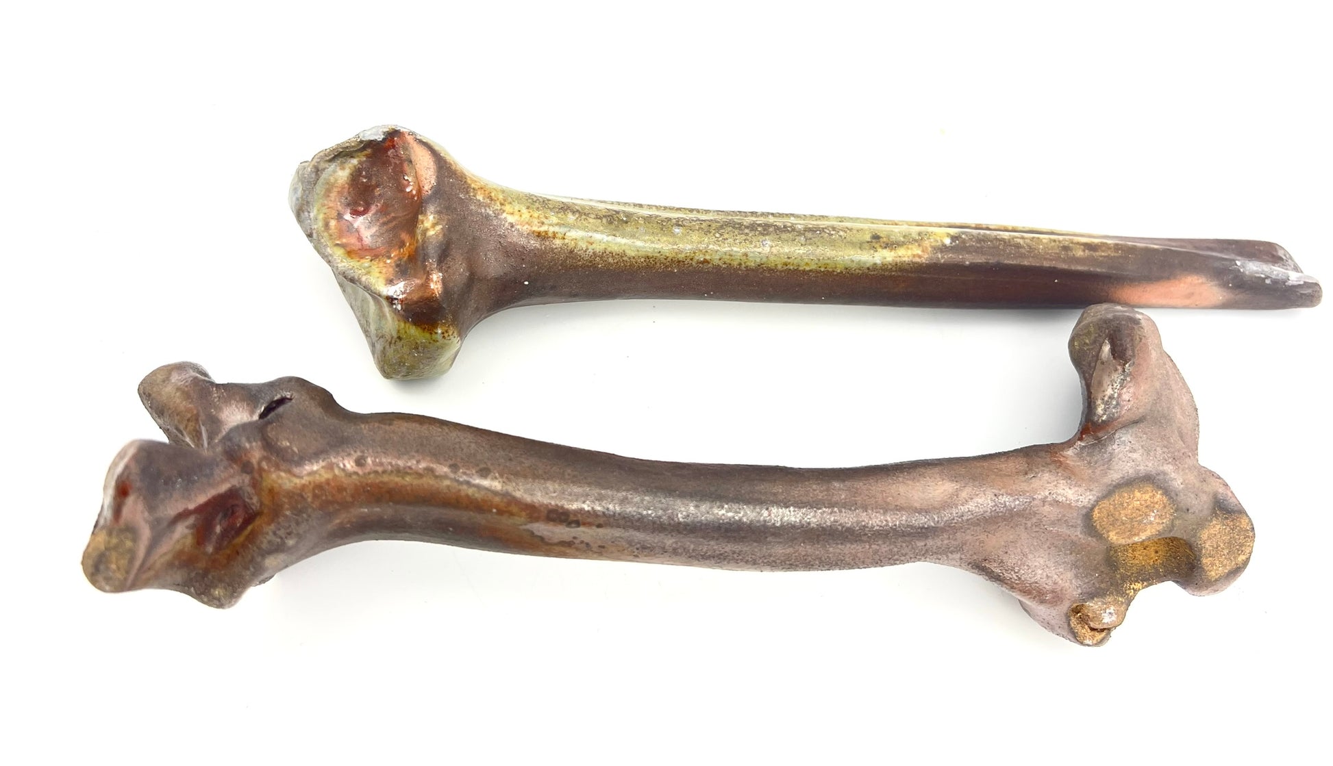 This skull was thrown on the potters wheel of Mac10 clay. When it hardened up a little, I used a harp wire tool to carve out the shape. Then I fashioned tooth sockets with a wooden knife. It was fired upside-down on seashells in an anagama for many days. The 11" porcelaneous stoneware bones were tumble stacked near the middle firebox. Skull measures 6"x 5"x 7".