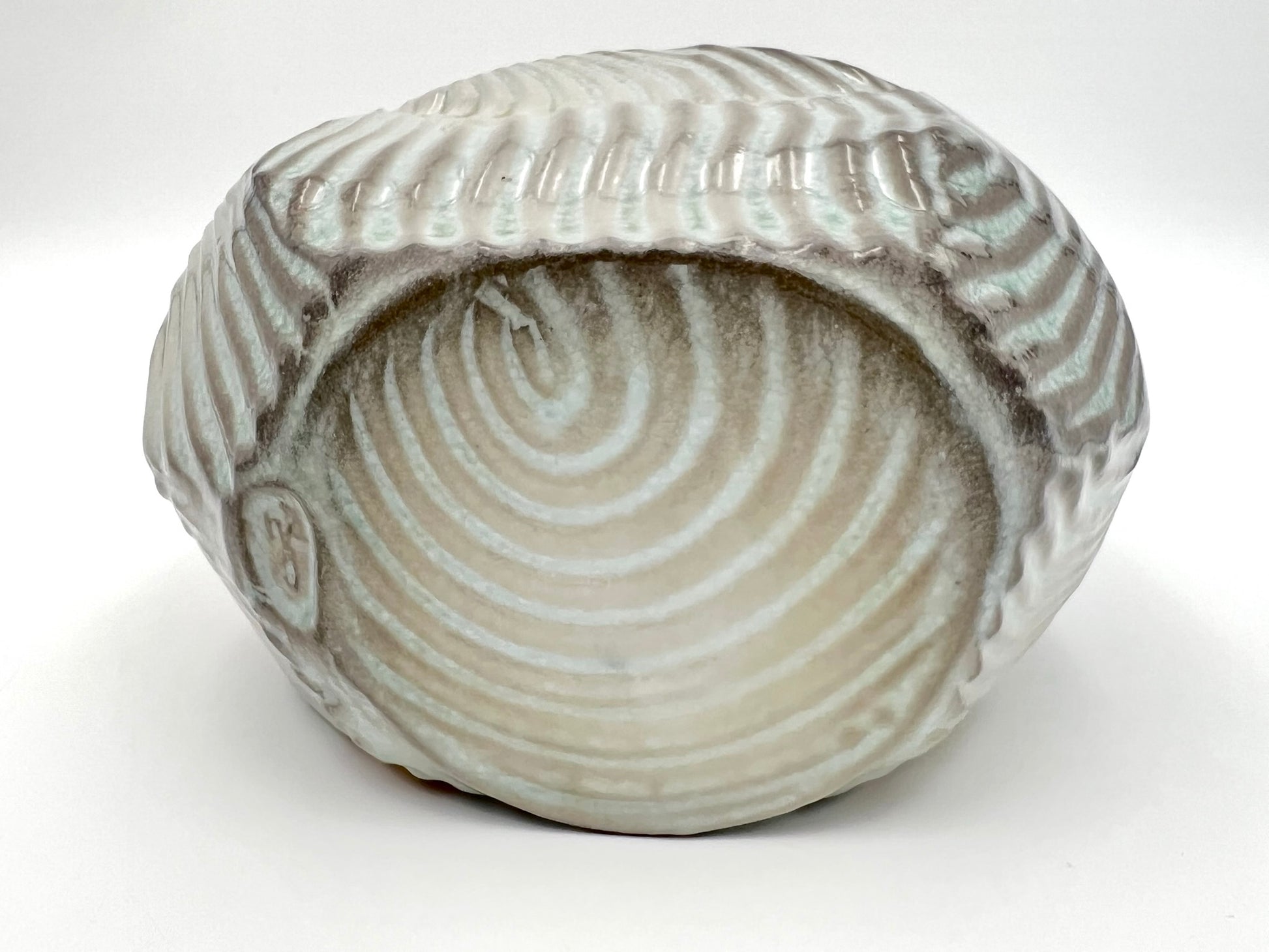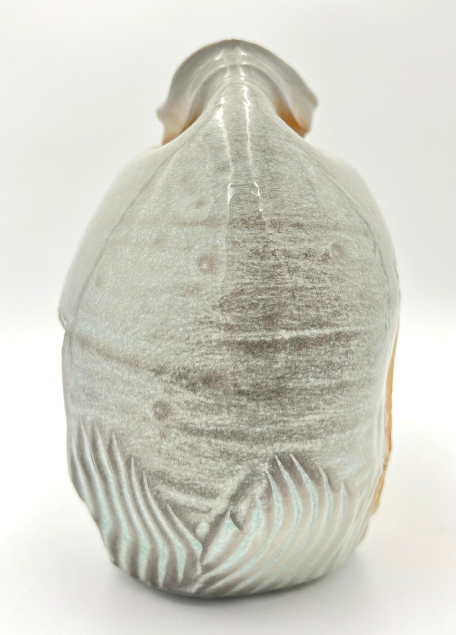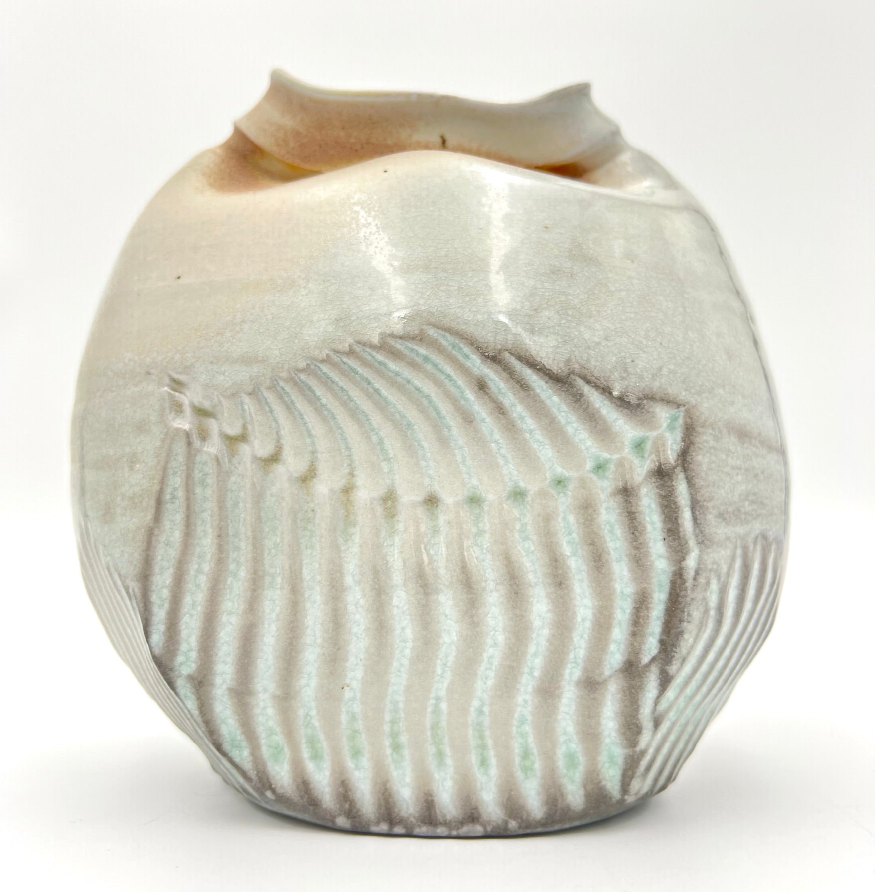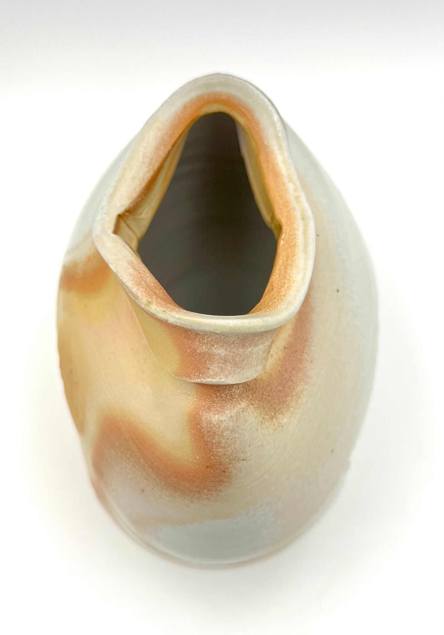 This vase was thrown of NZ clay and altered on the wheel. I love the gesture of the mouth on this one. It really reminds me of a fish. The vase was fired on its side in an anagama for many days. The ash collected just how I wanted on the wiggle wire surface. Its so beautiful. The vase measures 6.5 inches tall. 6 inches at its widest, and 3.5 at the narrow.