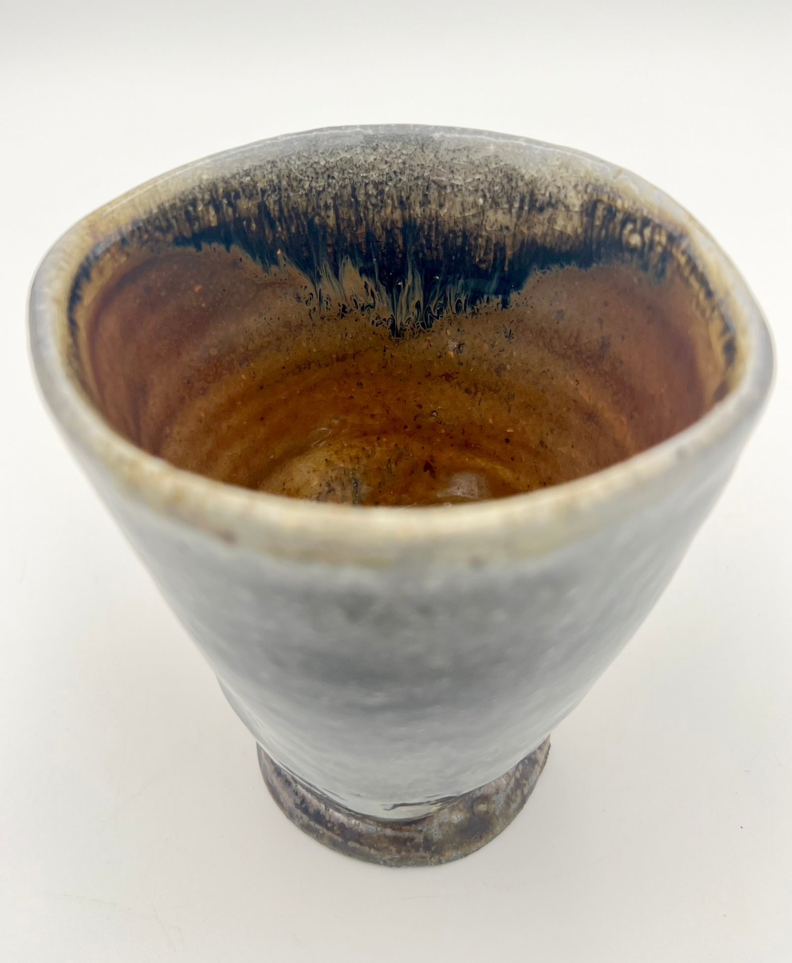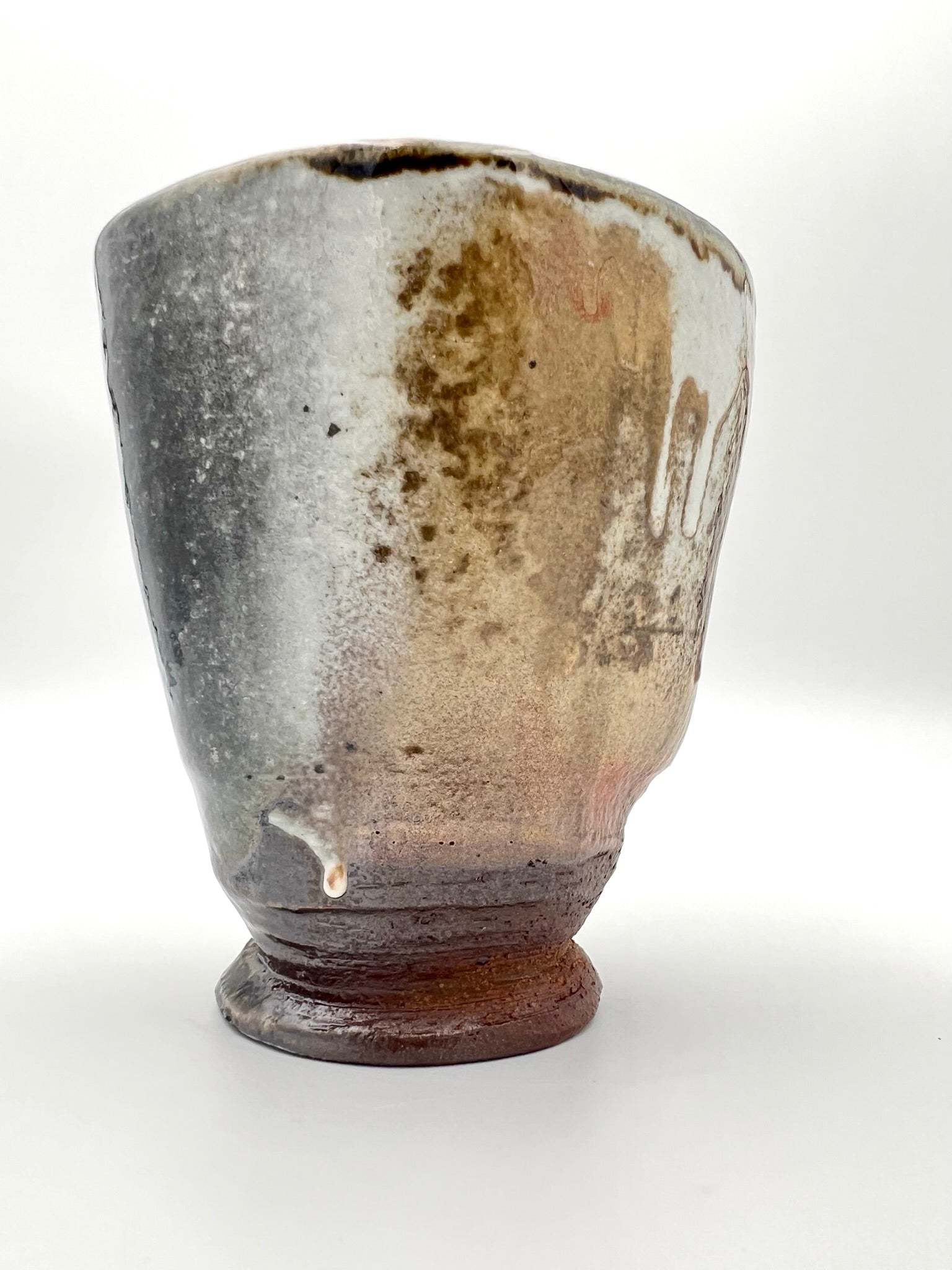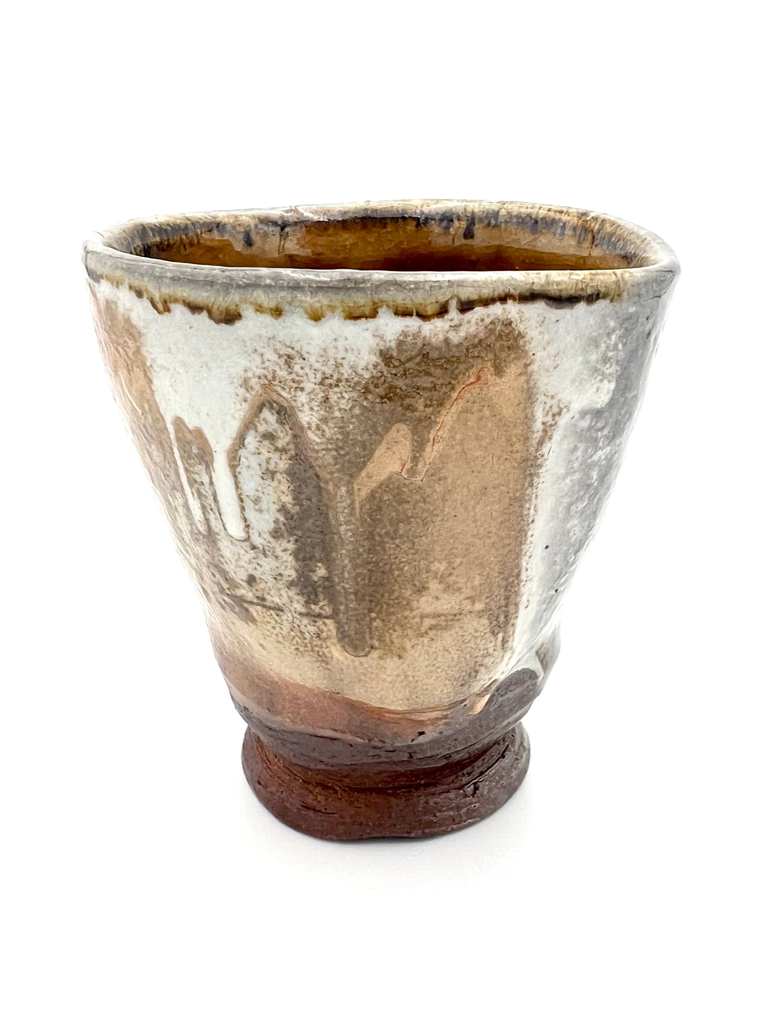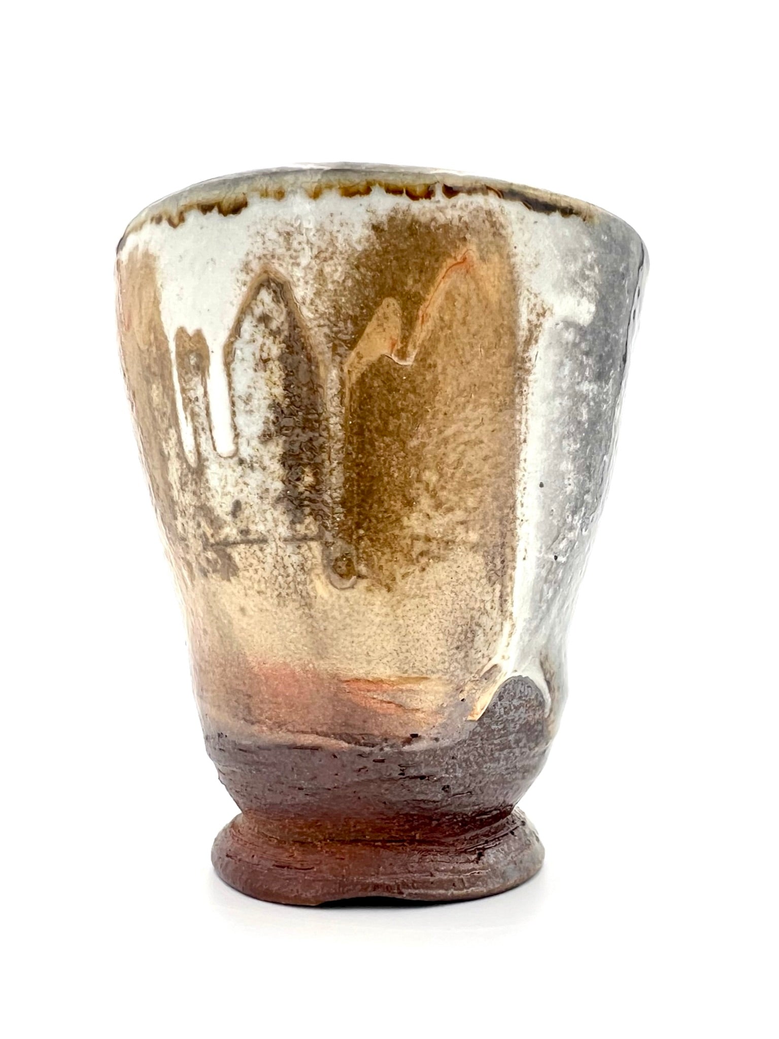 I threw this small tumbler on the potters wheel of a mix between Little John and Helmar clay from 1999. It was slipped in a couple layers of FC Ball slip. It was lined in Penn State shino with 10% rutile. It was fired in a wood/soda kiln for 30+ hours. It measures 4 inches tall and holds 10 oz. This cup is golden.