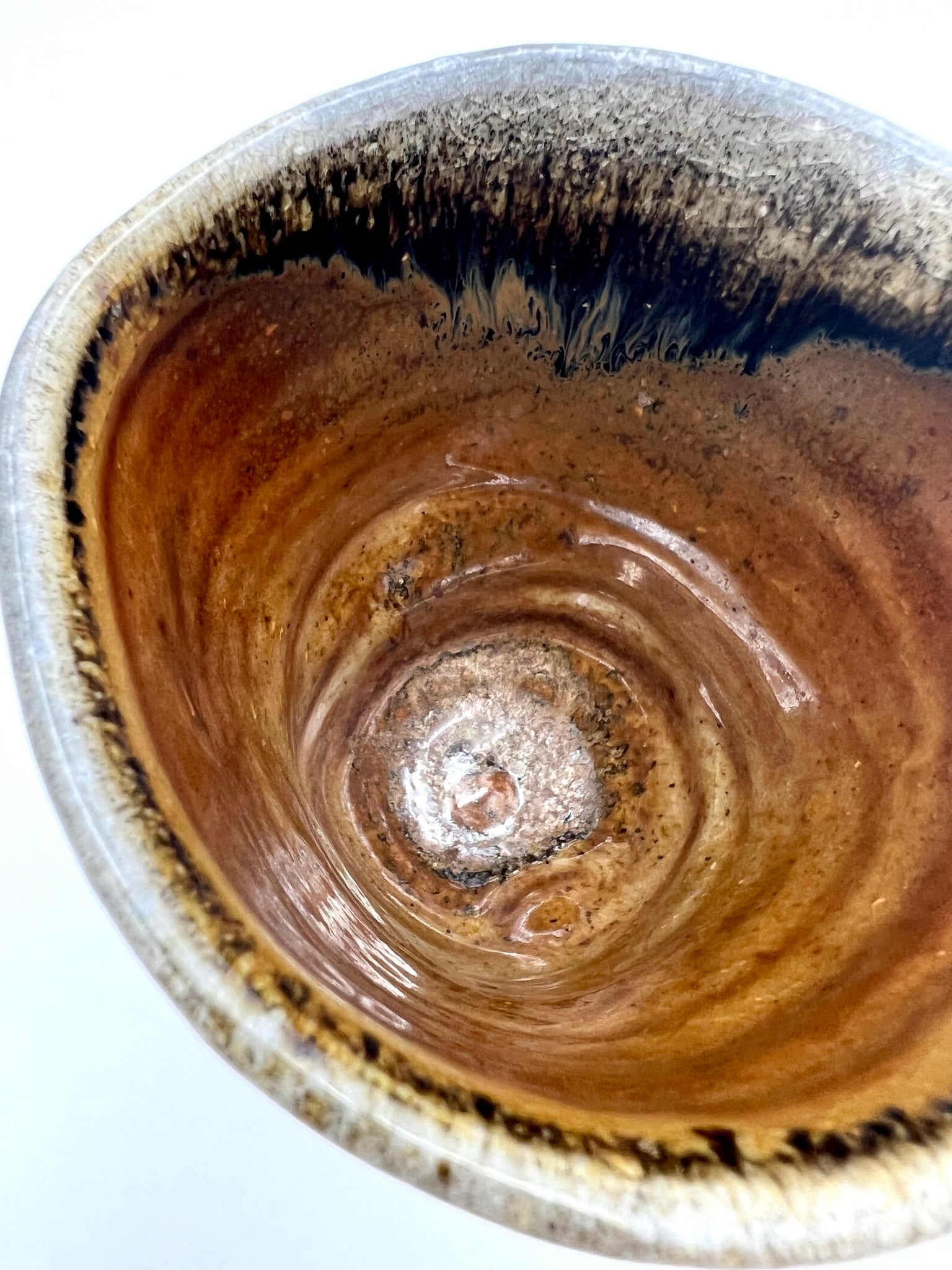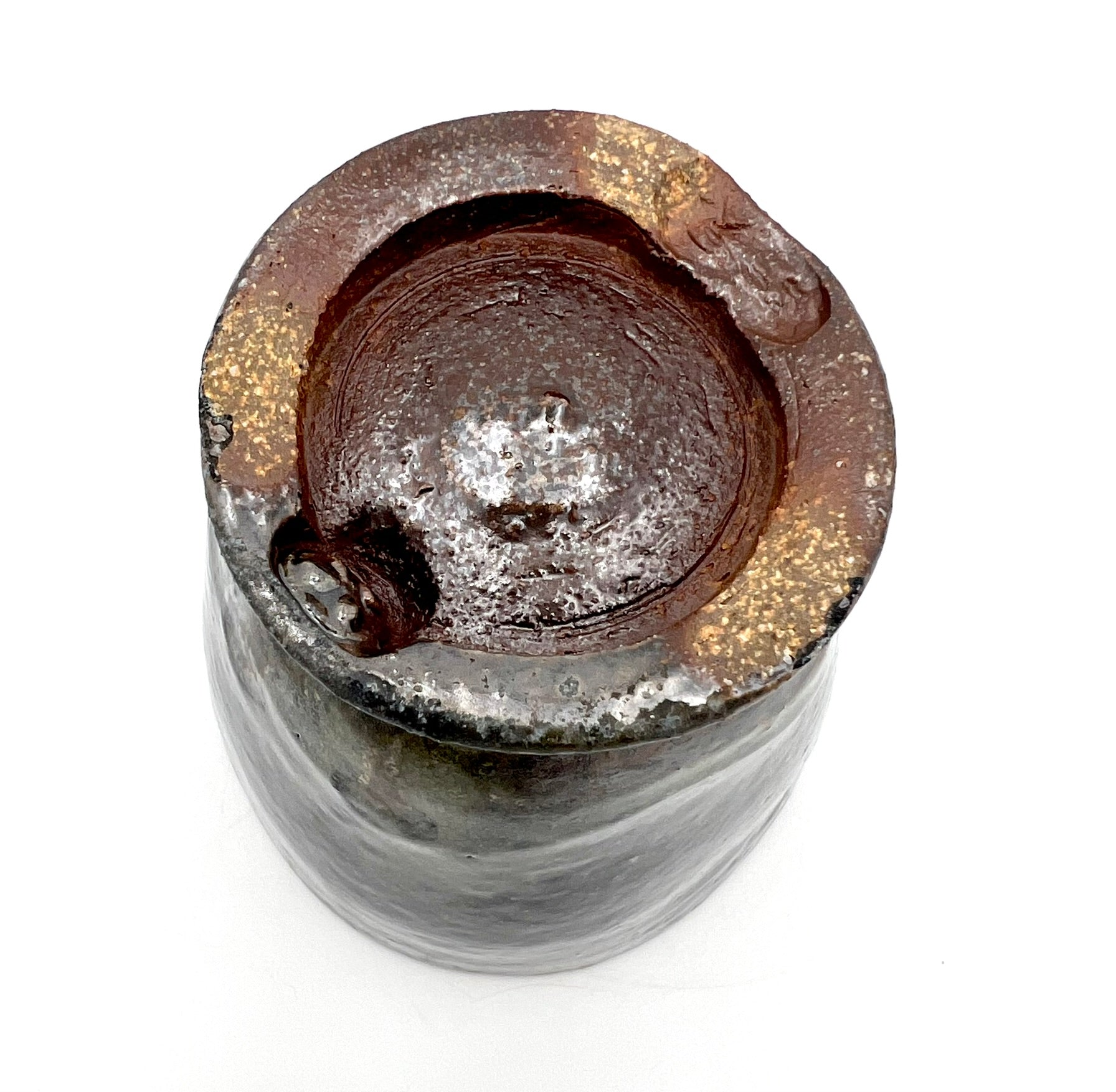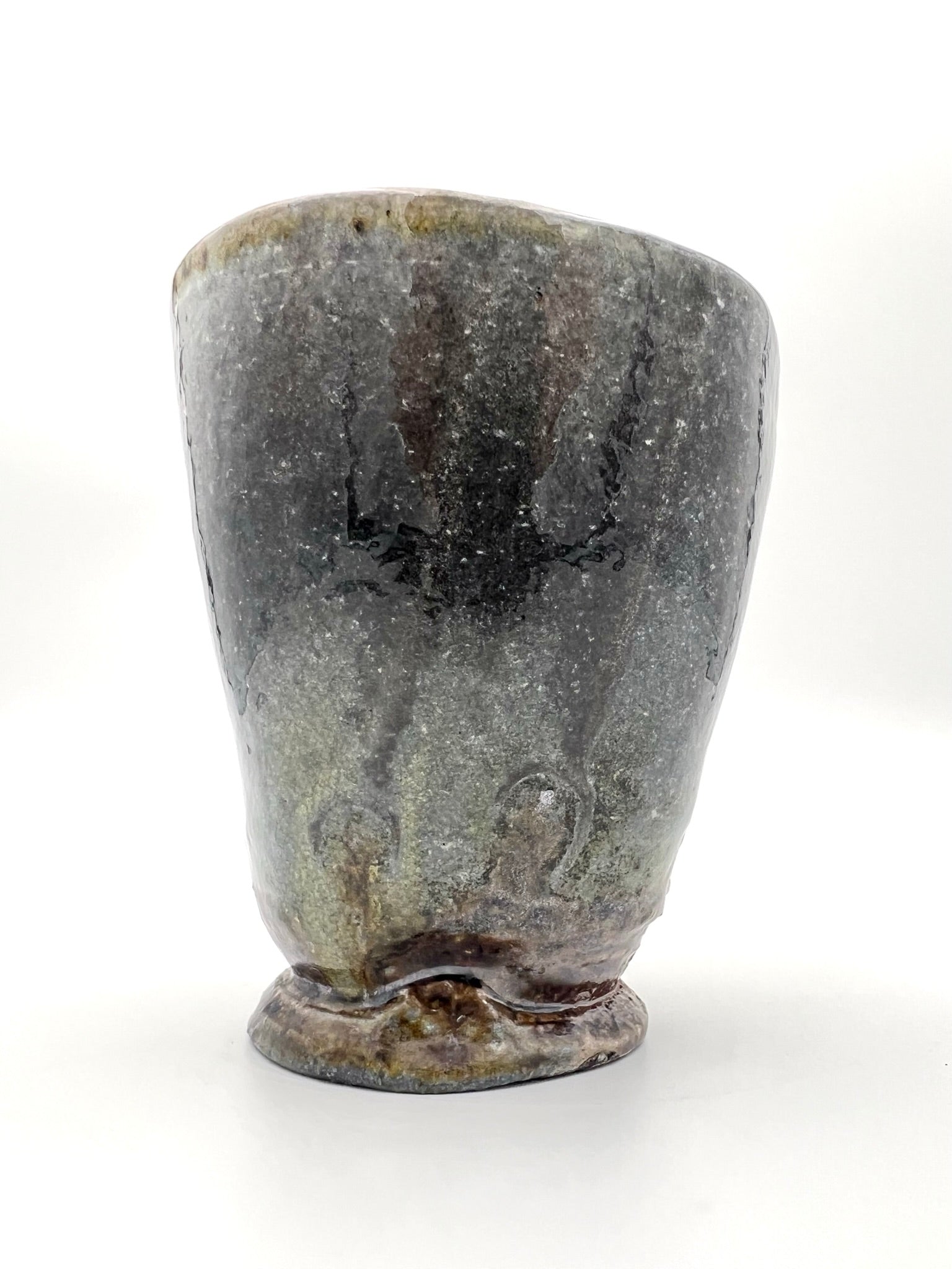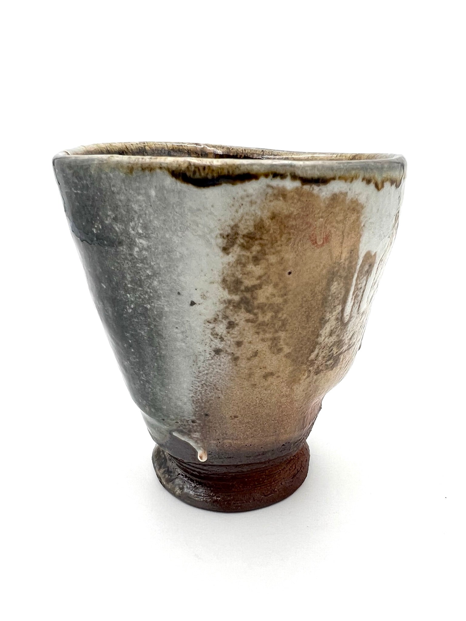 I threw this small tumbler on the potters wheel of a mix between Little John and Helmar clay from 1999. It was slipped in a couple layers of FC Ball slip. It was lined in Penn State shino with 10% rutile. It was fired in a wood/soda kiln for 30+ hours. It measures 4 inches tall and holds 10 oz. This cup is golden.