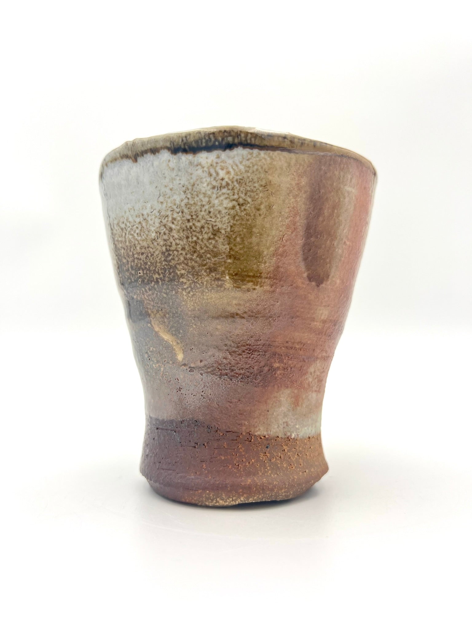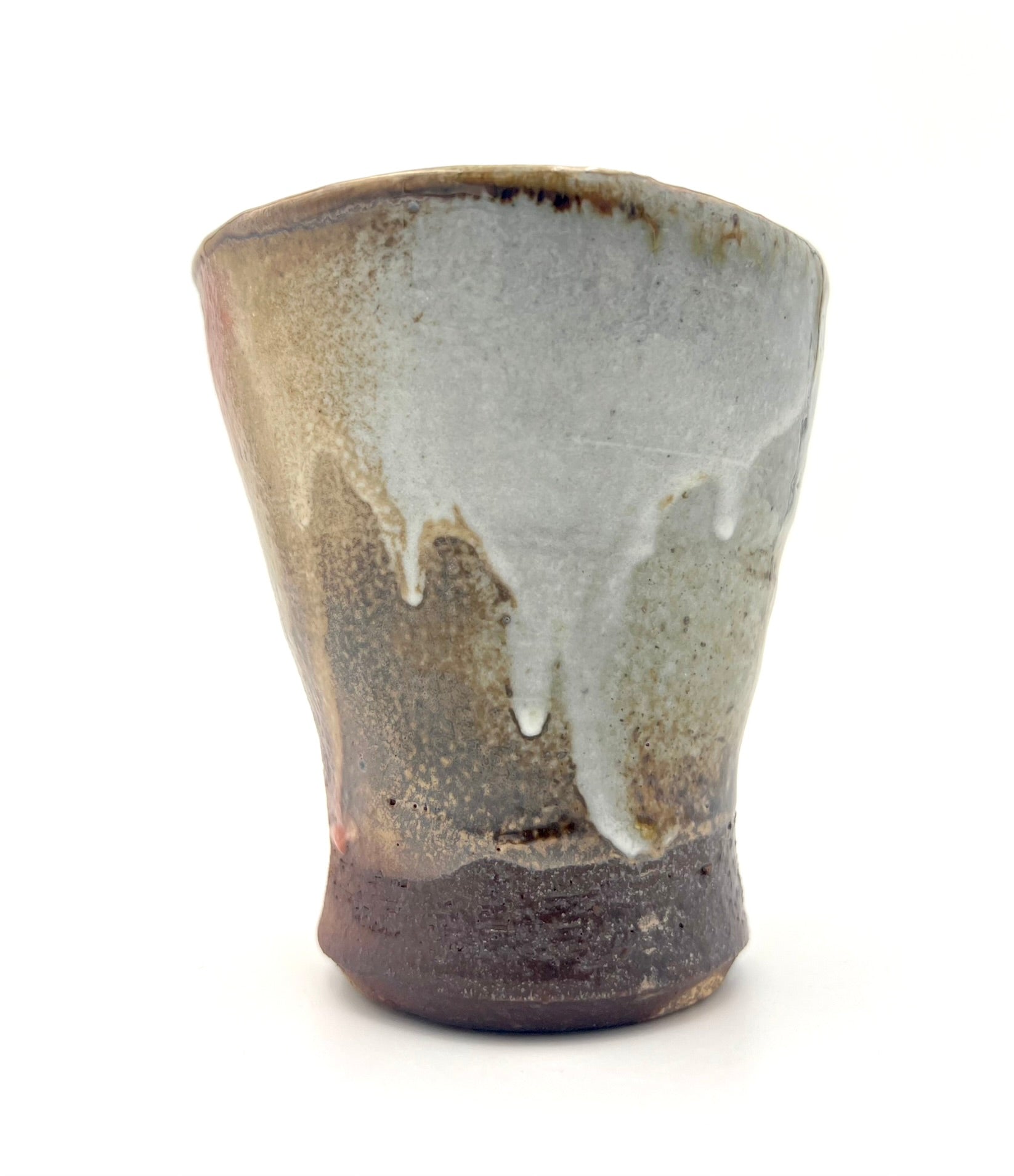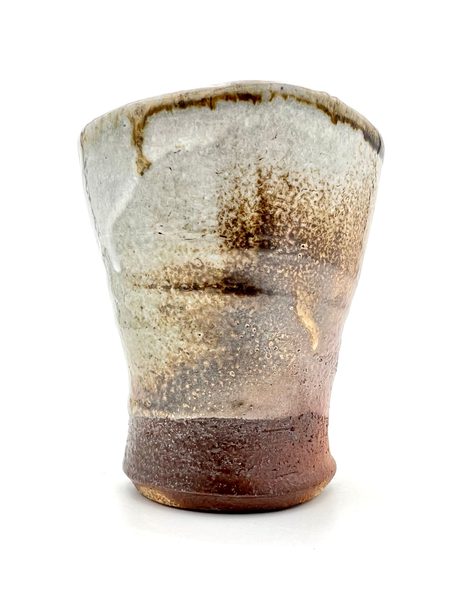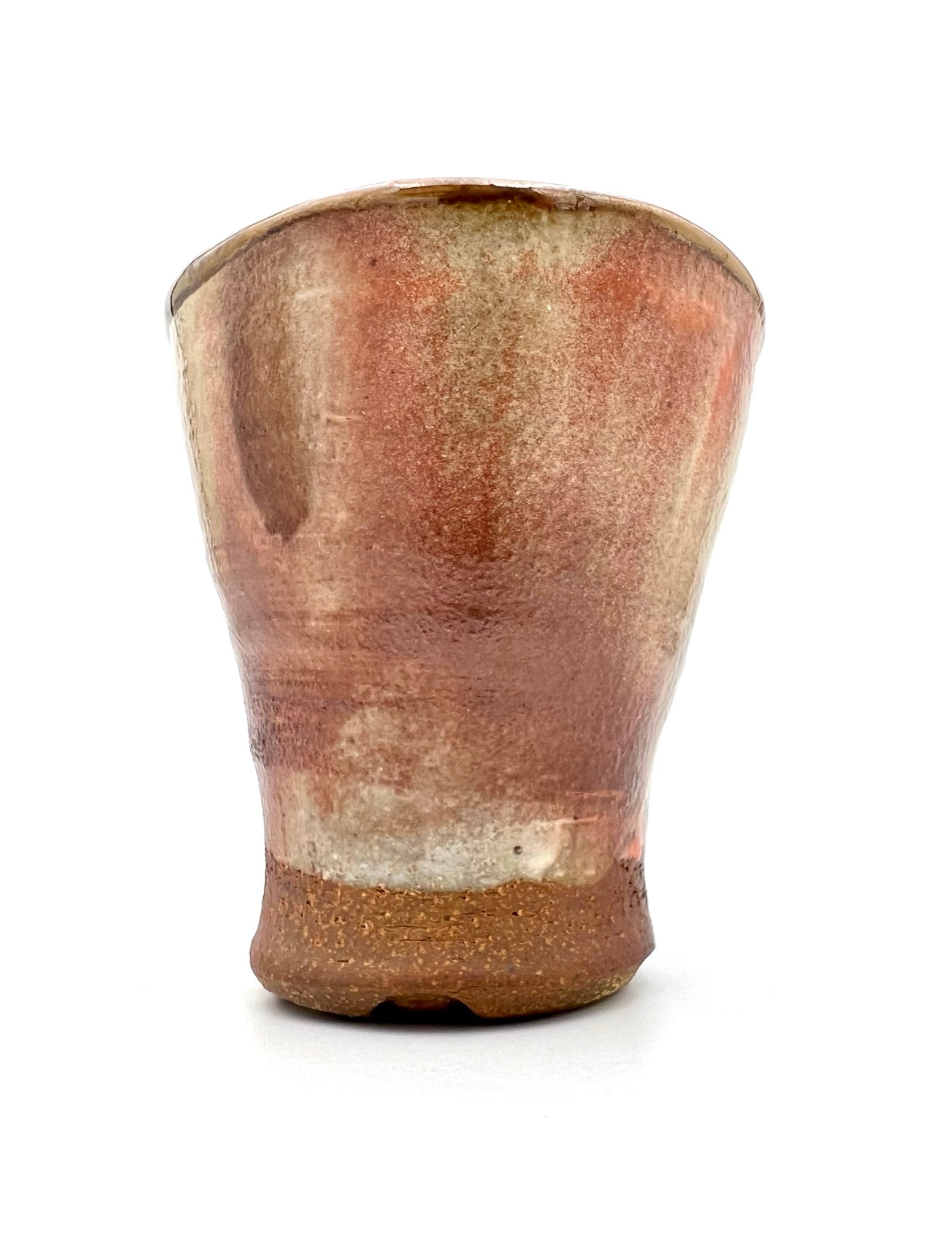 I threw this small tumbler on the potters wheel of a mix between Little John and Helmar clay from 1999. It was slipped in a couple layers of FC Ball slip. It is lined with Penn State Shino with 10% rutile. It was fired in a wood/soda kiln for 30+ hours. It measures 4-3/8 inches tall and holds 12 oz.