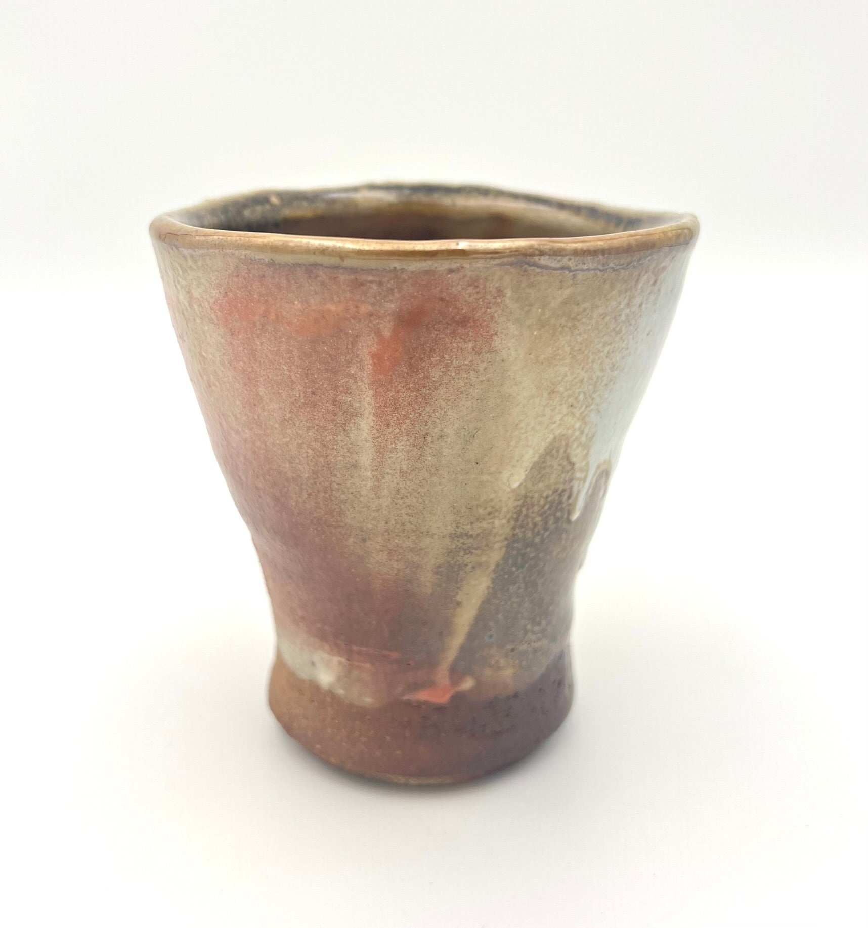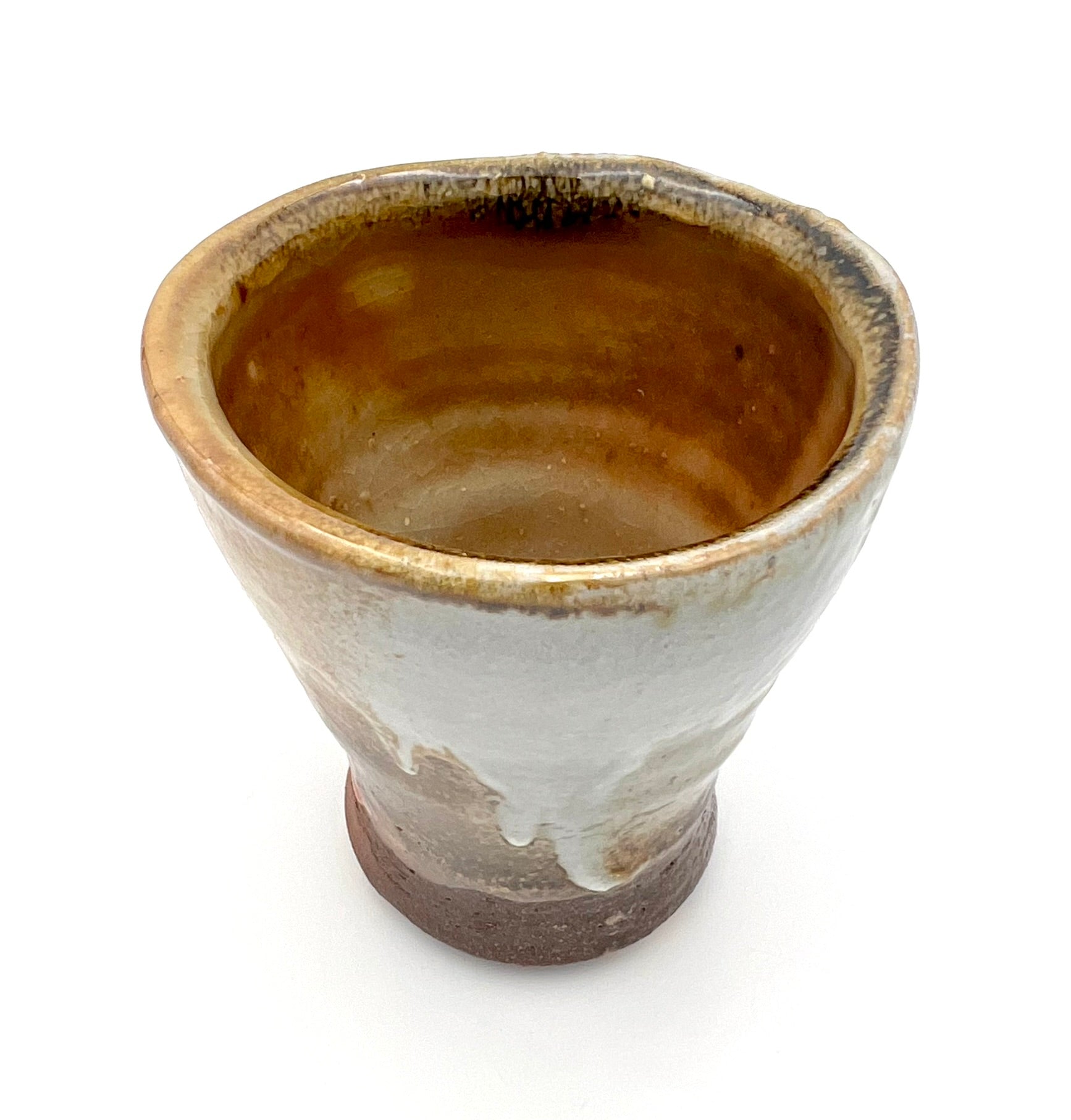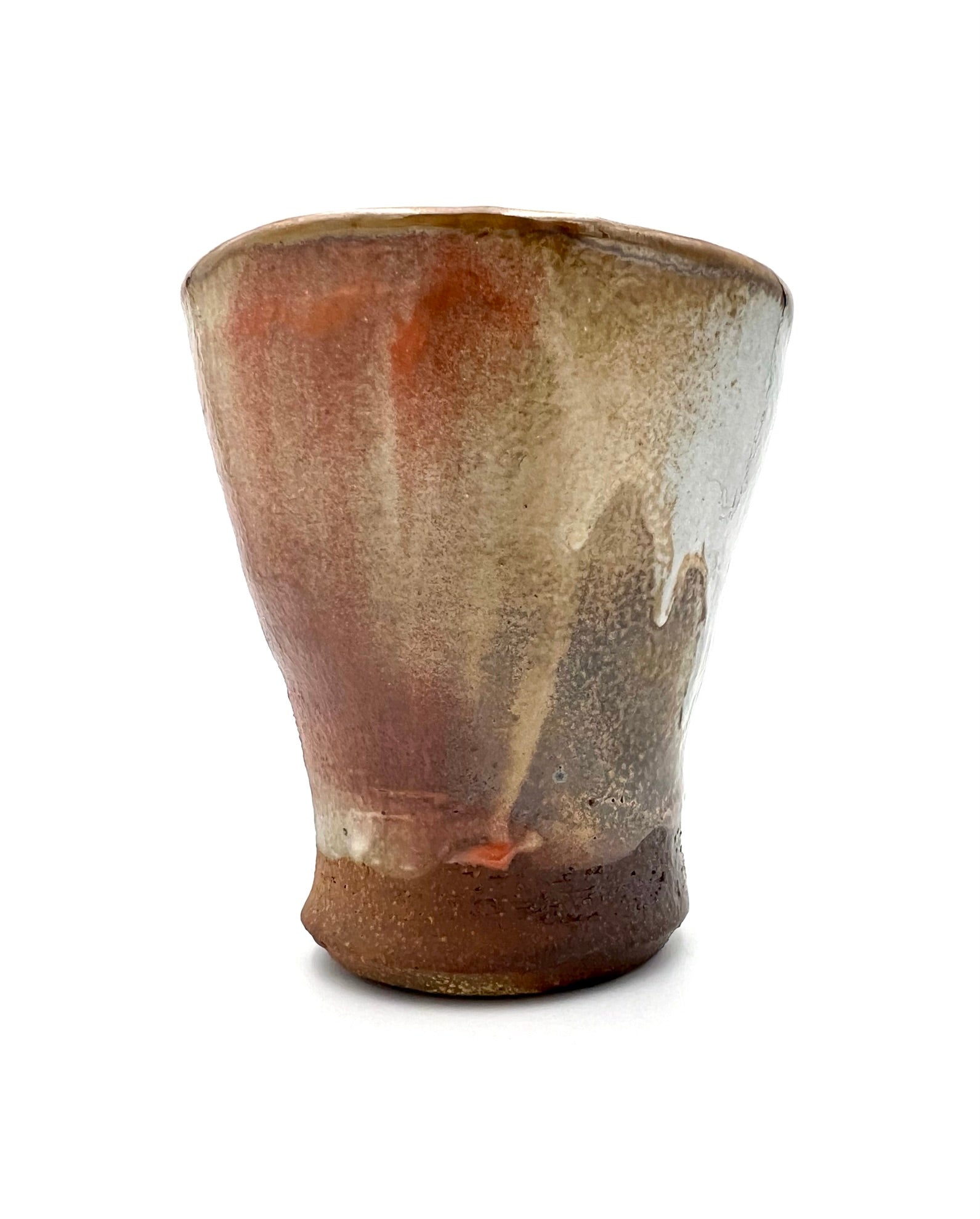 I threw this small tumbler on the potters wheel of a mix between Little John and Helmar clay from 1999. It was slipped in a couple layers of FC Ball slip. It is lined with Penn State Shino with 10% rutile. It was fired in a wood/soda kiln for 30+ hours. It measures 4-3/8 inches tall and holds 12 oz.
