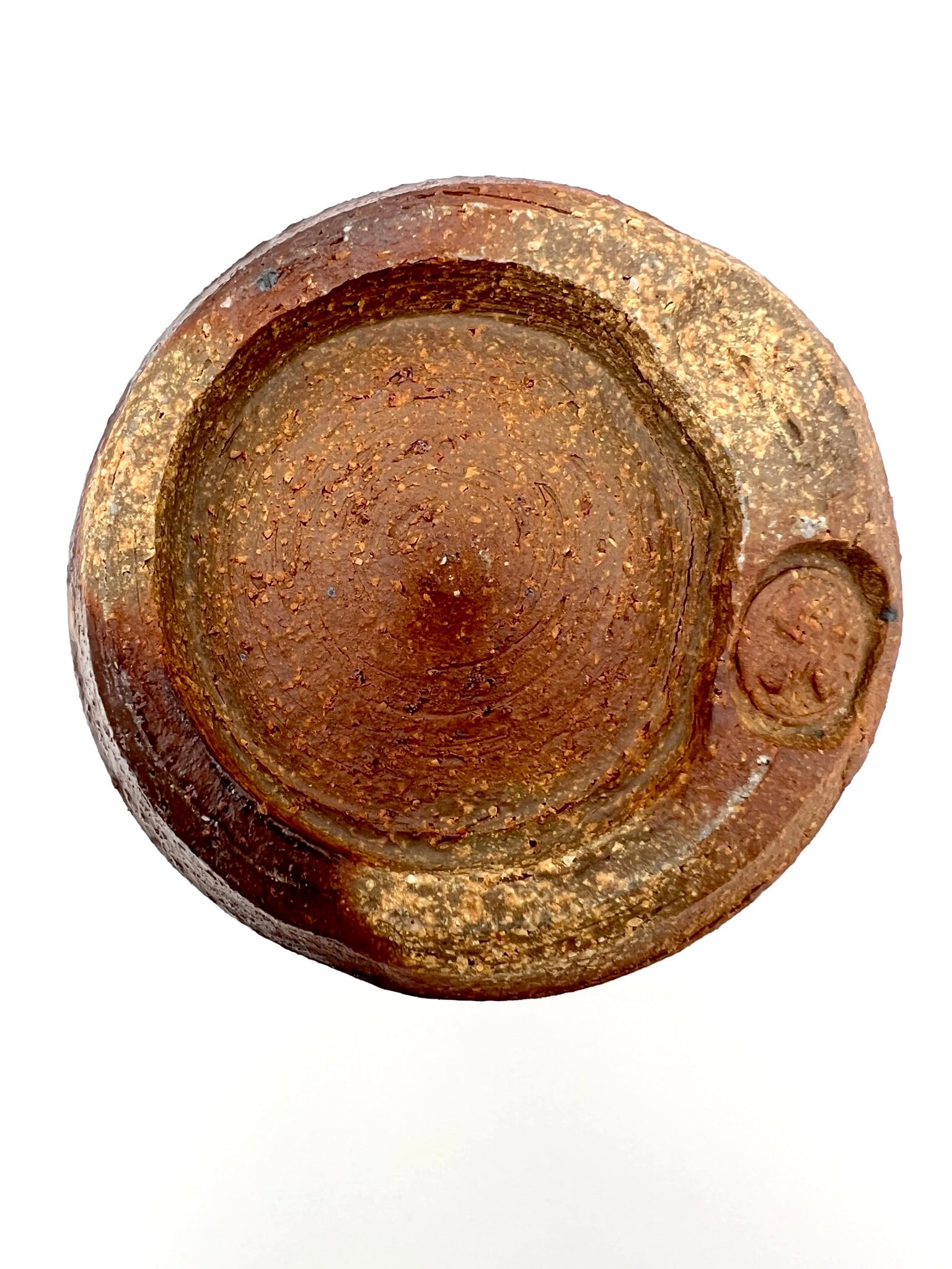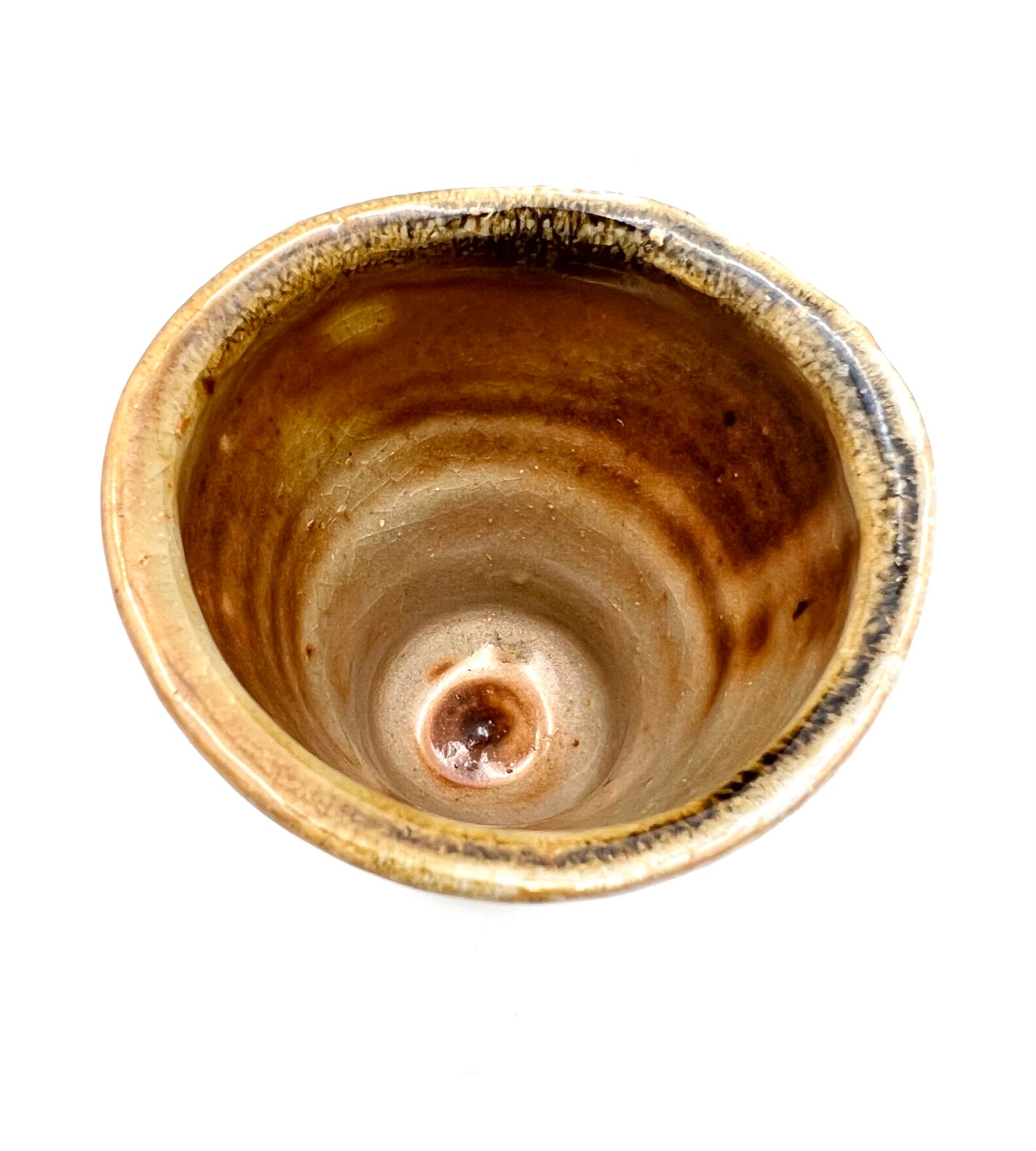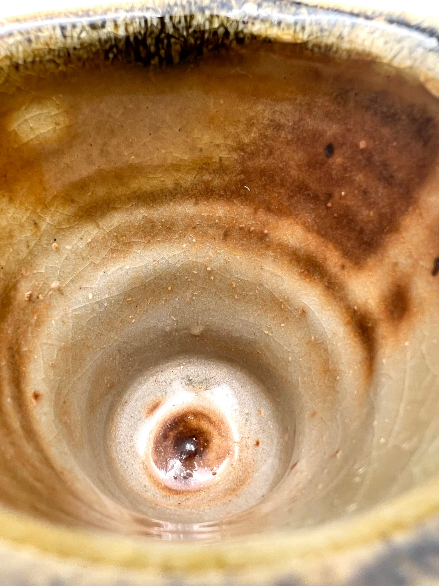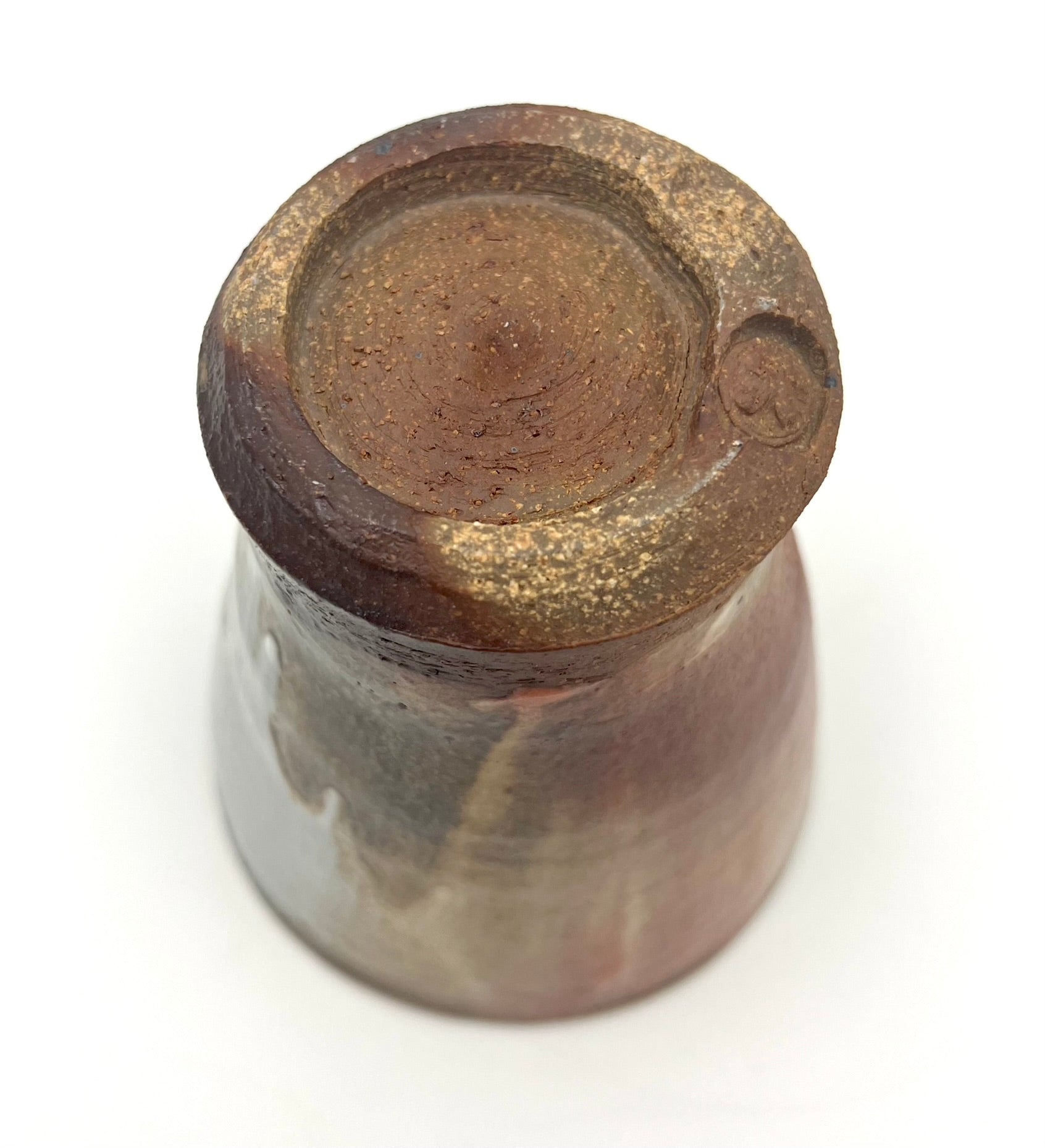 I threw this small tumbler on the potters wheel of a mix between Little John and Helmar clay from 1999. It was slipped in a couple layers of FC Ball slip. It is lined with Penn State Shino with 10% rutile. It was fired in a wood/soda kiln for 30+ hours. It measures 4-3/8 inches tall and holds 12 oz.