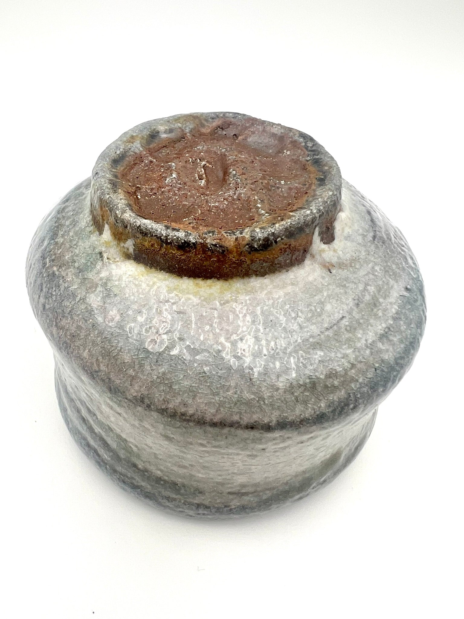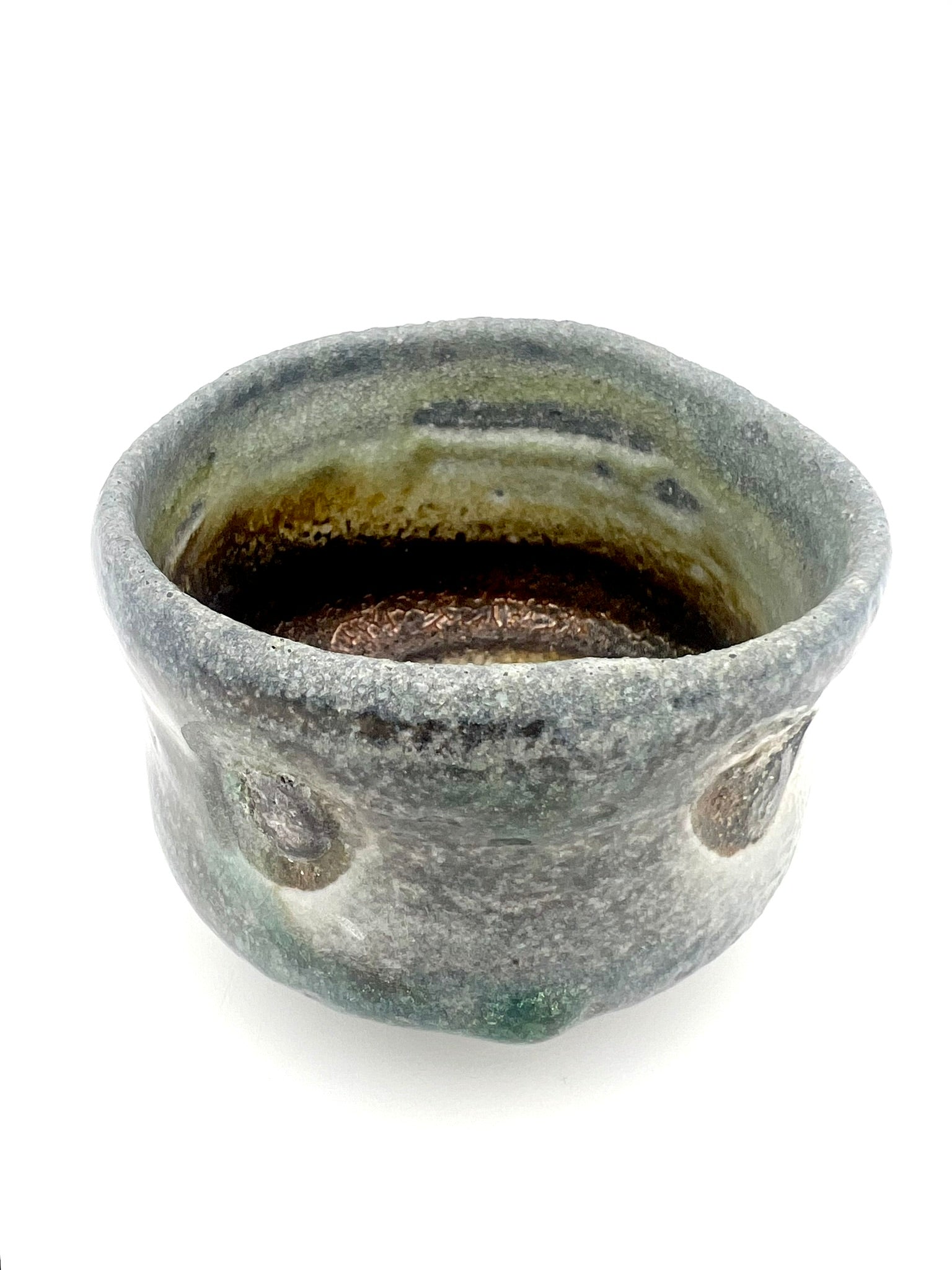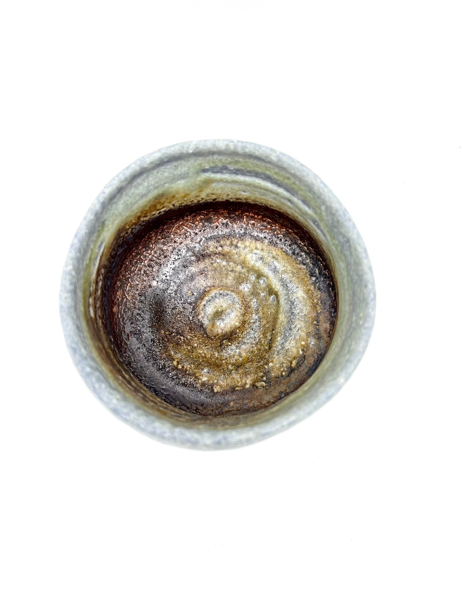 This Tea Bowl was wood/soda fired and reduction cooled with a little bit of water. It is EPK slip on iron laden clay. It was side fired on seashells.