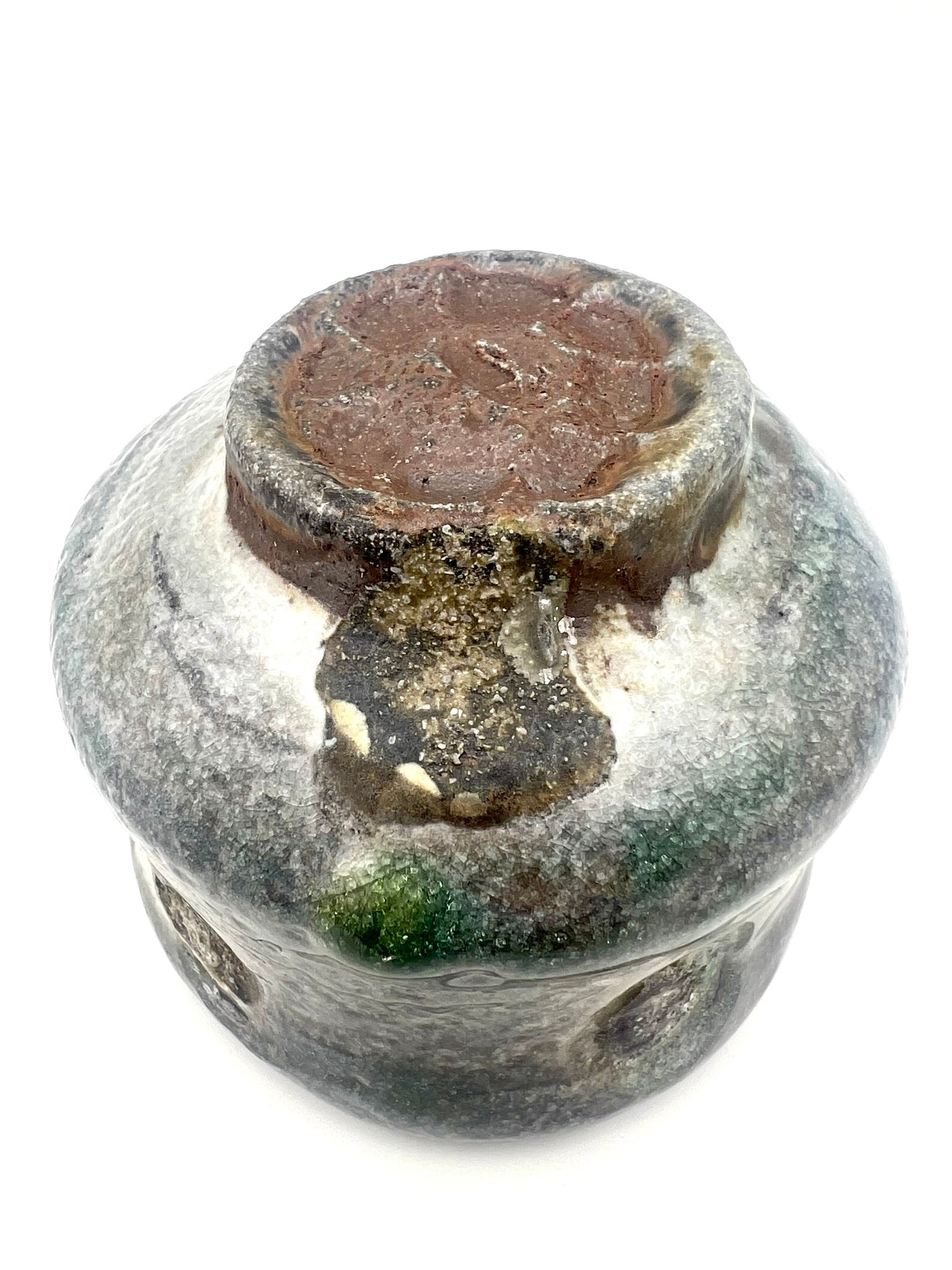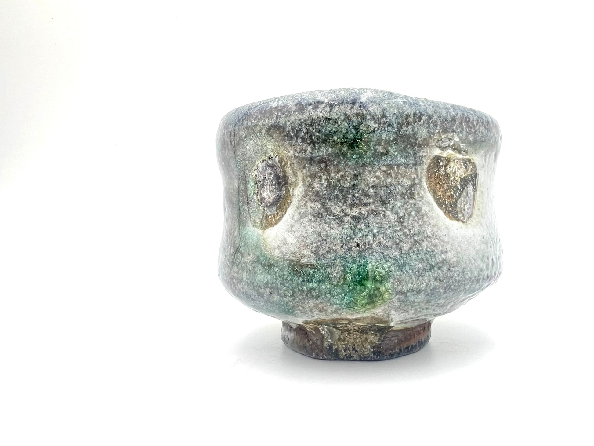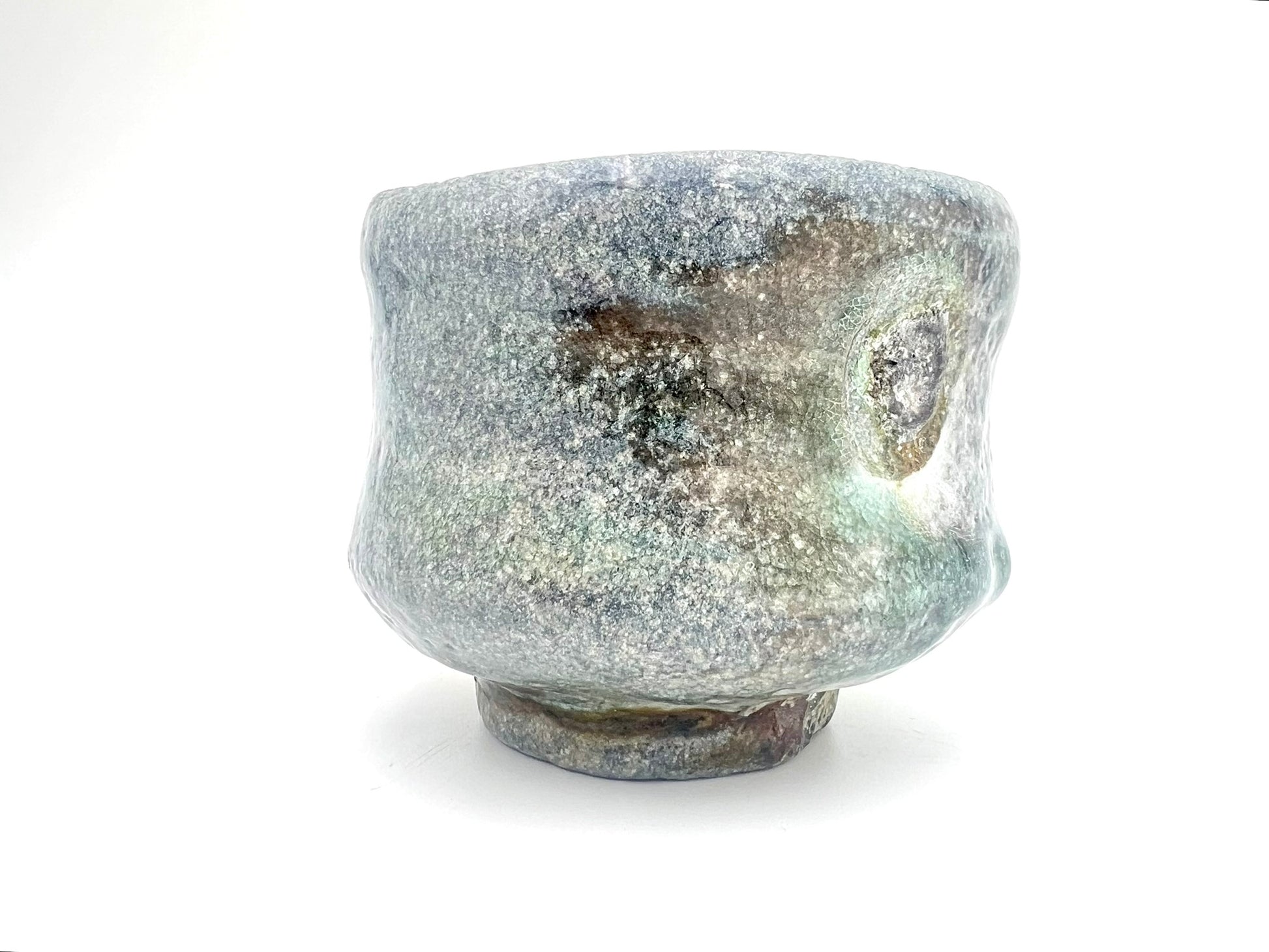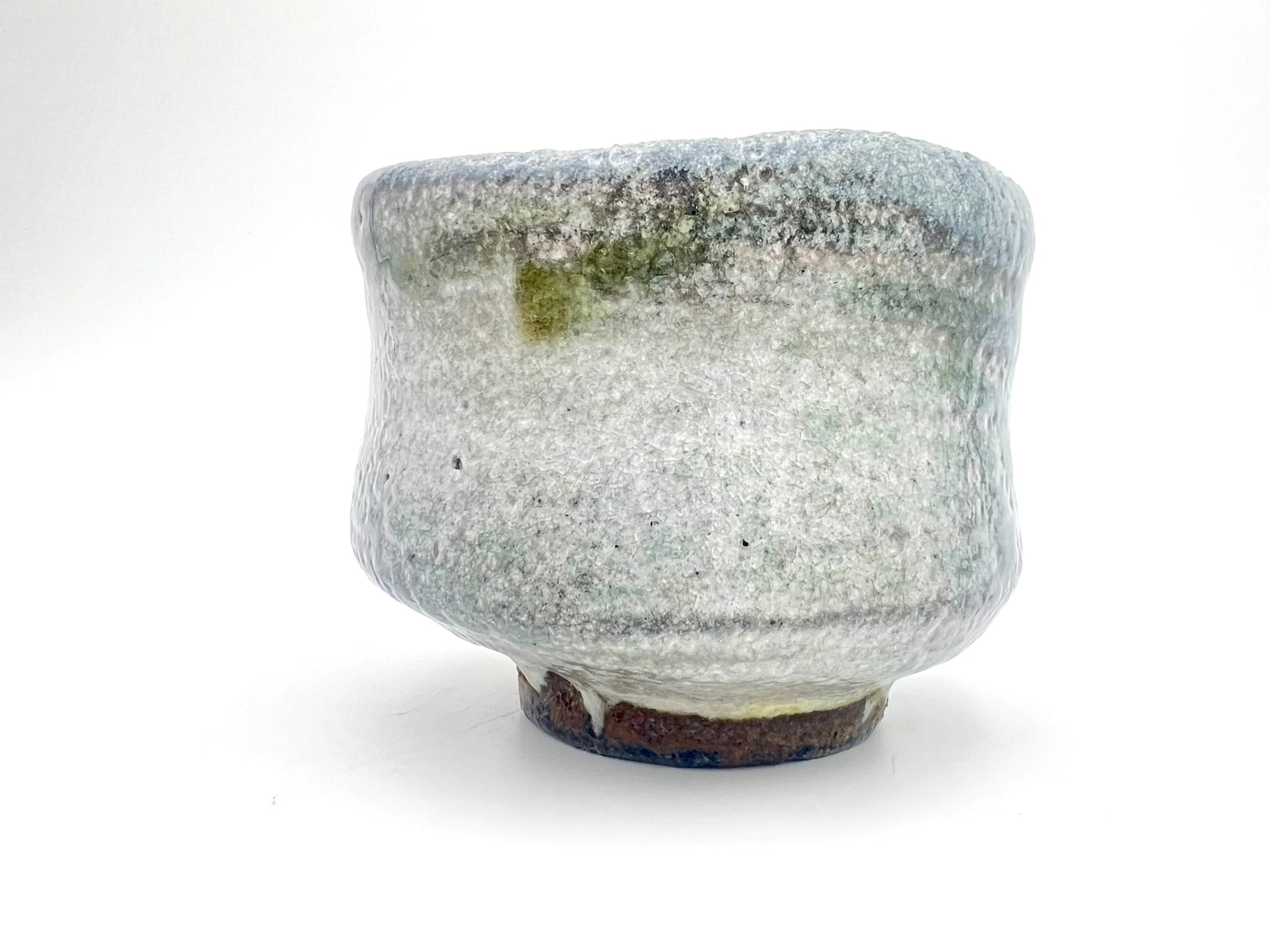 This Tea Bowl was wood/soda fired and reduction cooled with a little bit of water. It is EPK slip on iron laden clay. It was side fired on seashells.
