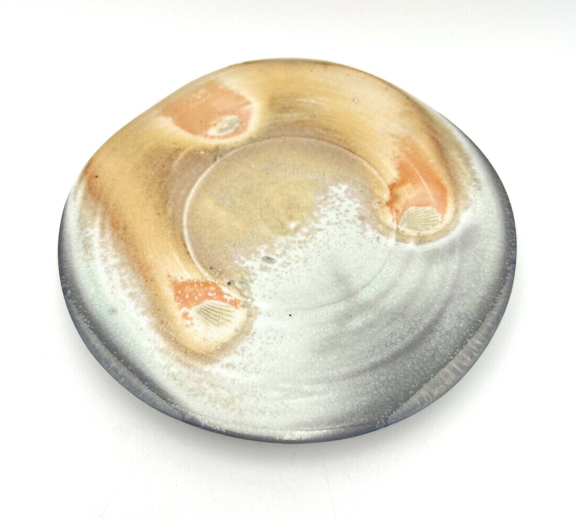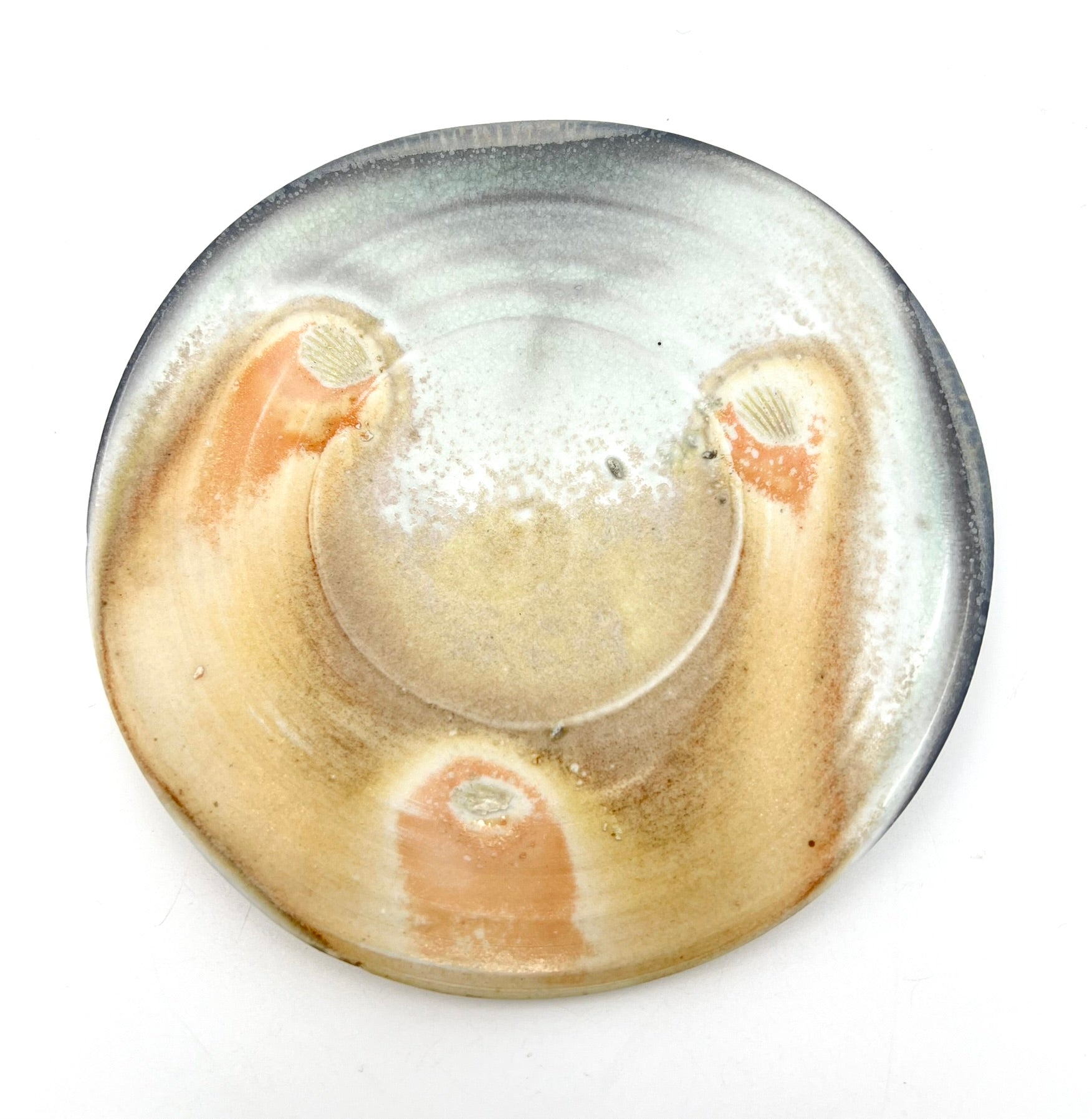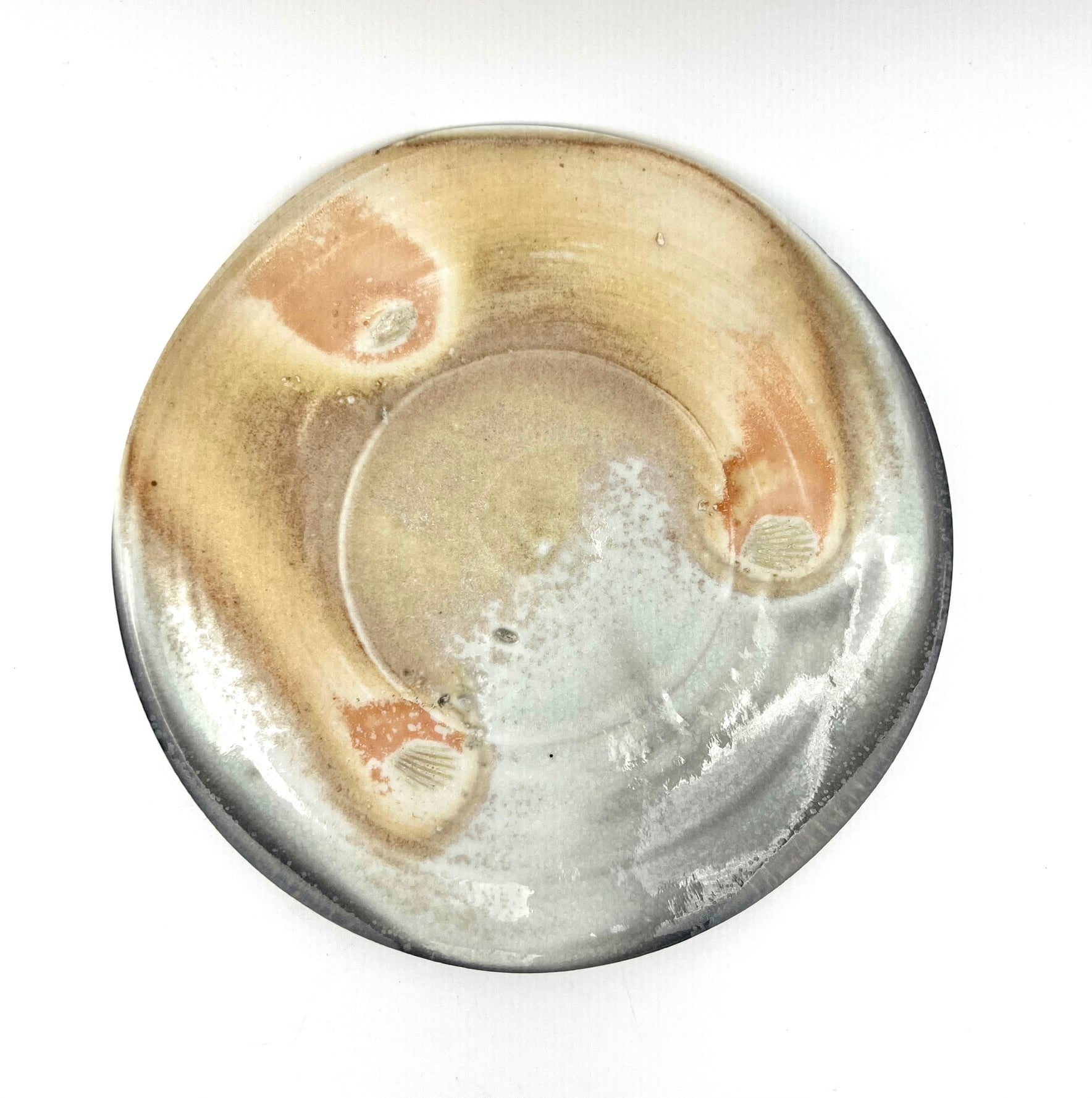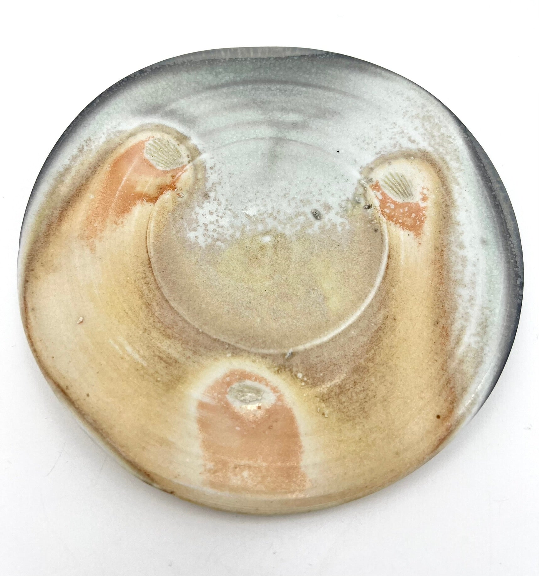 This plate was thrown and trimmed on the wheel of NZ clay. It was fired on shells in a stack of plates for days in an anagama kiln. It moved a bit during firing, and now is very playful. Note the carbon trapping and speckled flashing about the wads. The plate measures 6.5 inches wide.