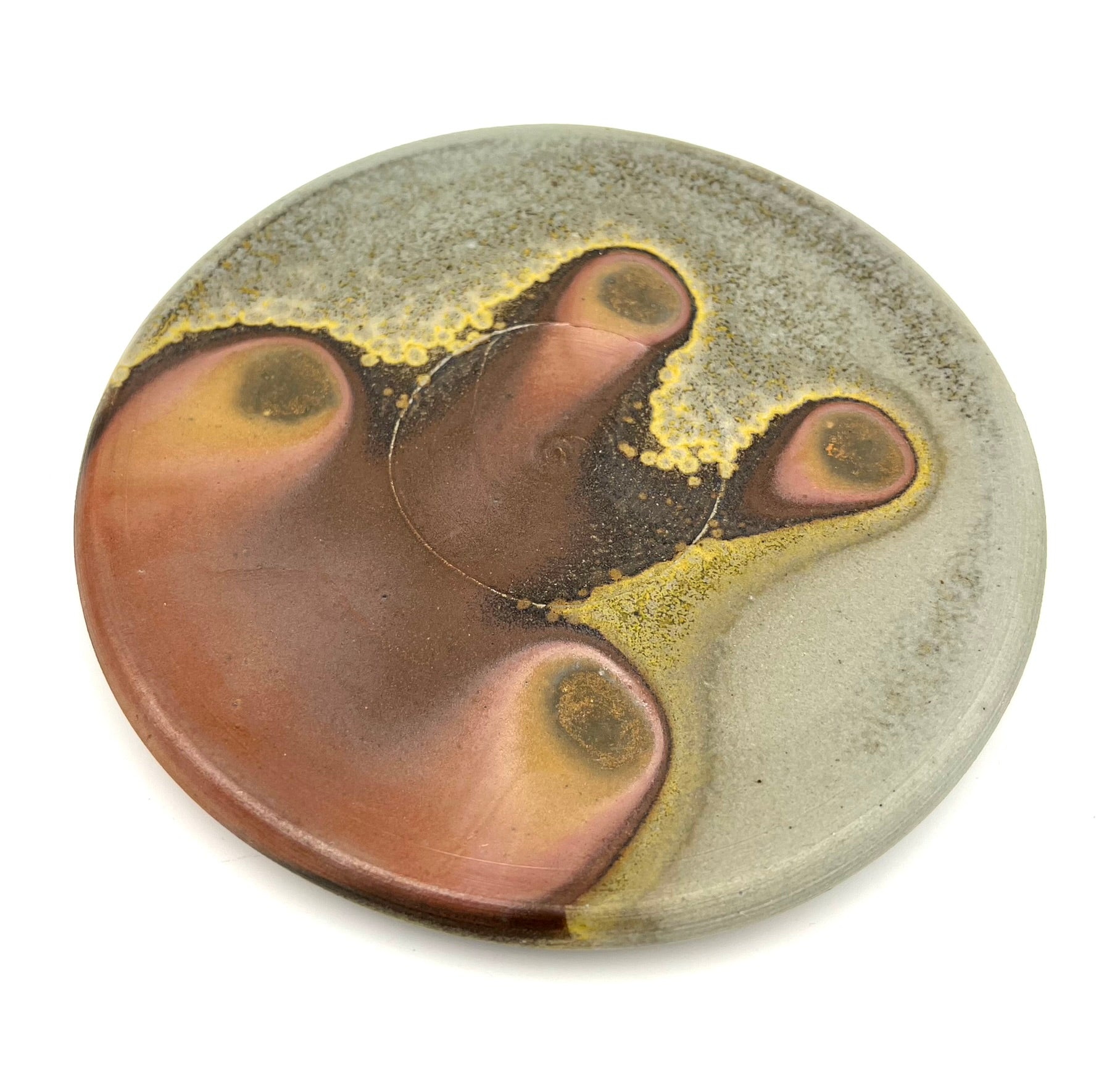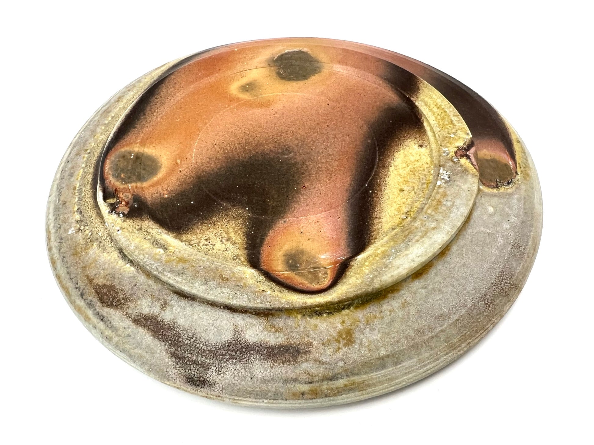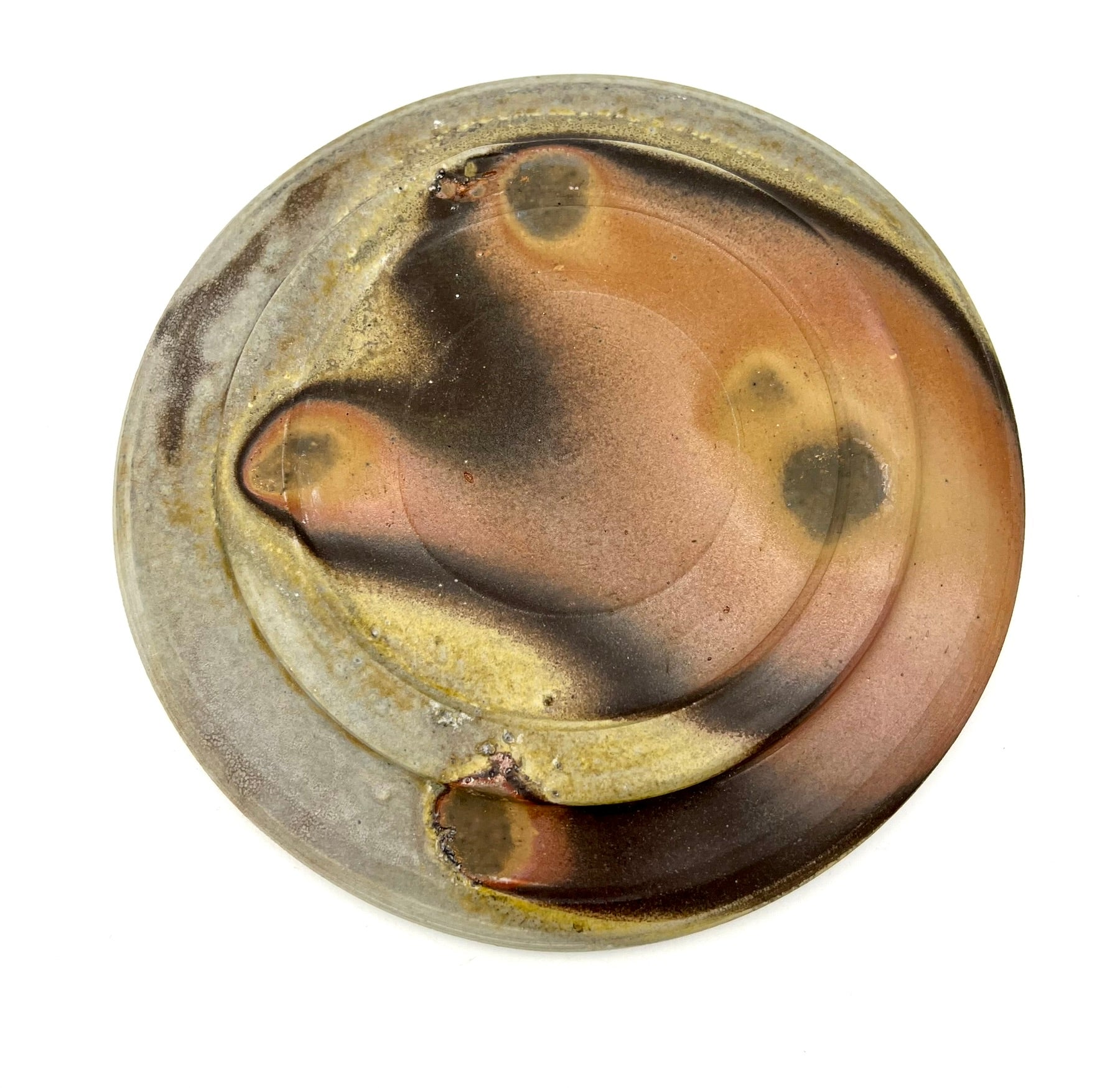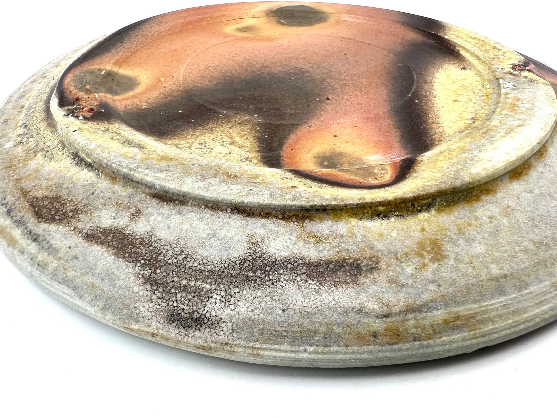 This plate was thrown and trimmed on the wheel of B-Mix clay. It was fired in a stack of plates for days in an anagama kiln. I really like the golden crystal border of ash right up to the darkest ring of flashing. The plate measures 7.5 inches wide.