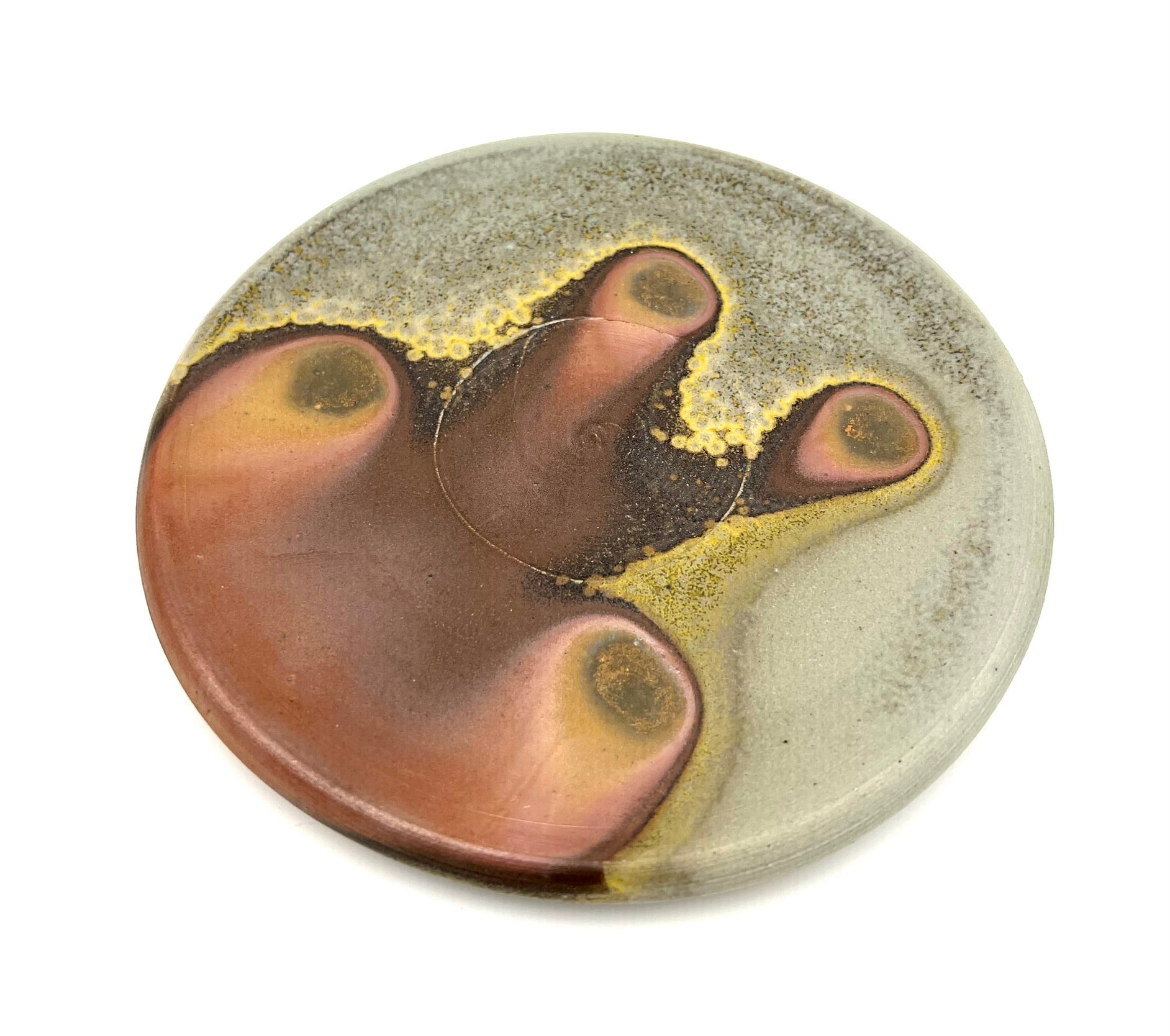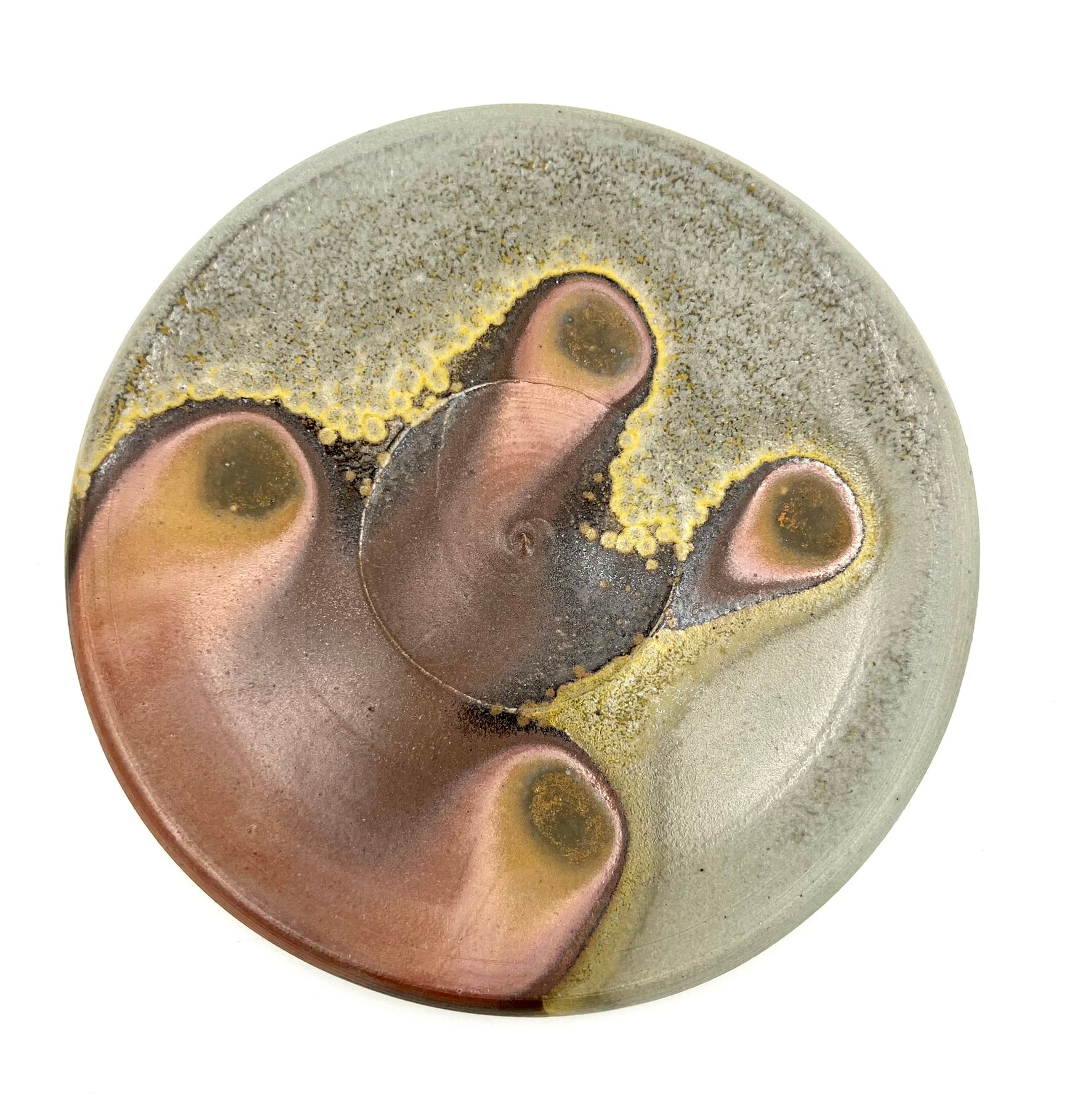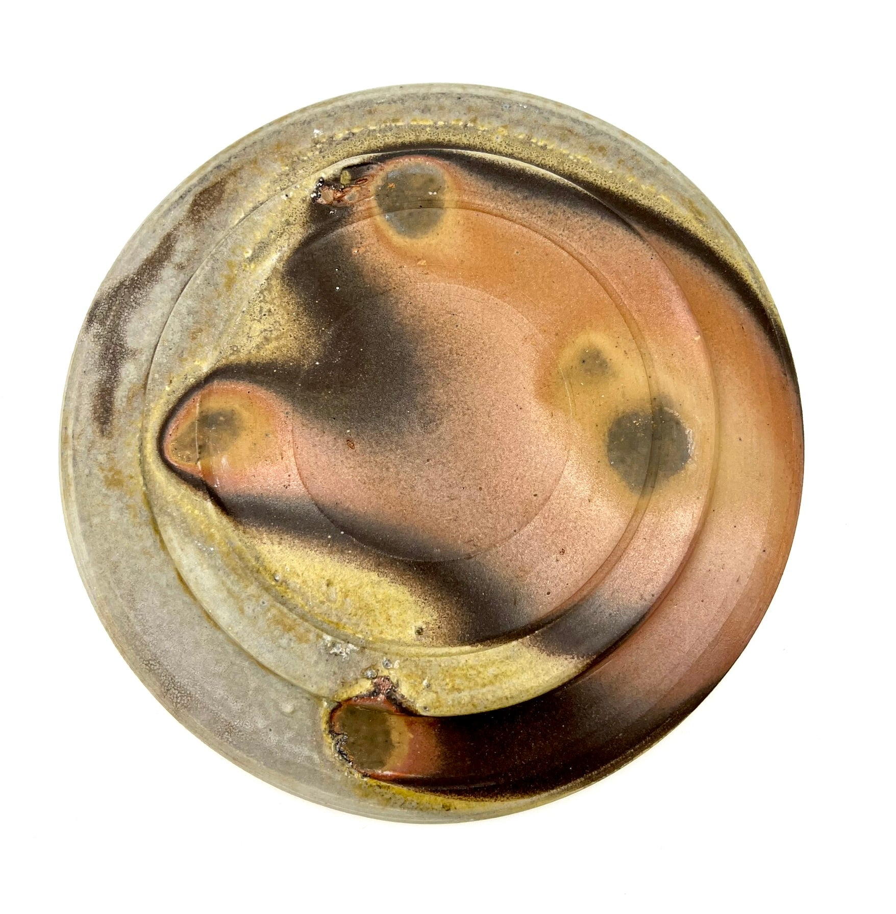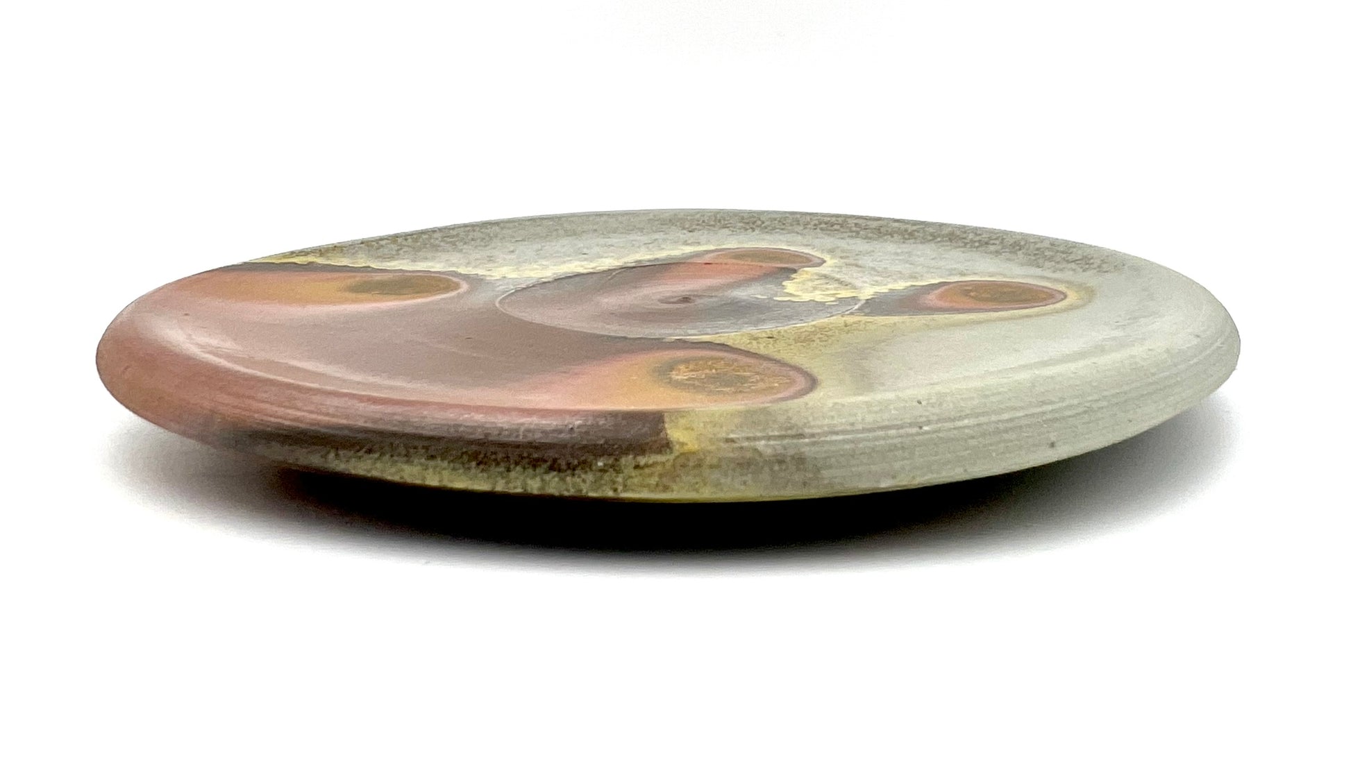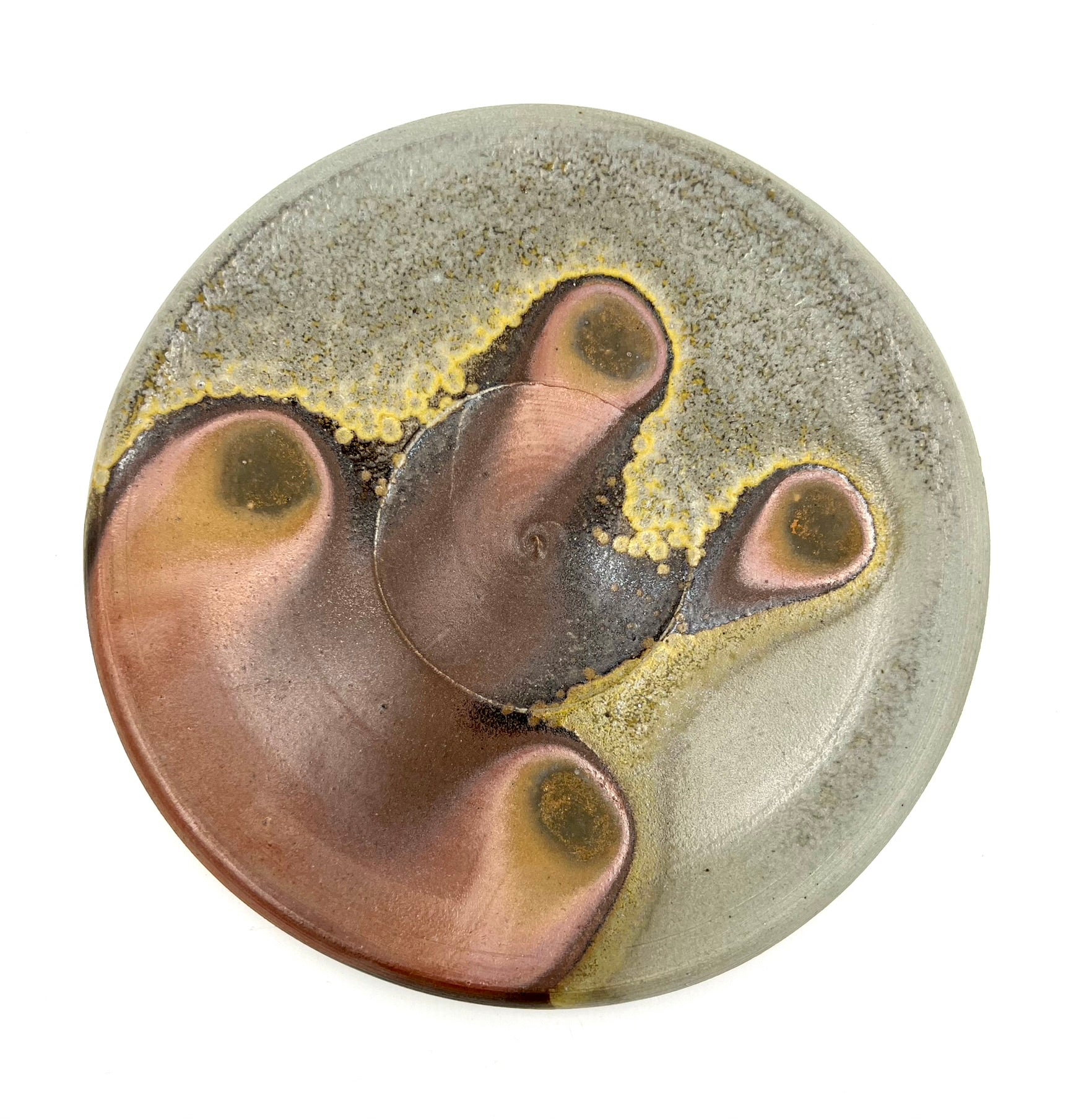 This plate was thrown and trimmed on the wheel of B-Mix clay. It was fired in a stack of plates for days in an anagama kiln. I really like the golden crystal border of ash right up to the darkest ring of flashing. The plate measures 7.5 inches wide.