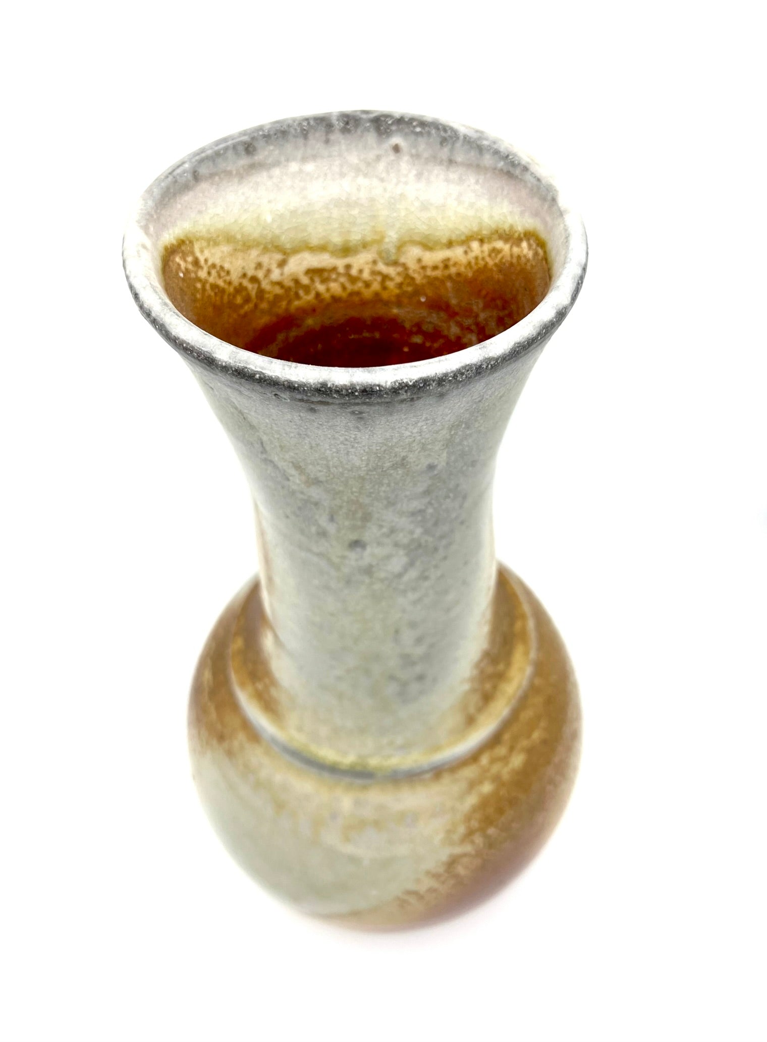 I threw this vase in 2 parts of a mixed porcelaneous stoneware. The joint is accentuated for the finished form, and to excite the surface. It was fired for 30+ hours in a wood/soda kiln. There's not a bad side on this thing. It measures 15 inches tall, and 7 at the widest.