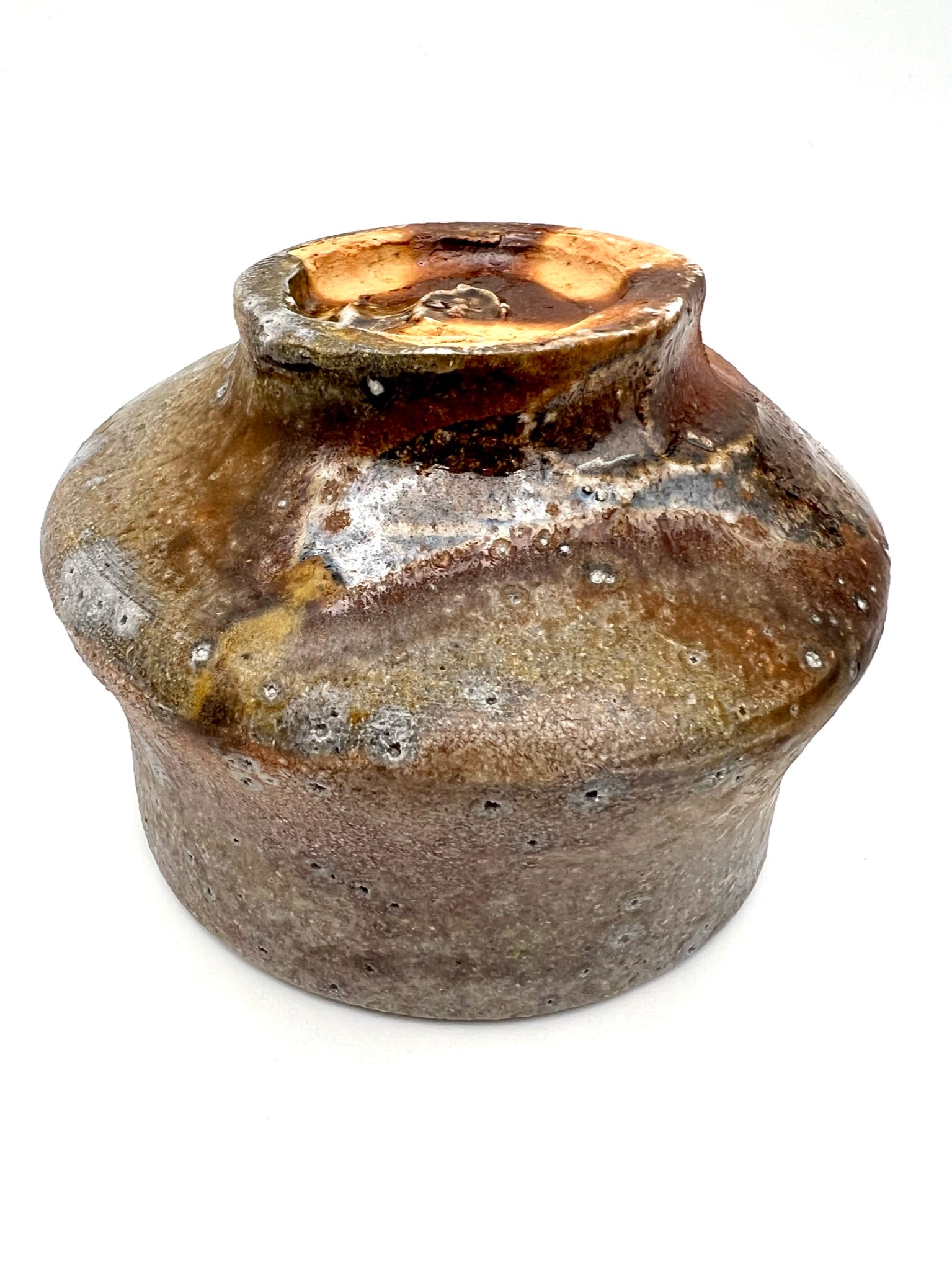 This cup was thrown and altered on the potters wheel. It is made of Welmar clay with molochite and 30 mesh silica sand wedged in. It was fired for 120 hours in an anagama. The cup measures 4.5 inches wide by 3.5 inches tall.